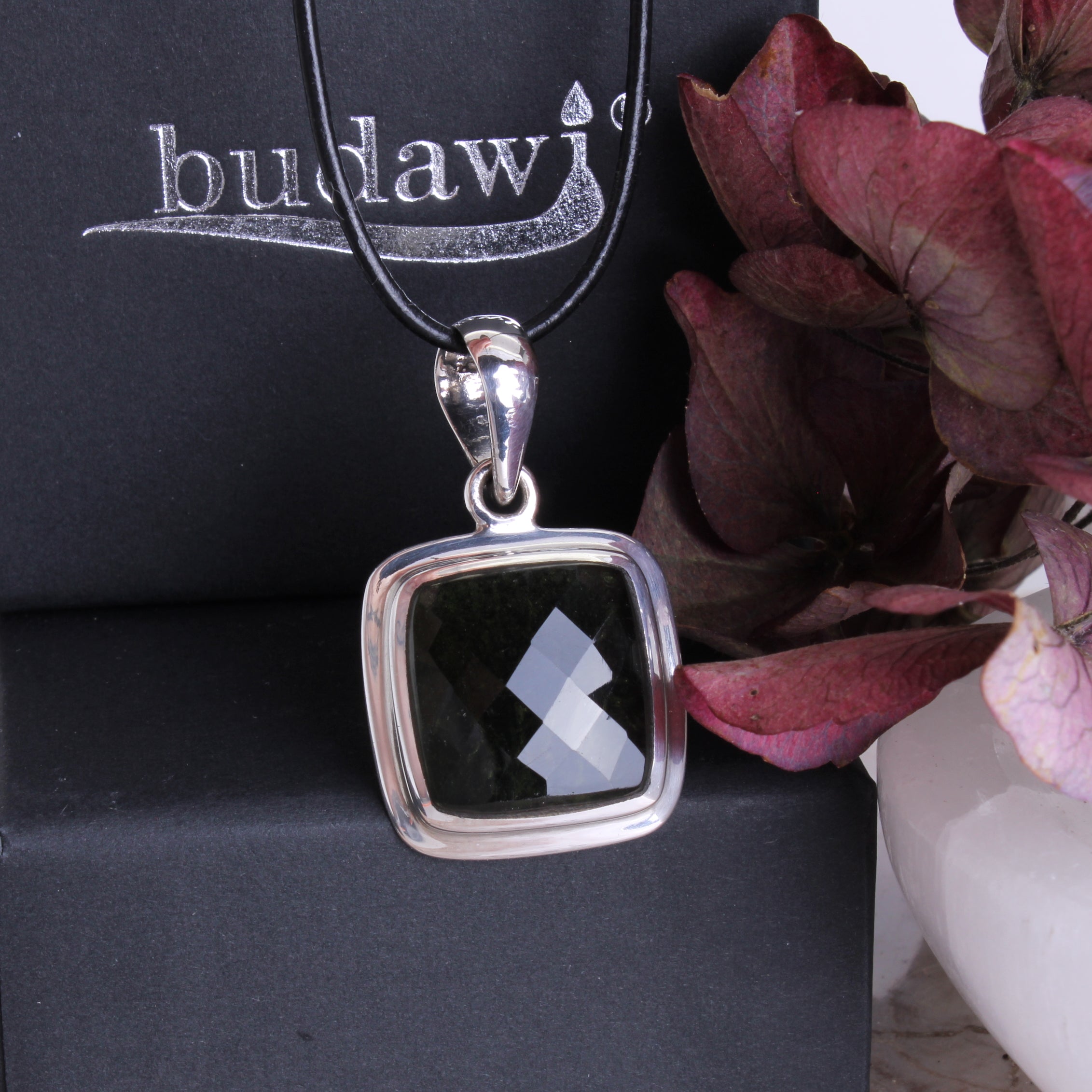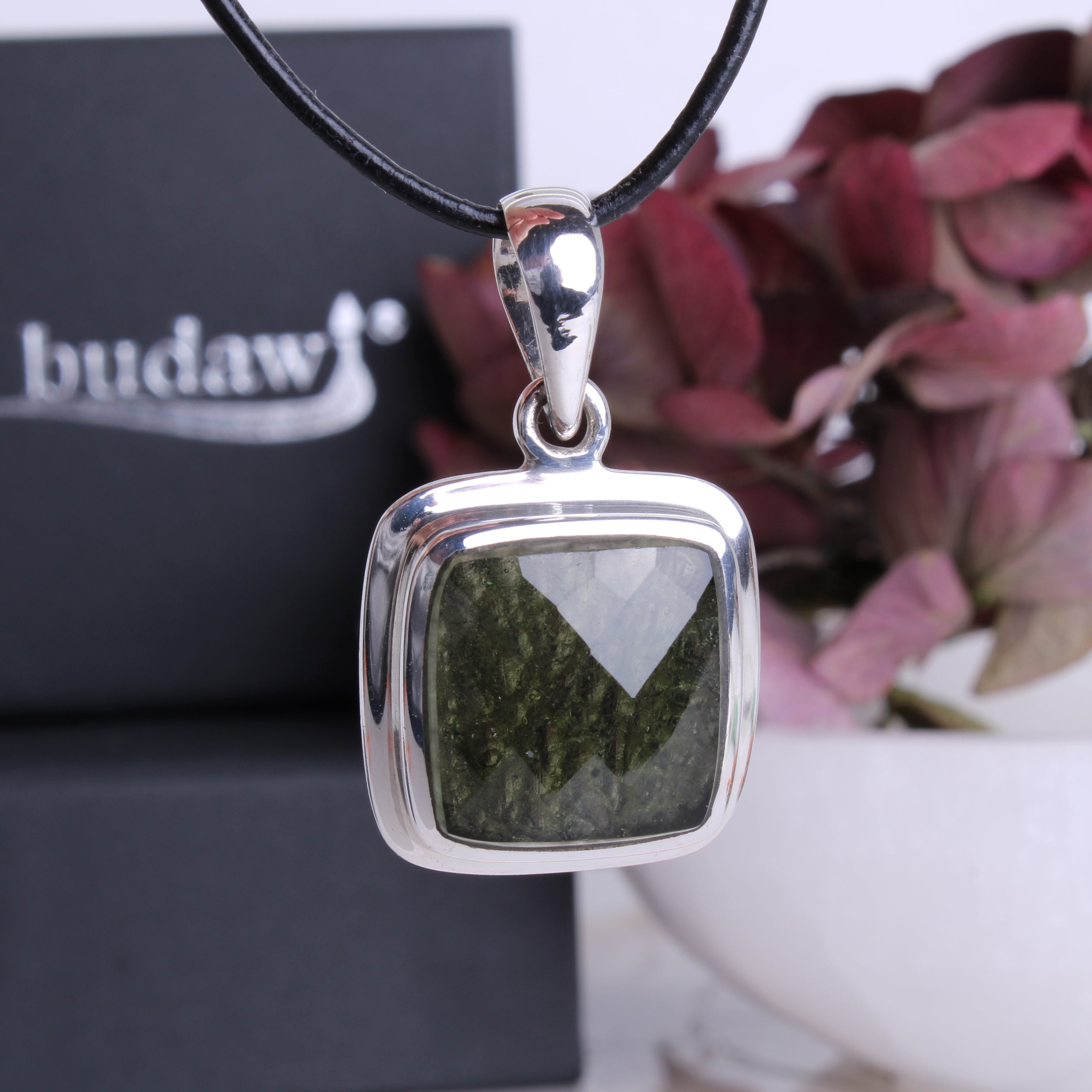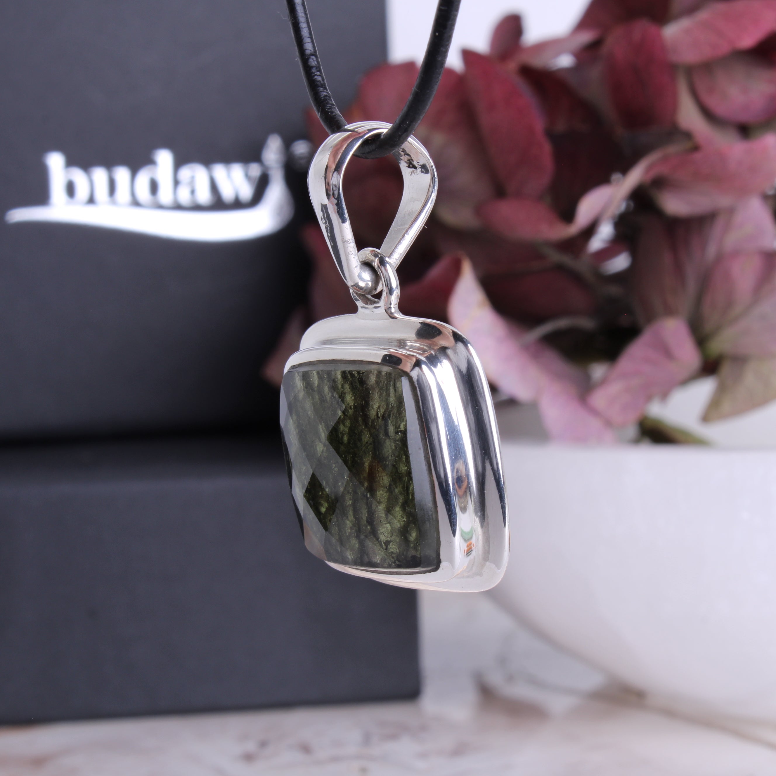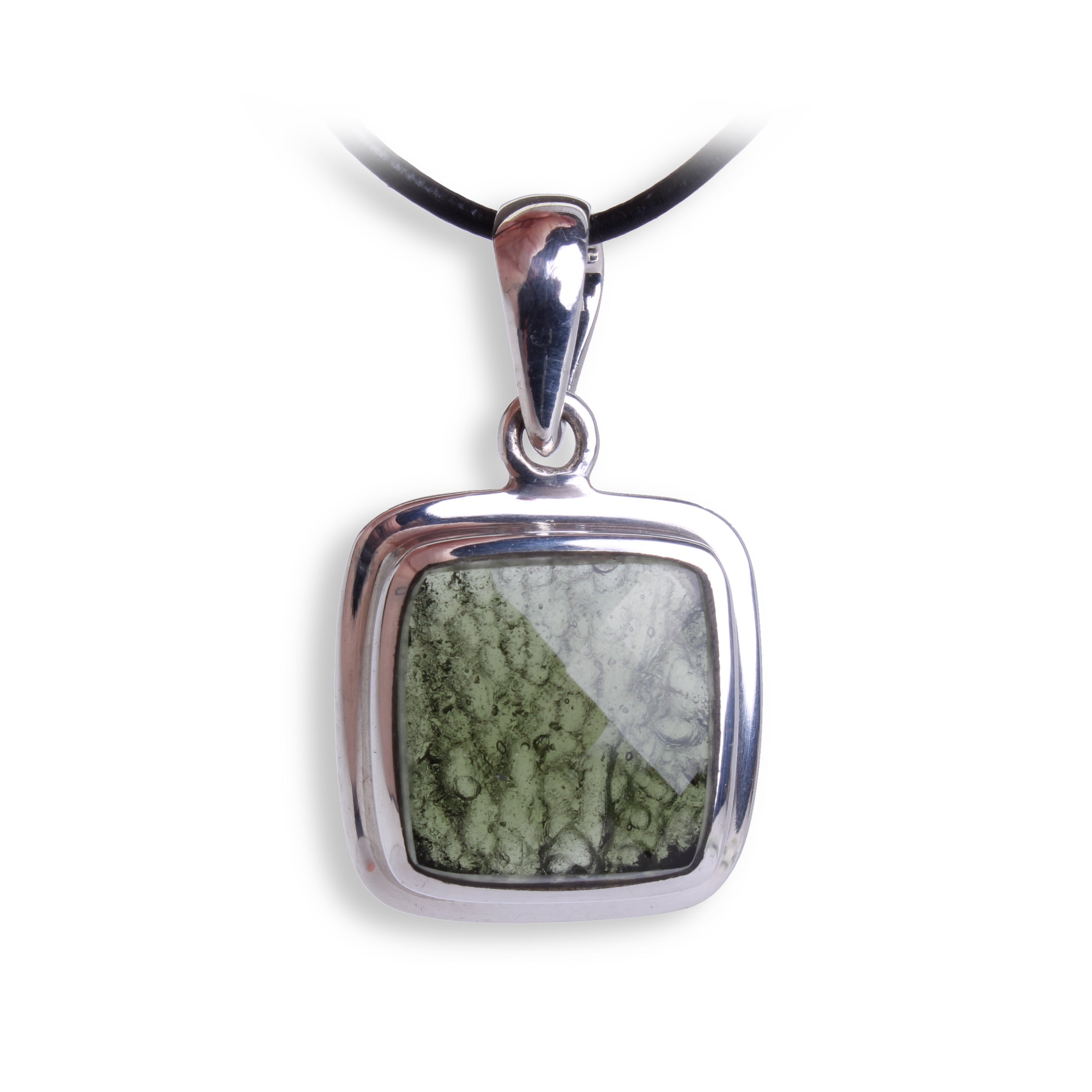 Moldavit Anhänger facettiert Unikat mit Fassung und Öse aus 925er Sterling Silber inklusive Lederband 1 m und Geschenkschachtel echter Edelstein Schmuck