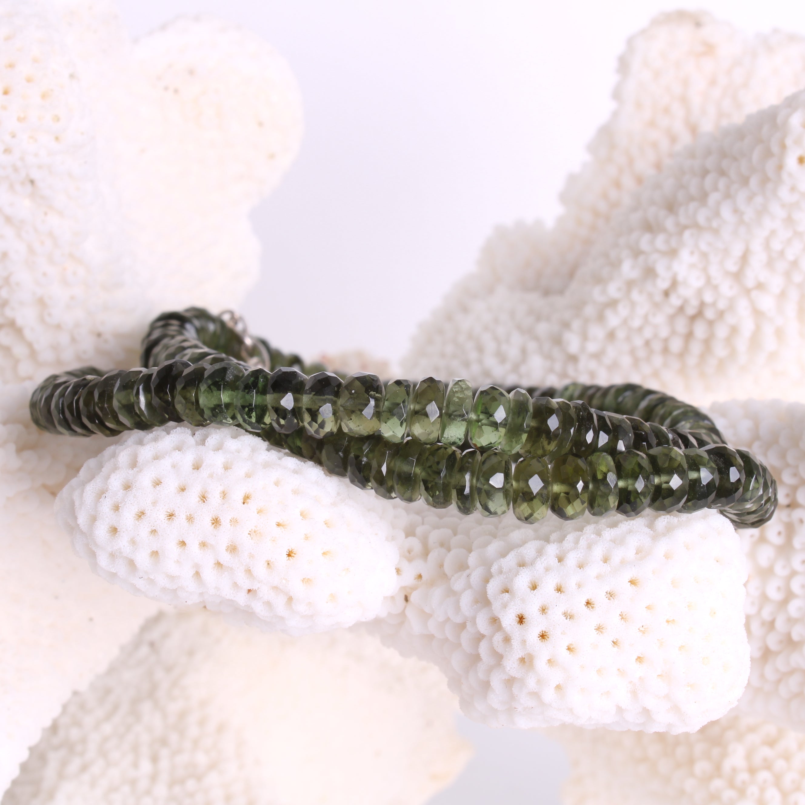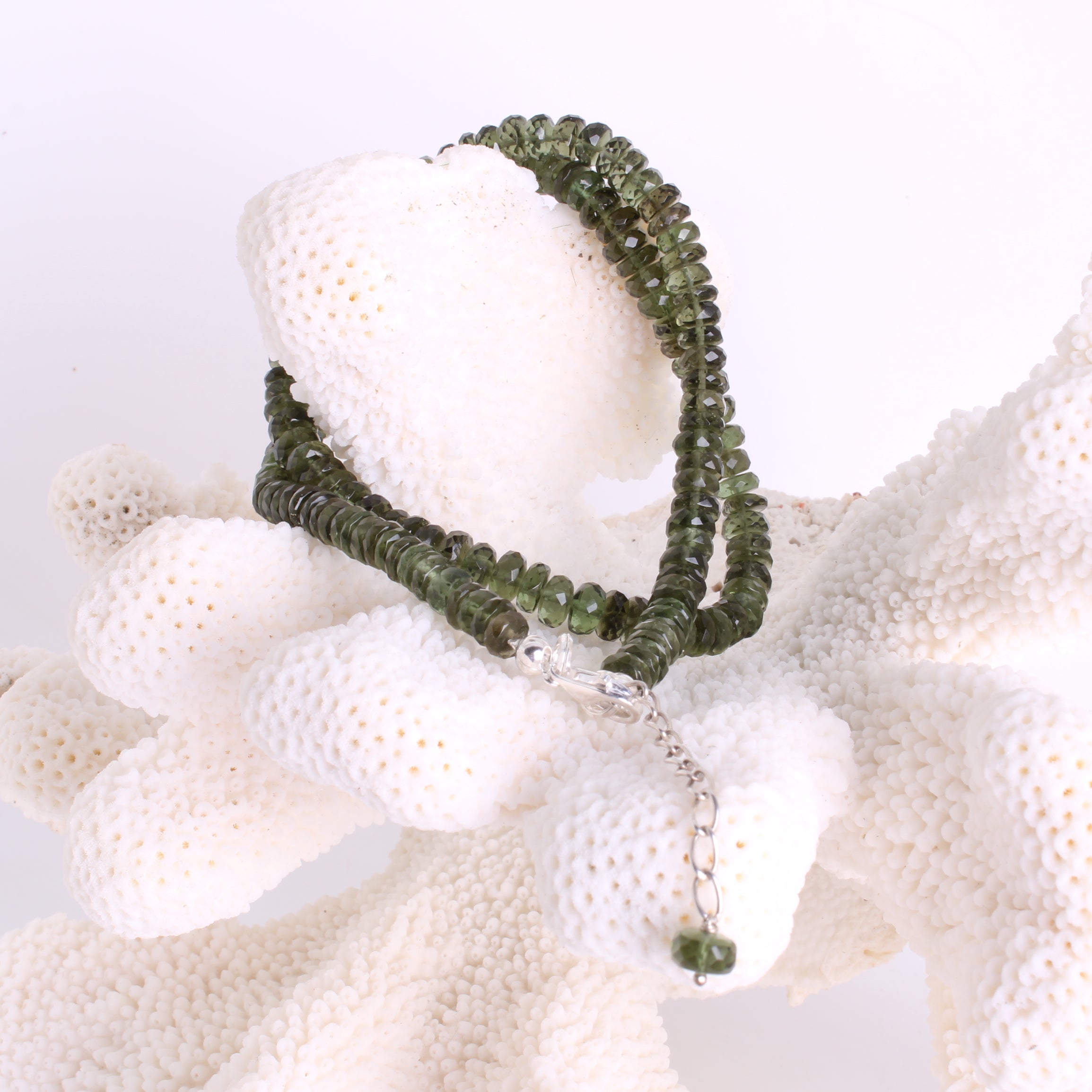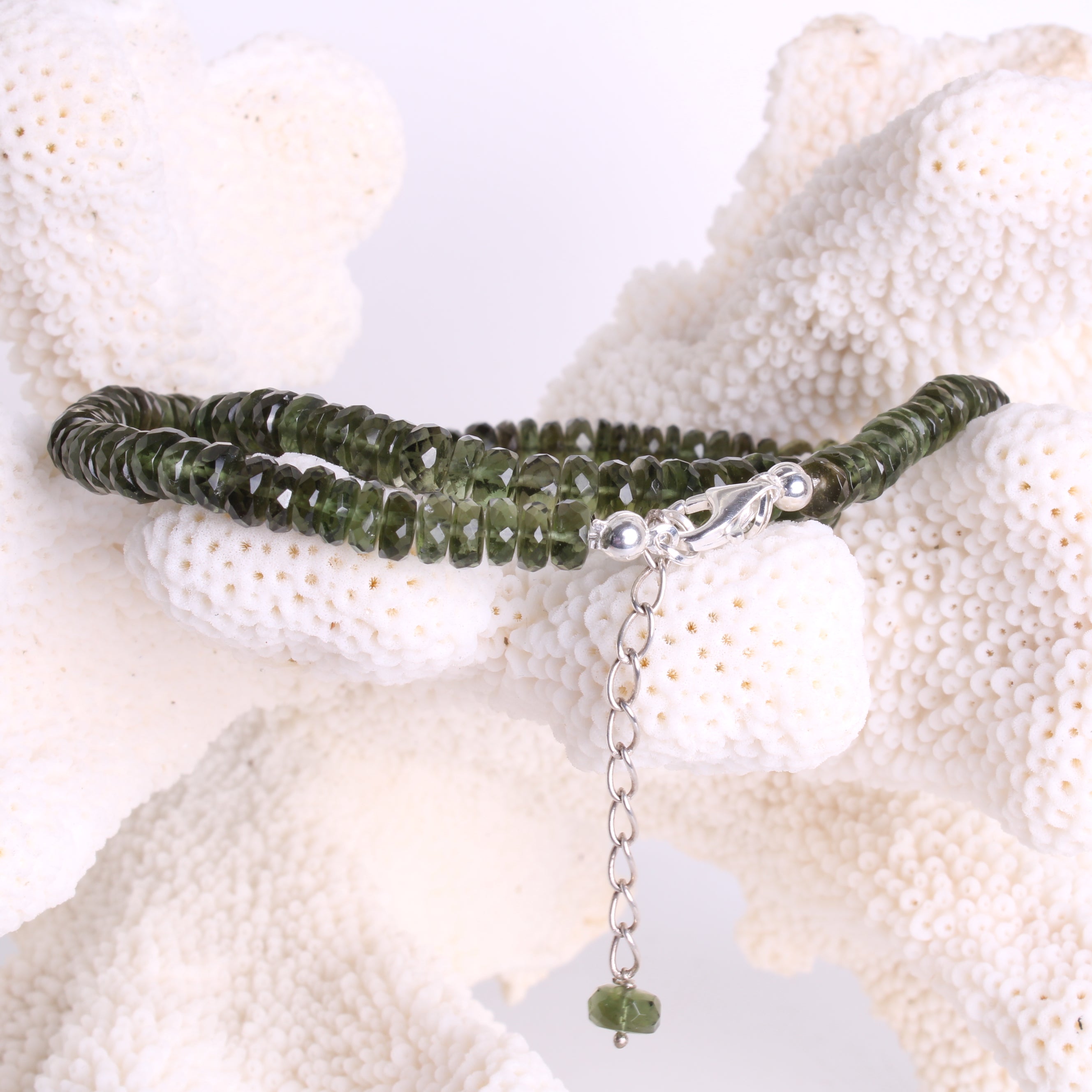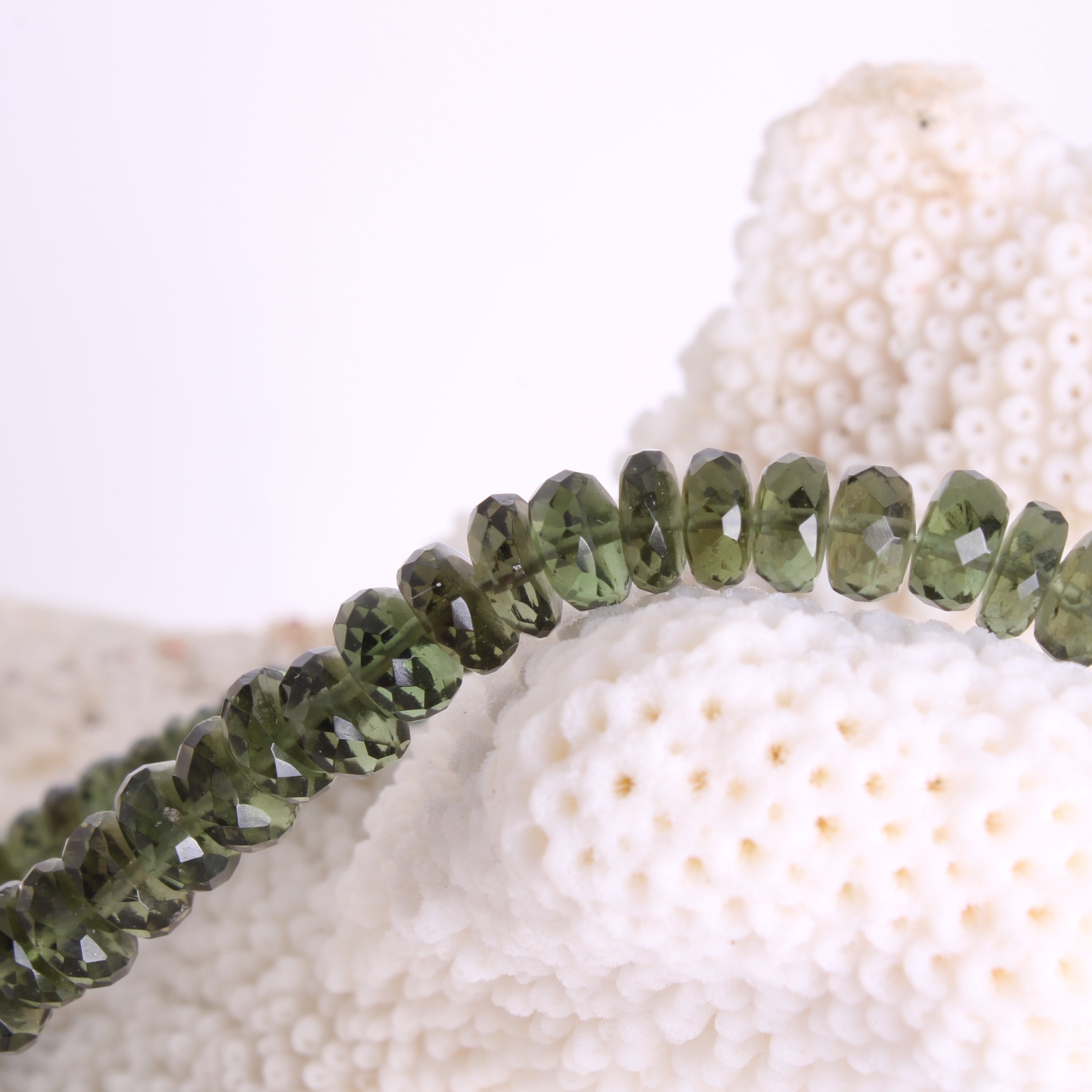 Diese exquisite Moldavit Kette verbindet die rohe Schönheit eines echten Natursteins mit feiner Handwerkskunst. Jede Perle besteht aus facettiertem Moldavit, einem seltenen Edelstein, der durch den Einschlag eines Meteoriten vor etwa 15 Millionen Jahren in Südböhmen (Tschechien) entstand.