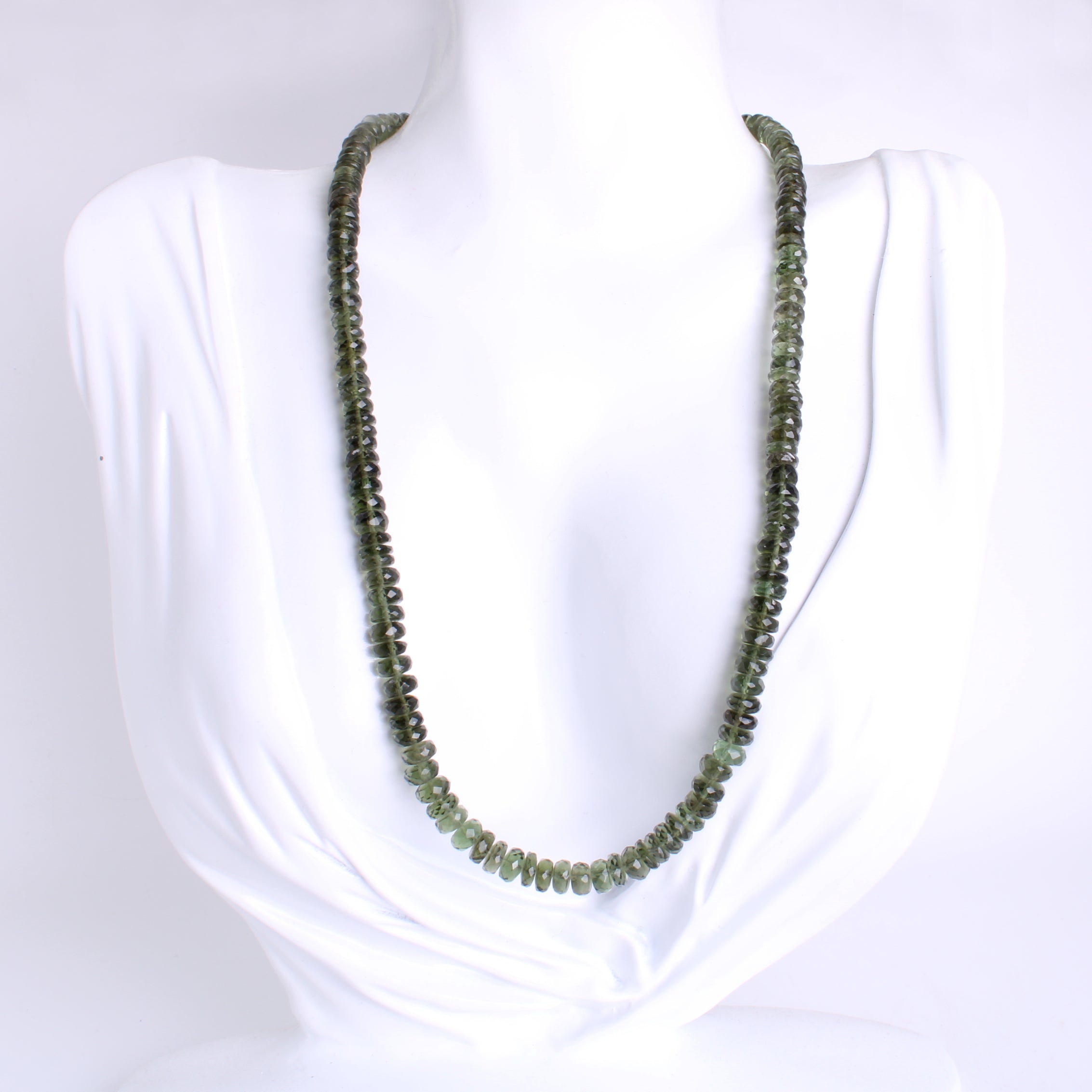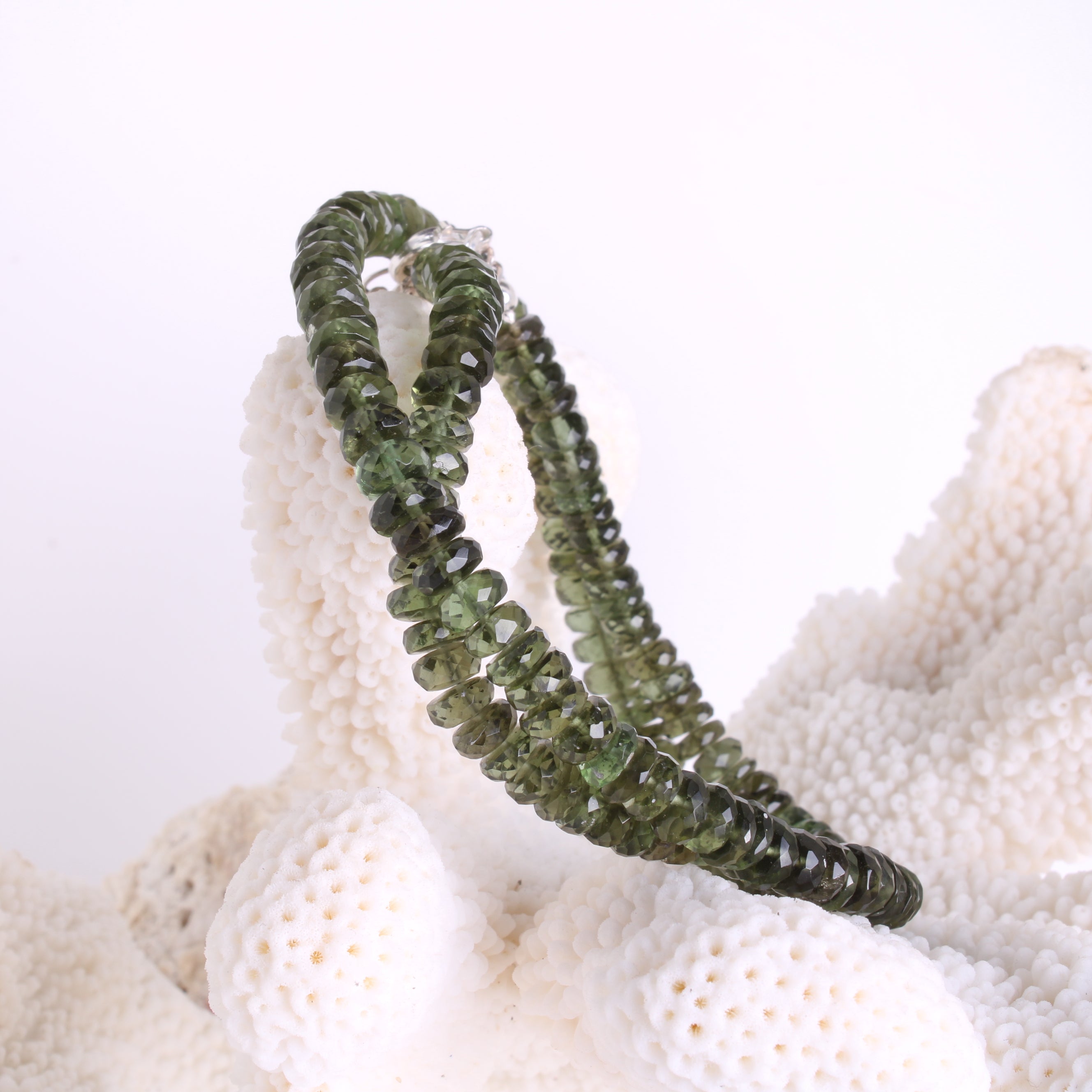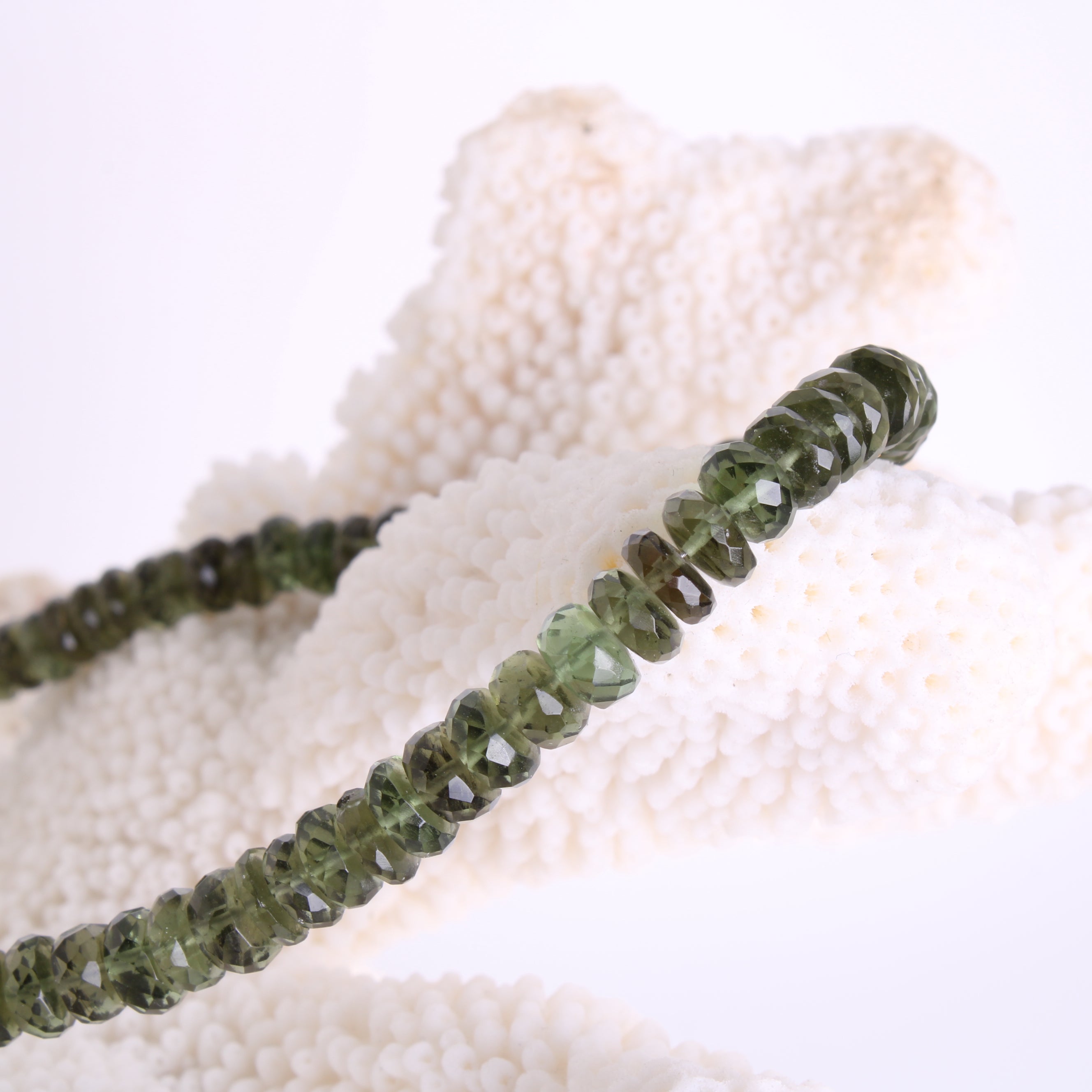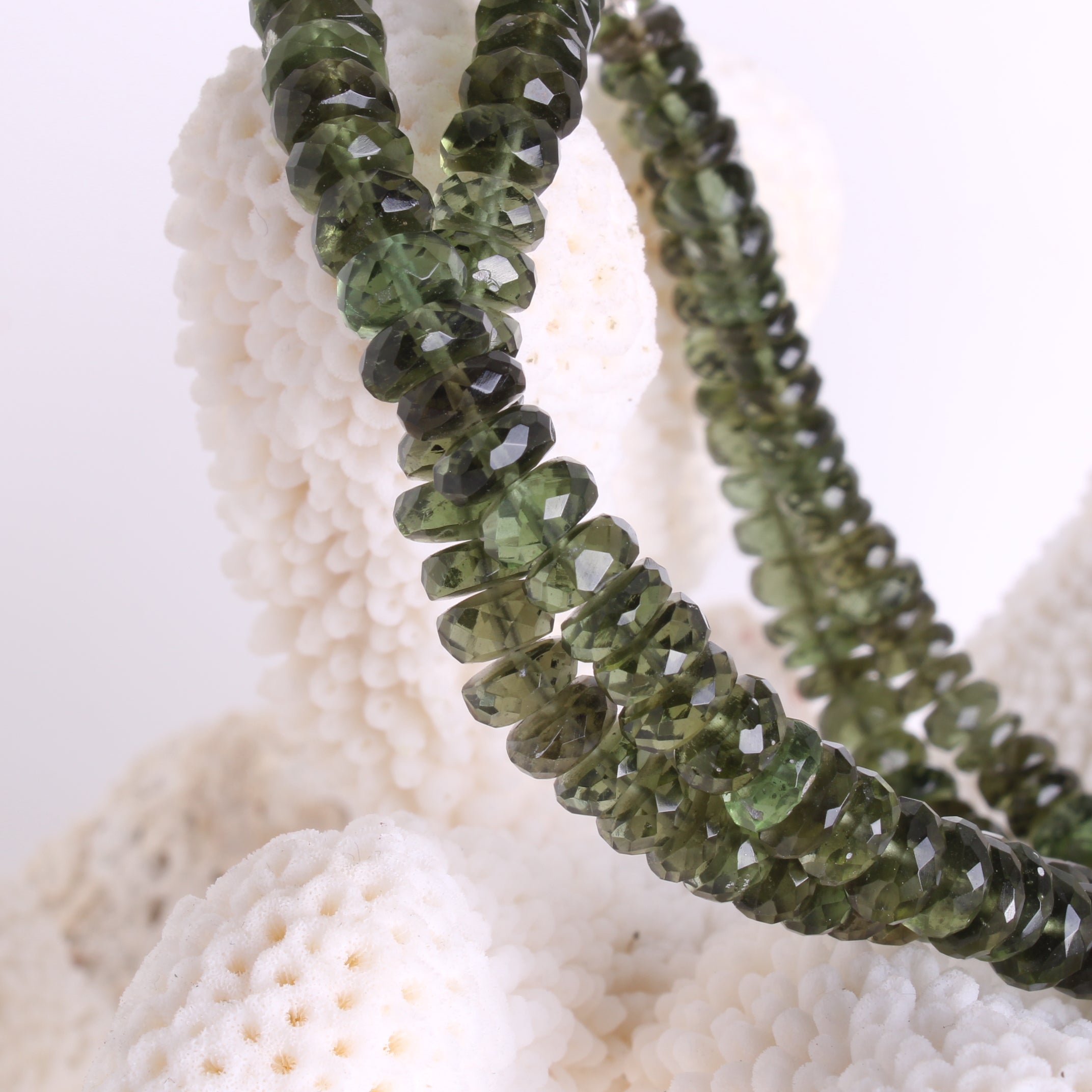 Diese exquisite Moldavit Kette verbindet die rohe Schönheit eines echten Natursteins mit feiner Handwerkskunst. Jede Perle besteht aus facettiertem Moldavit, einem seltenen Edelstein, der durch den Einschlag eines Meteoriten vor etwa 15 Millionen Jahren in Südböhmen (Tschechien) entstand.