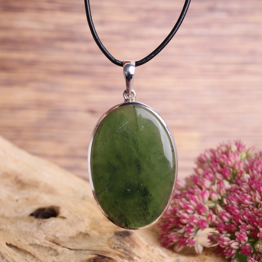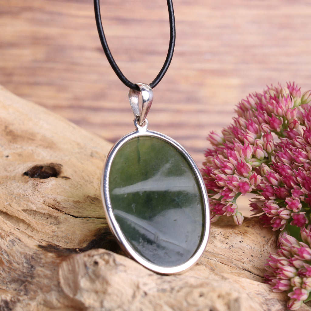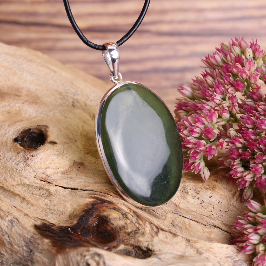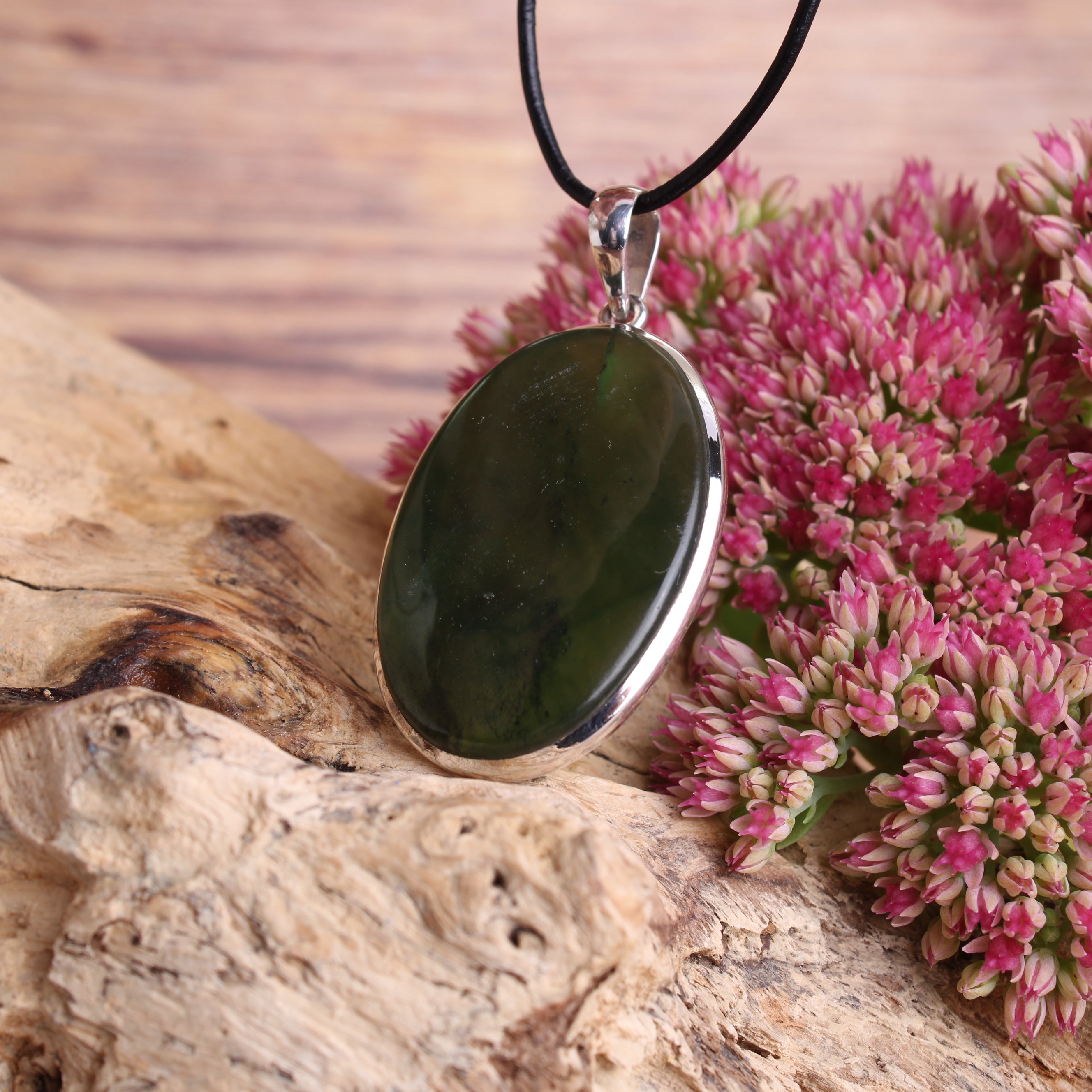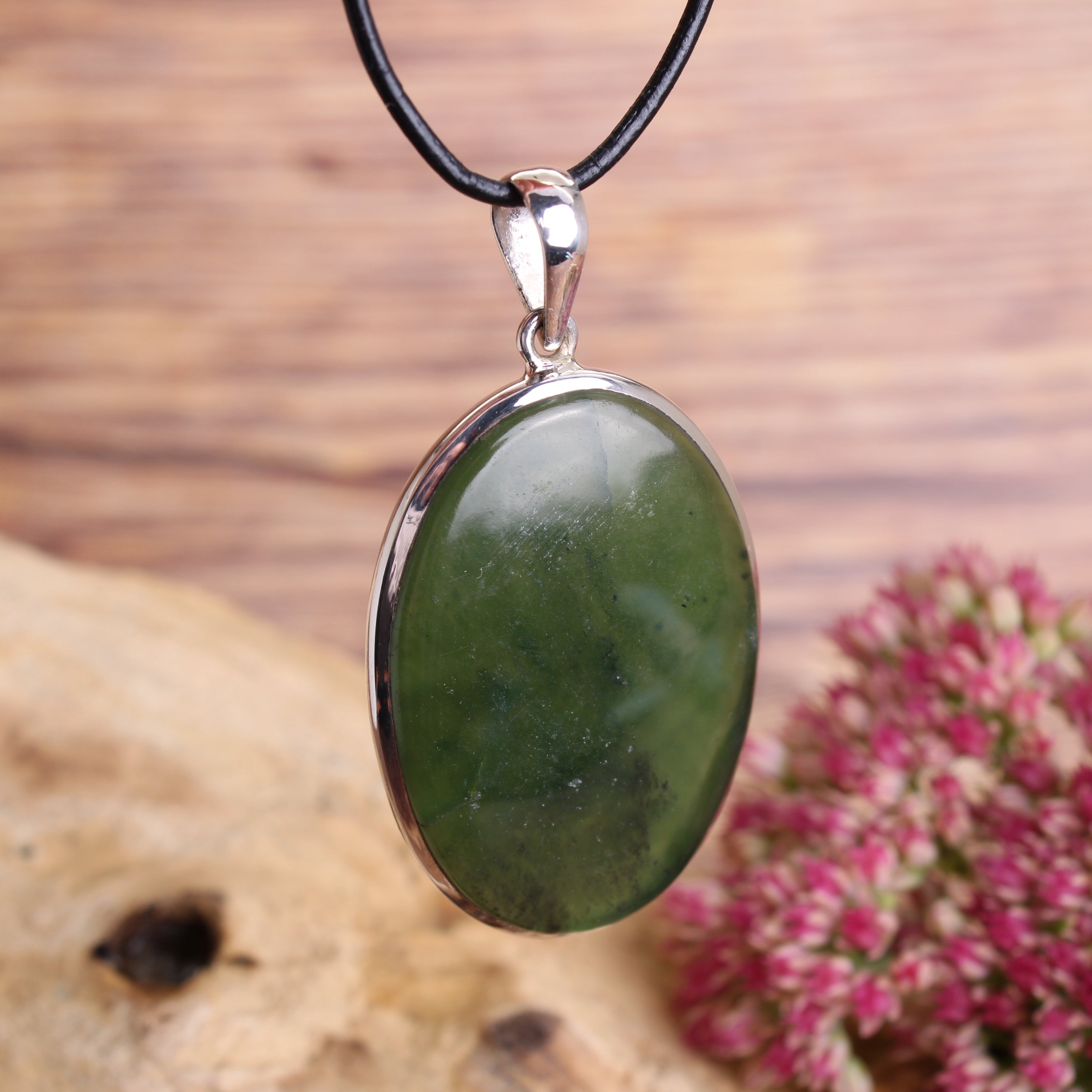 Nephrit Anhänger 925 Silber – edler Naturstein Schmuck – inkl. 1m Lederband zum Kürzen – in Geschenkbox – Heilstein & Glücksbringer
