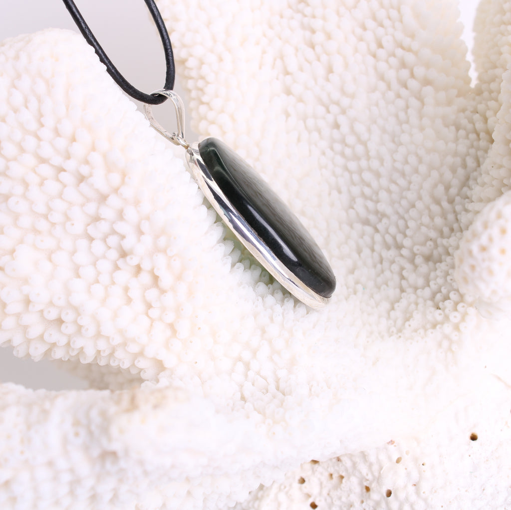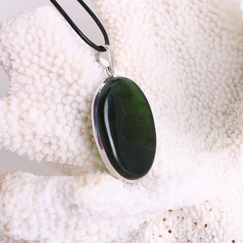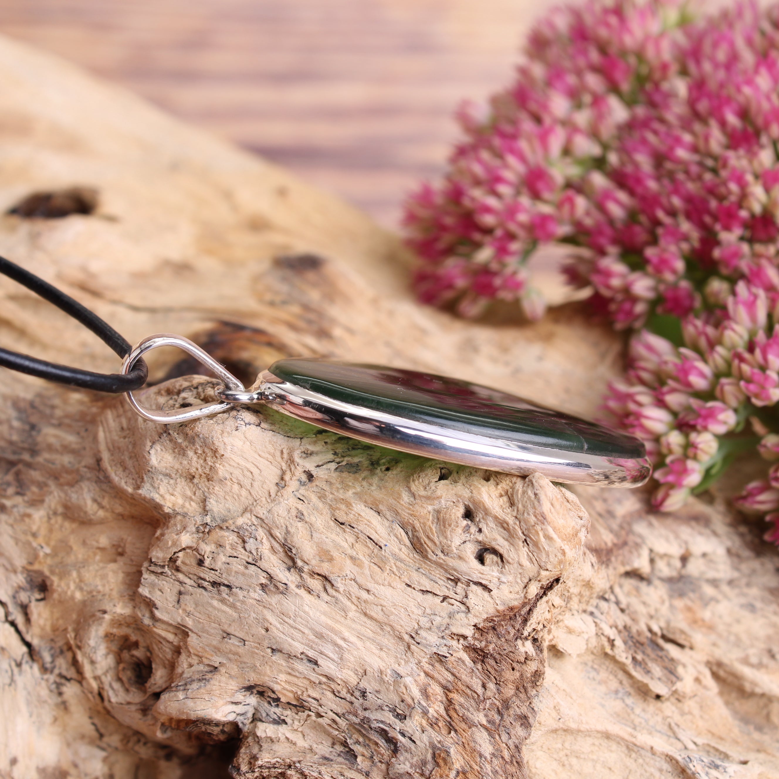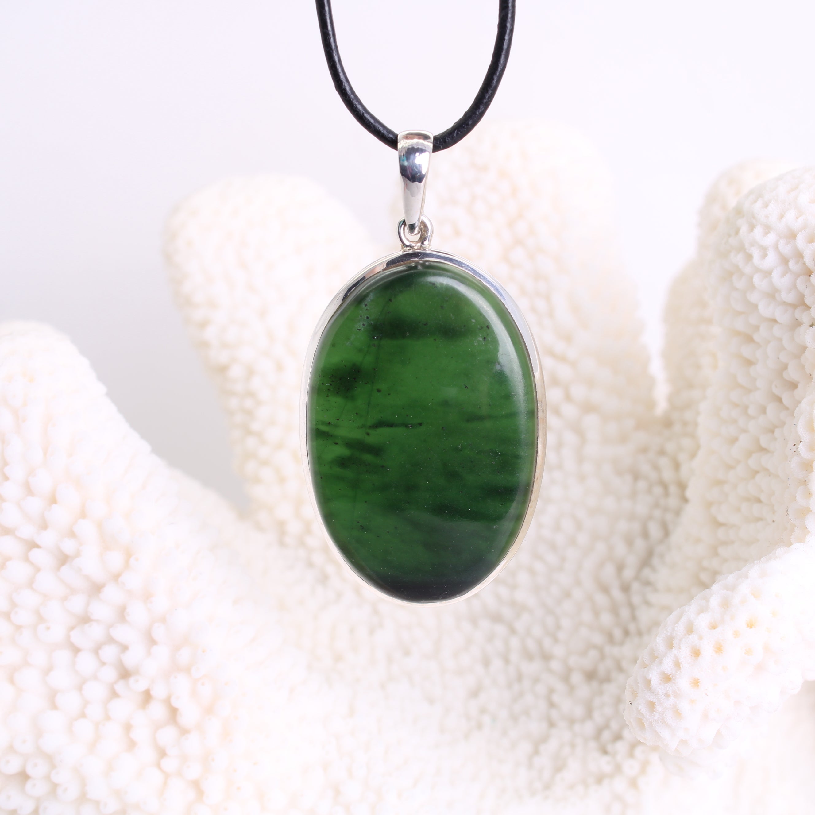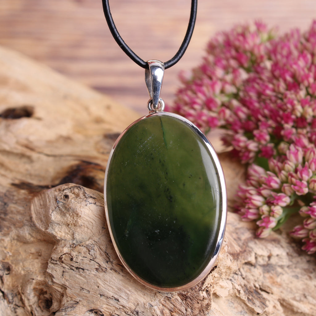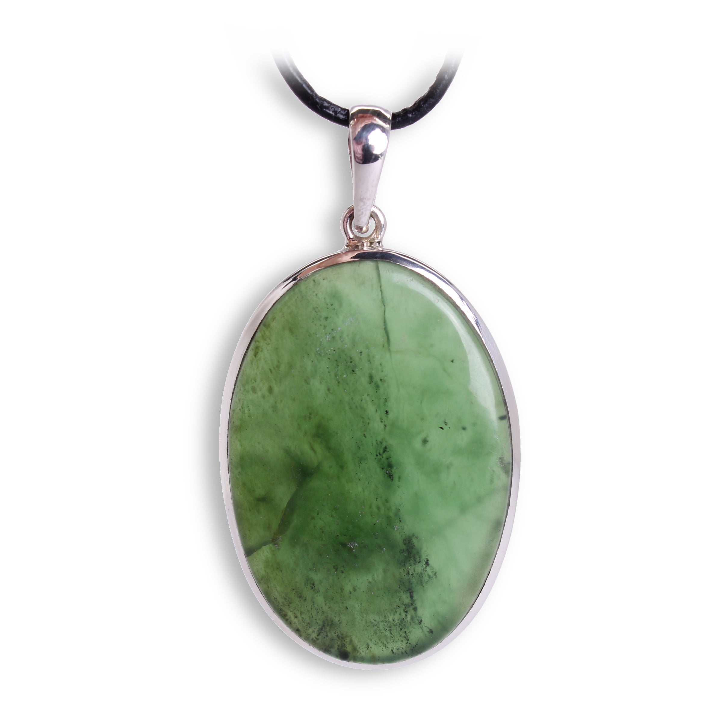 Nephrit Anhänger 925 Silber – edler Naturstein Schmuck – inkl. 1m Lederband zum Kürzen – in Geschenkbox – Heilstein & Glücksbringer