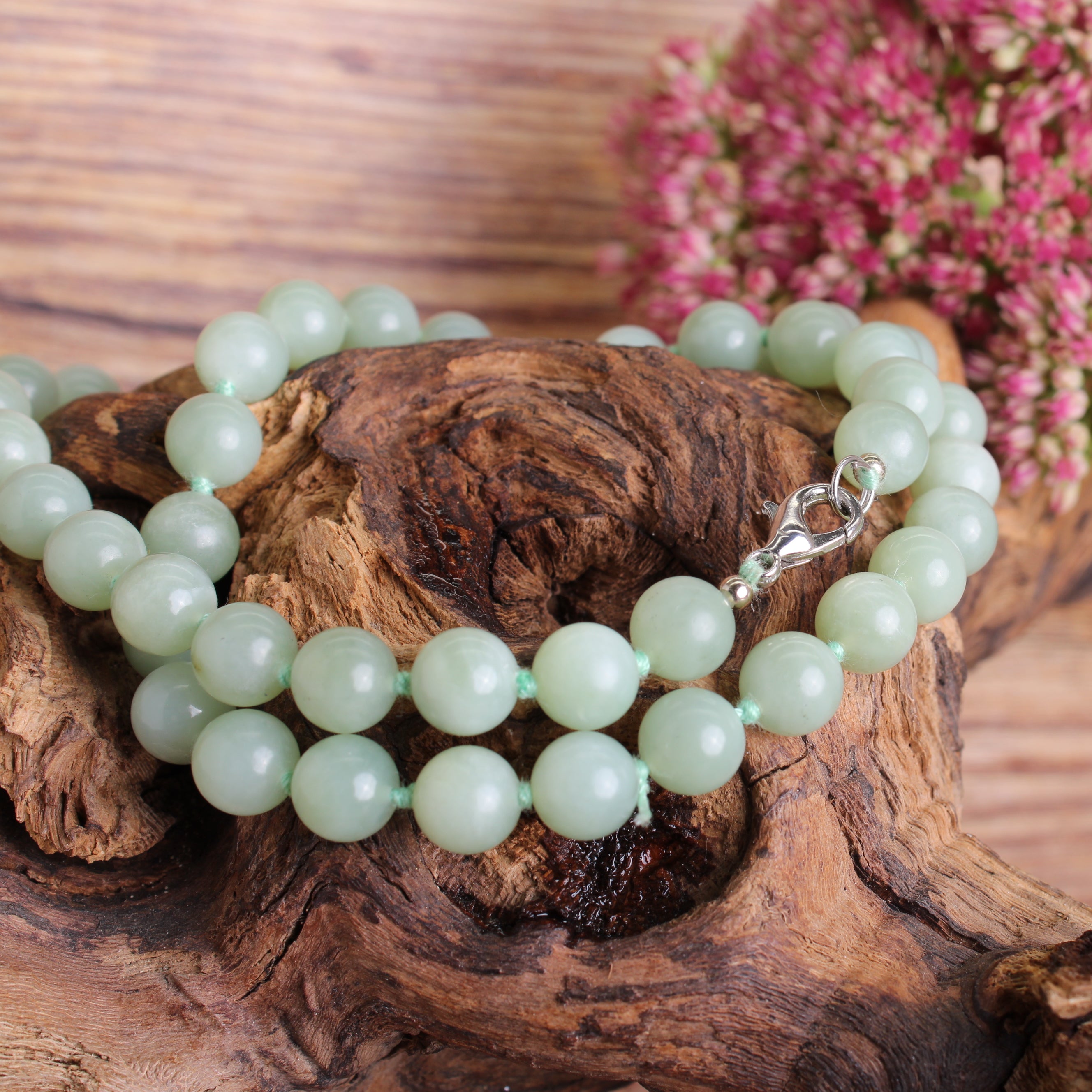 Serpentin China Jade Kette – 8 mm Perlen – 45 cm – handgeknotet mit Edelstahl Karabiner – Edelsteinkette Schmuck – Lieferung im Organzasäckchen