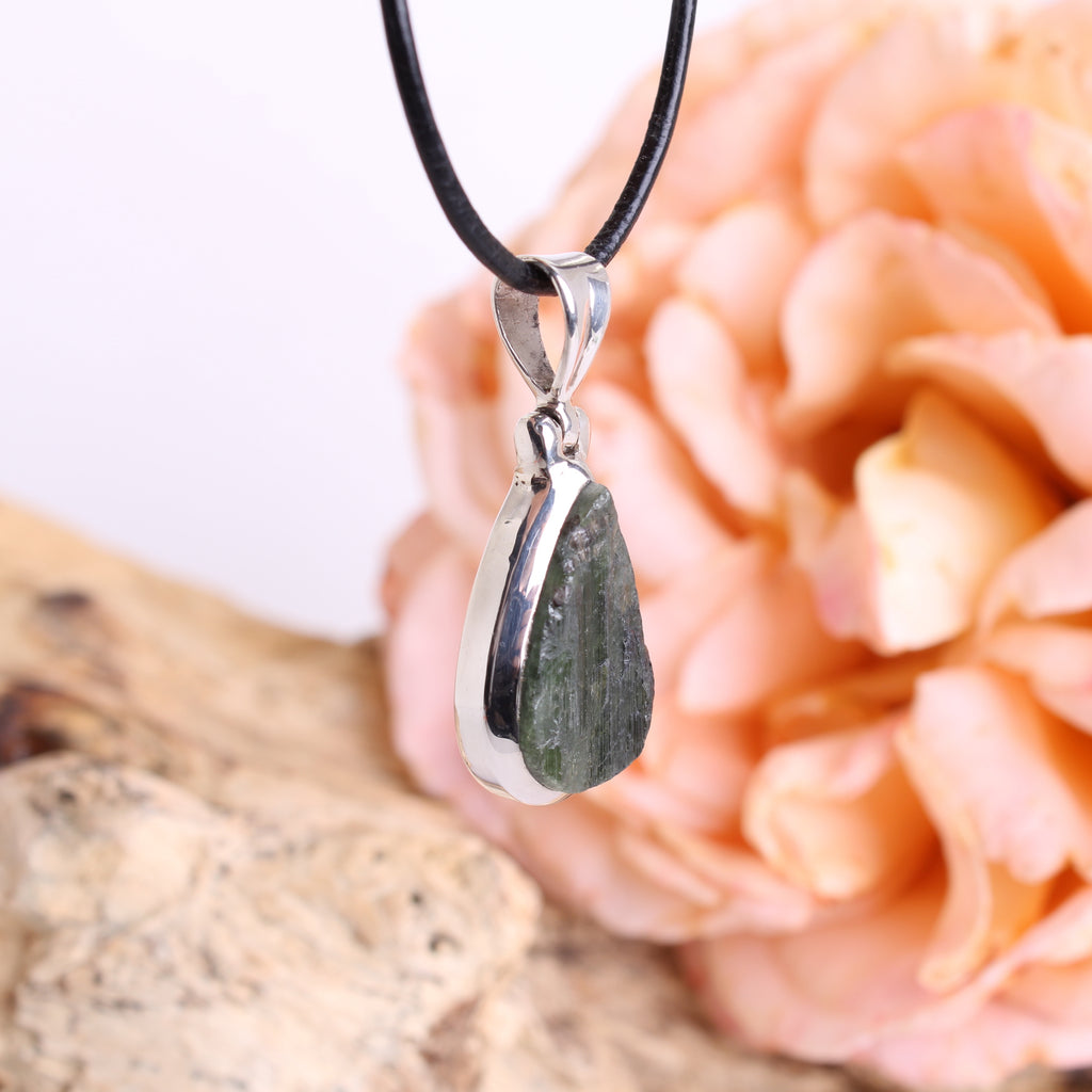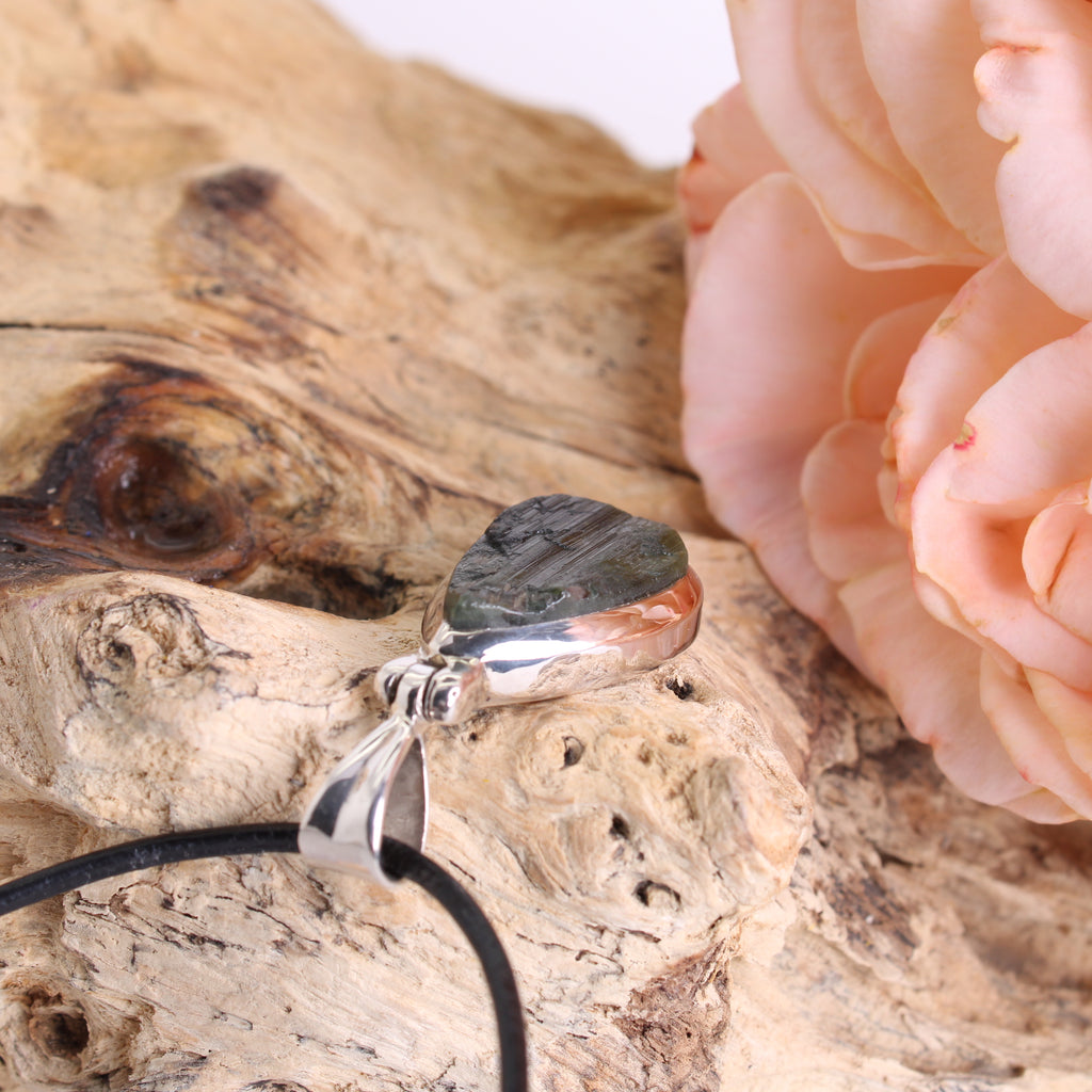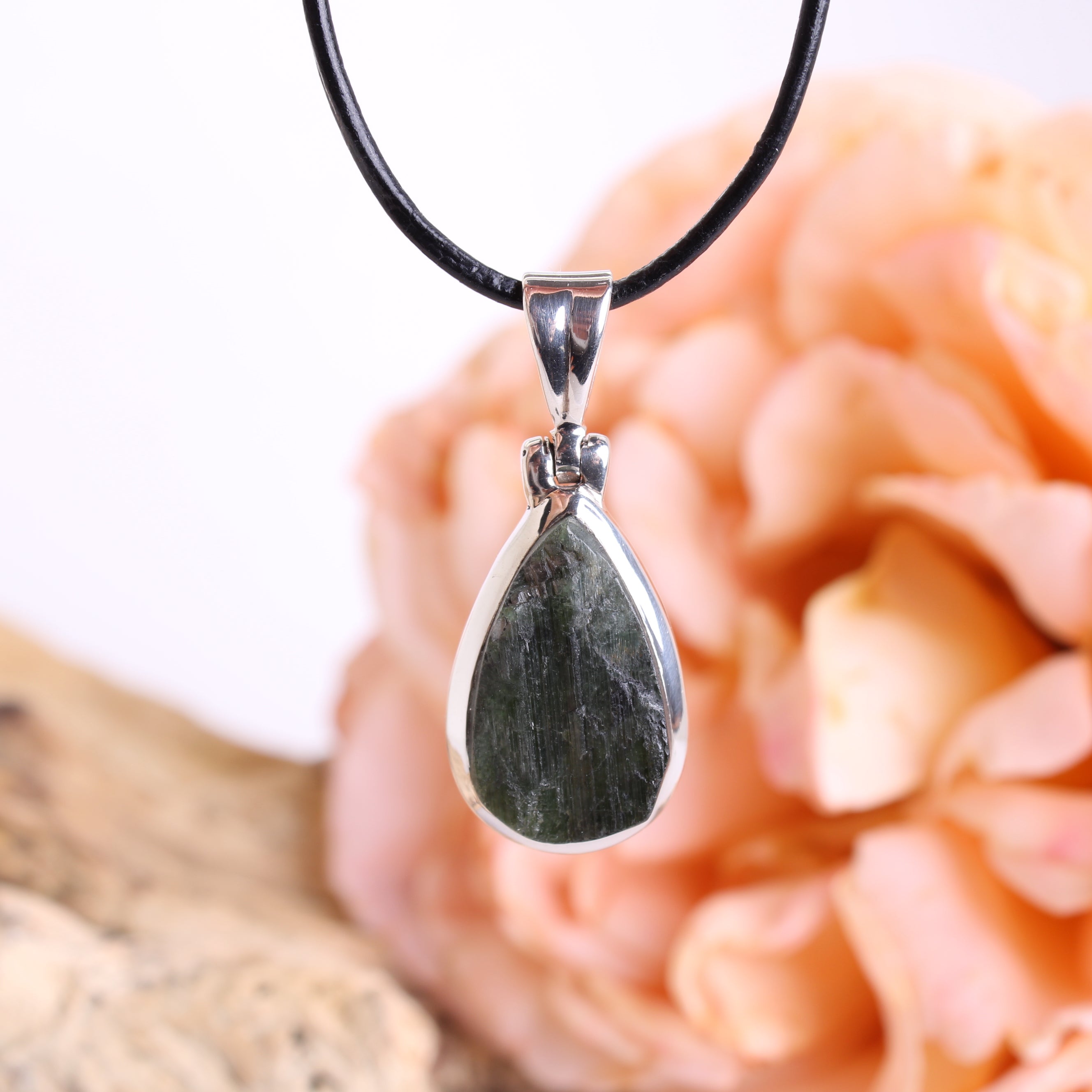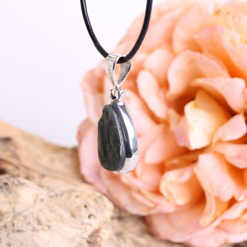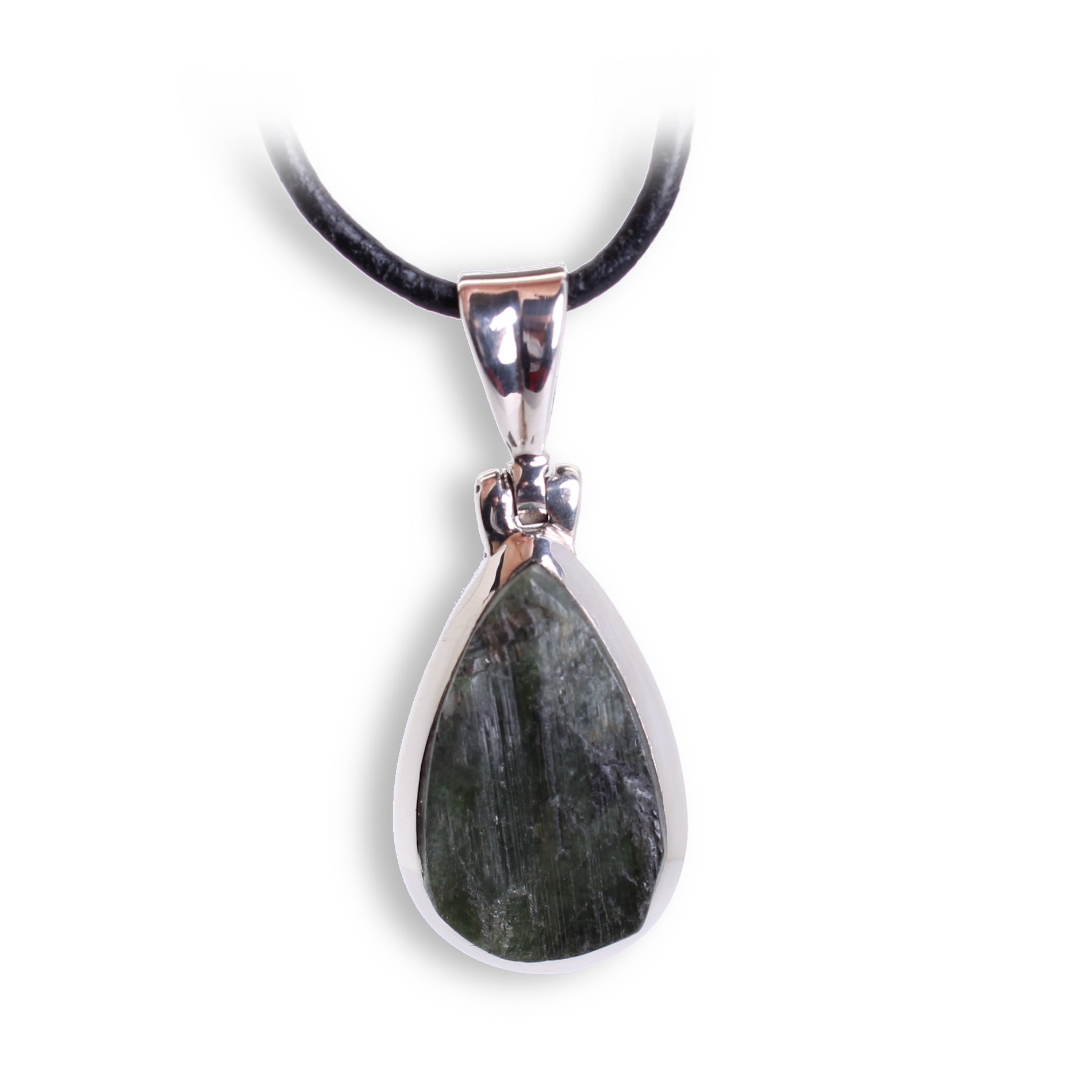 Grüner Turmalin Rohstein Anhänger Tropfenform 925 Sterling Silber mit Lederband kürzbar Naturstein Unikat Schmuck in Geschenkschachtel