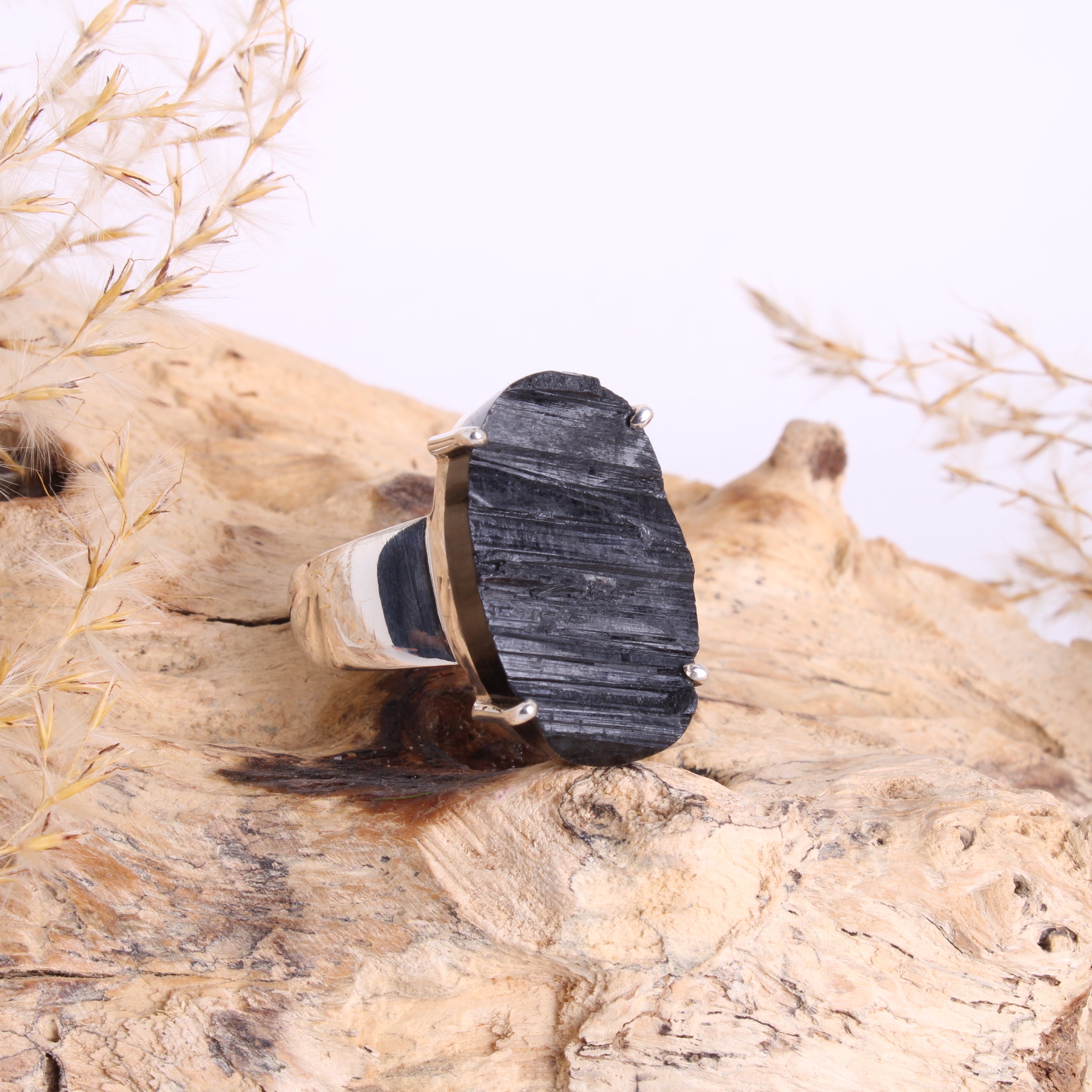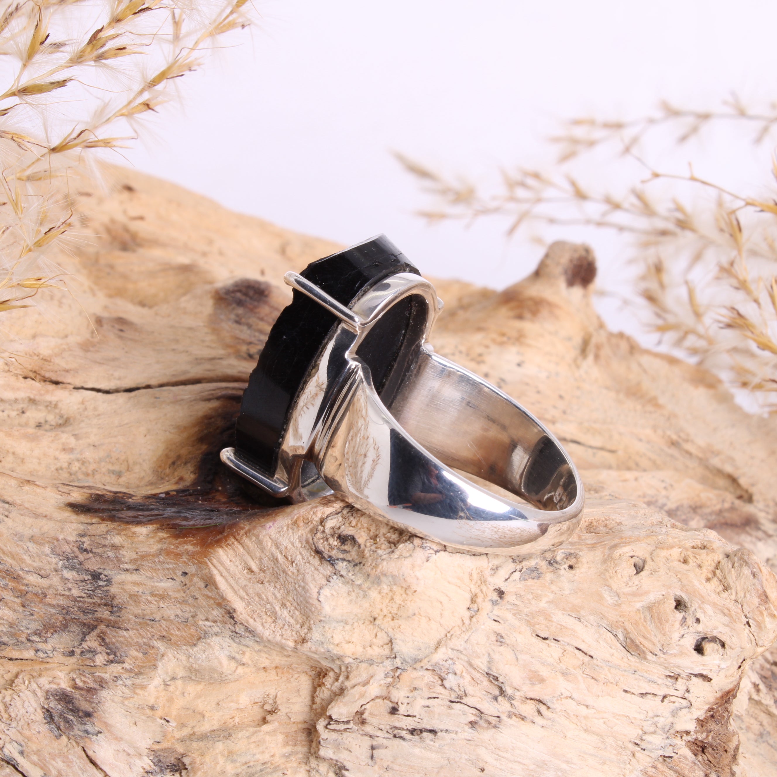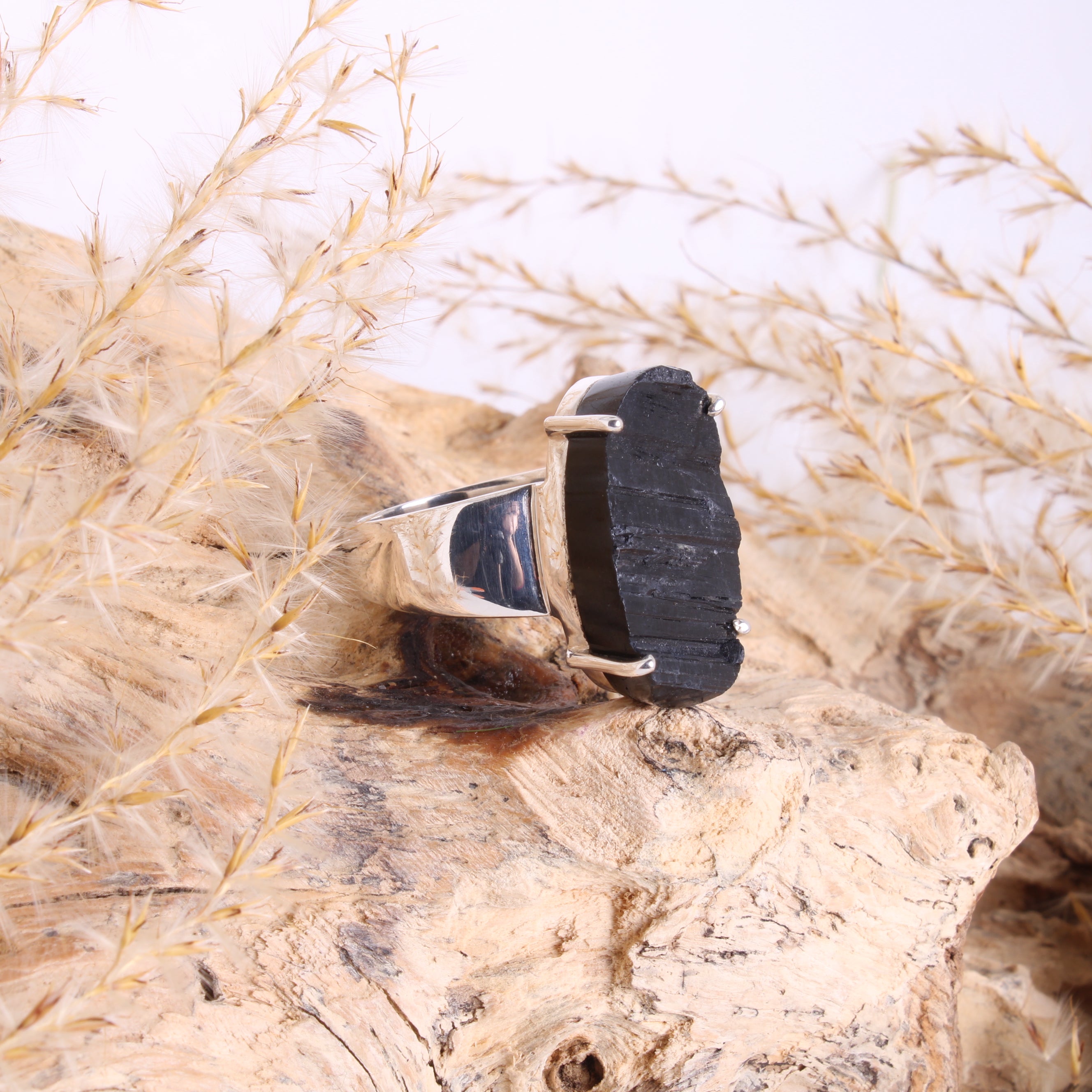 Schwarzer Turmalin Ring – Echter Edelstein in 925er Sterling Silber, naturbelassen & handgefertigt, Ringgröße 59