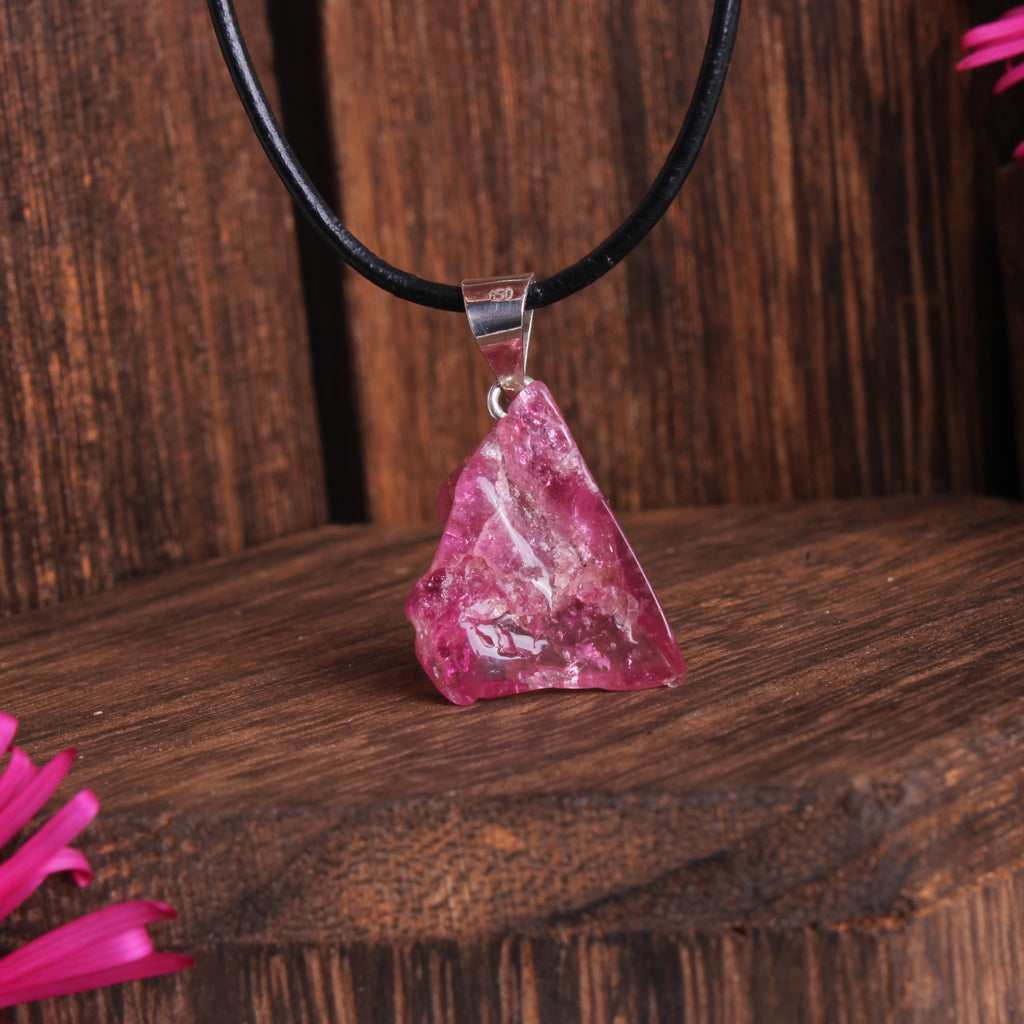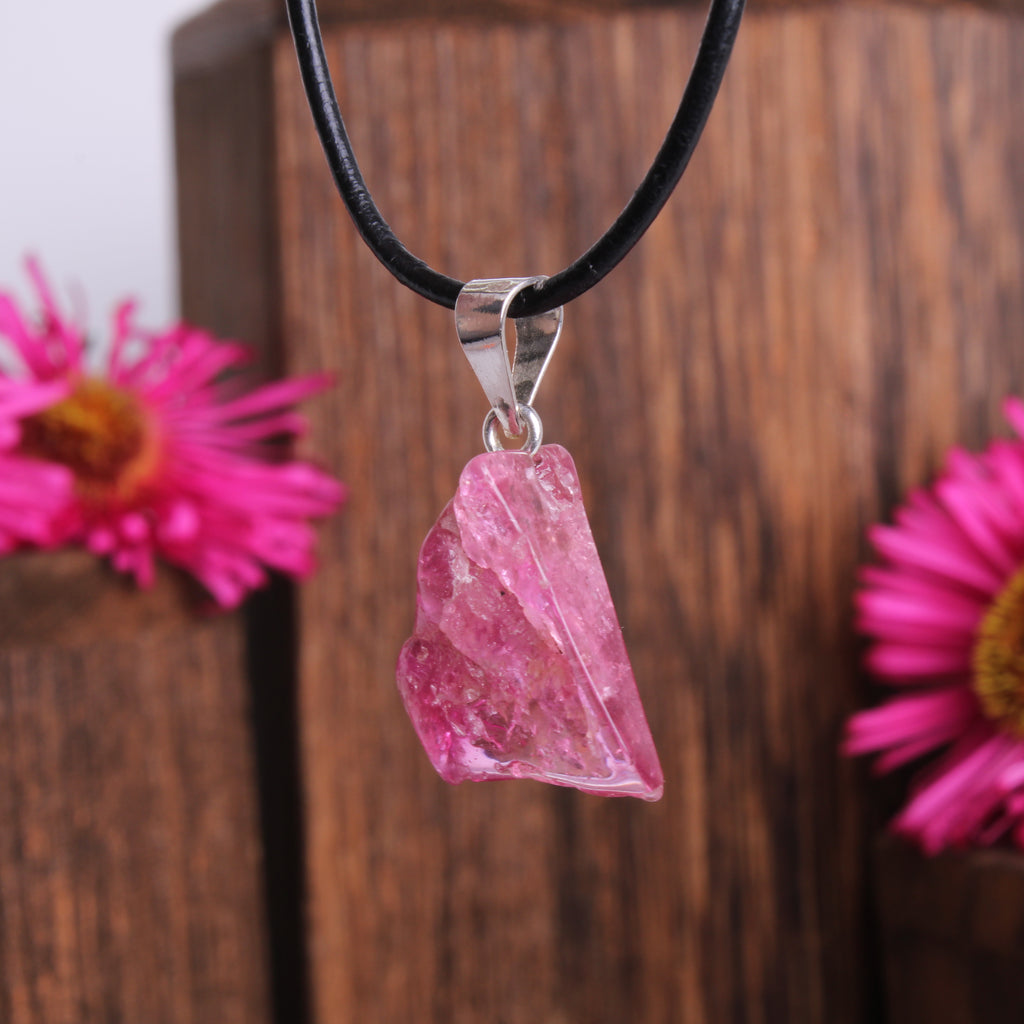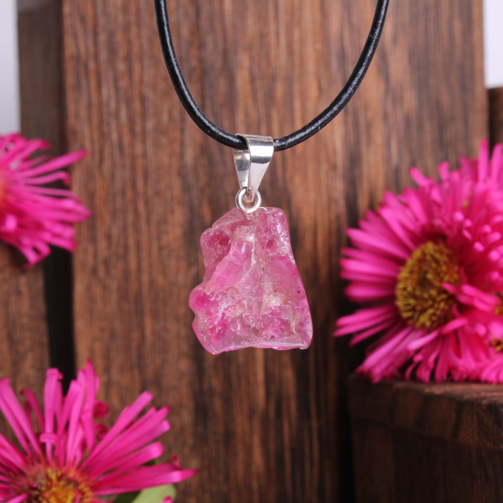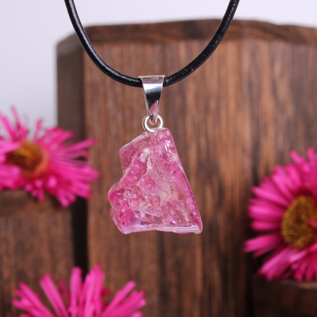 Rosa Turmalin Anhänger – Naturbelassen & poliert in 925er Sterling Silber mit Lederband & Geschenkschachtel