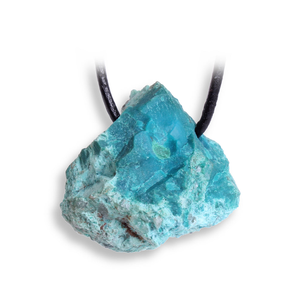 Chrysokoll Rohstein Anhänger – Einzelstück gebohrt – naturbelassener Edelstein inkl. 1 m Lederband & Organzasäckchen – einzigartiges Unikat