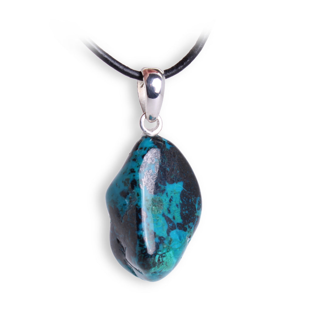 Chrysokoll Trommelstein Anhänger Einzelstück – gestiftet mit 925 Sterling Silberöse – Edelstein – inkl. schwarzem Lederband & Geschenkschachtel
