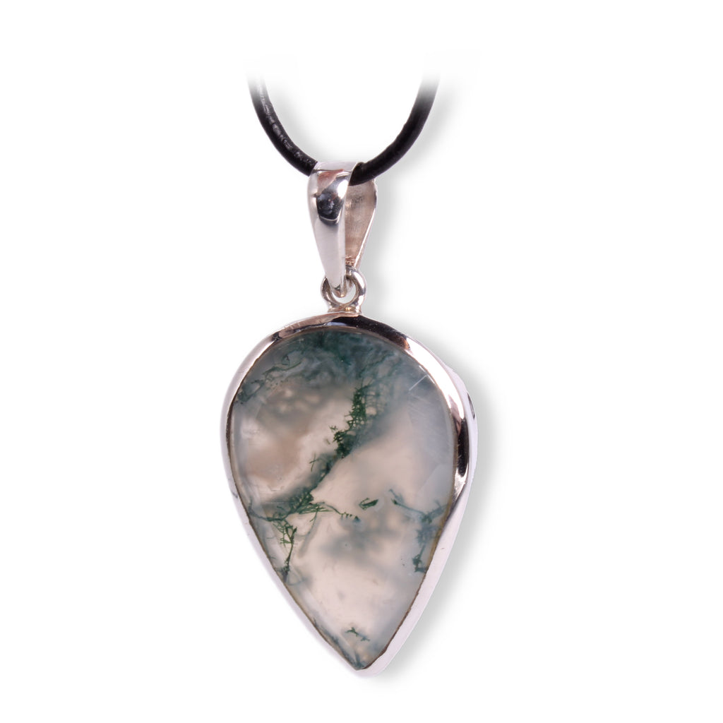 Facettierter Moosachat Anhänger Unikat in 925er Silberfassung – Edelstein Schmuck mit Lederband – Lieferung in Geschenkschachtel