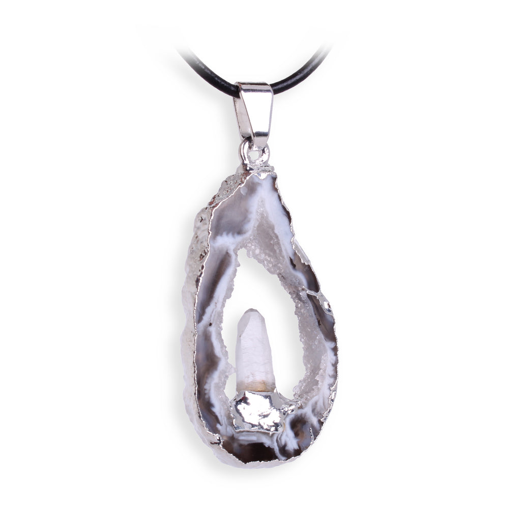 Achat Geode Anhänger mit Bergkristallspitze Naturstein Schmuck Galvanisierte Kante mit Lederband Geschenkverpackung