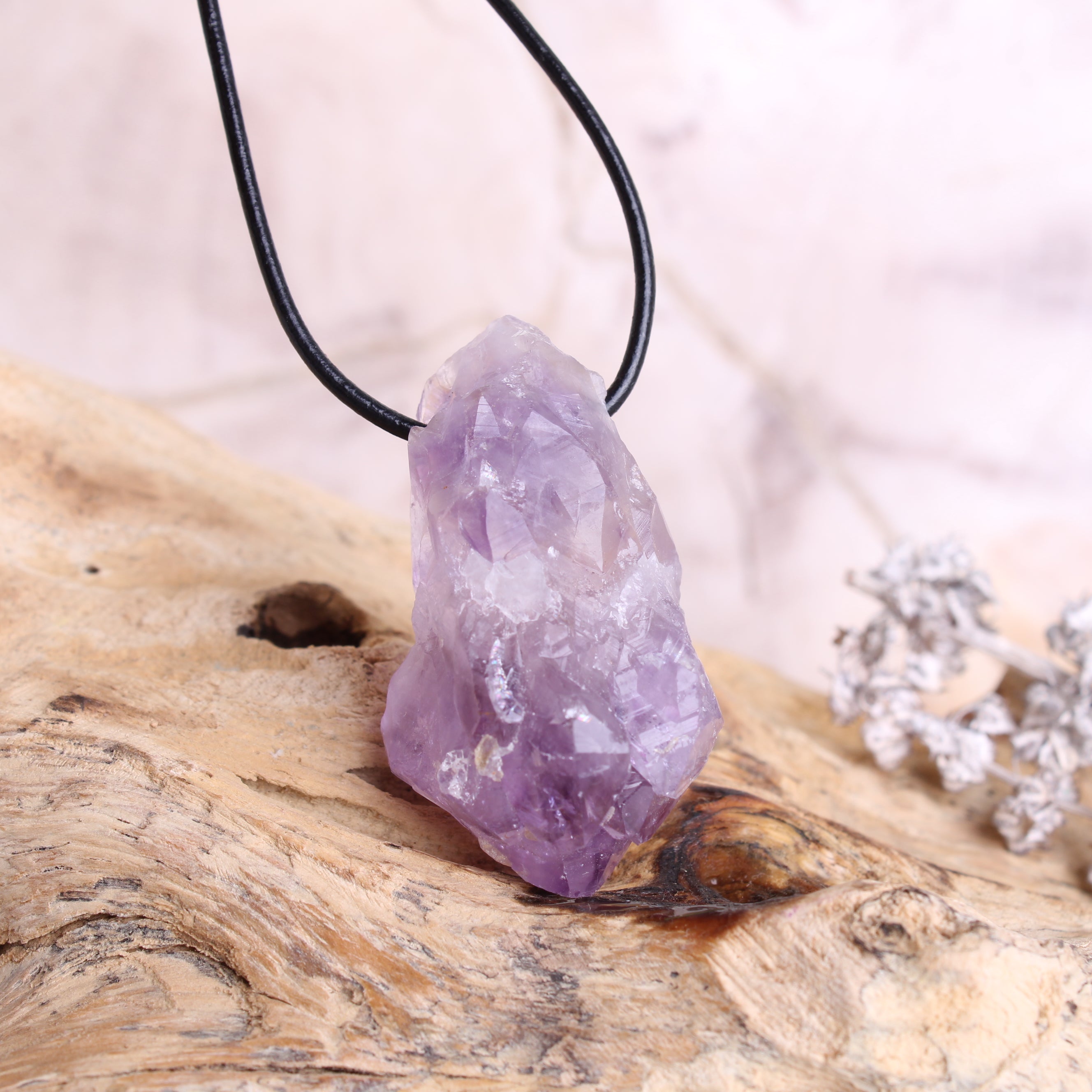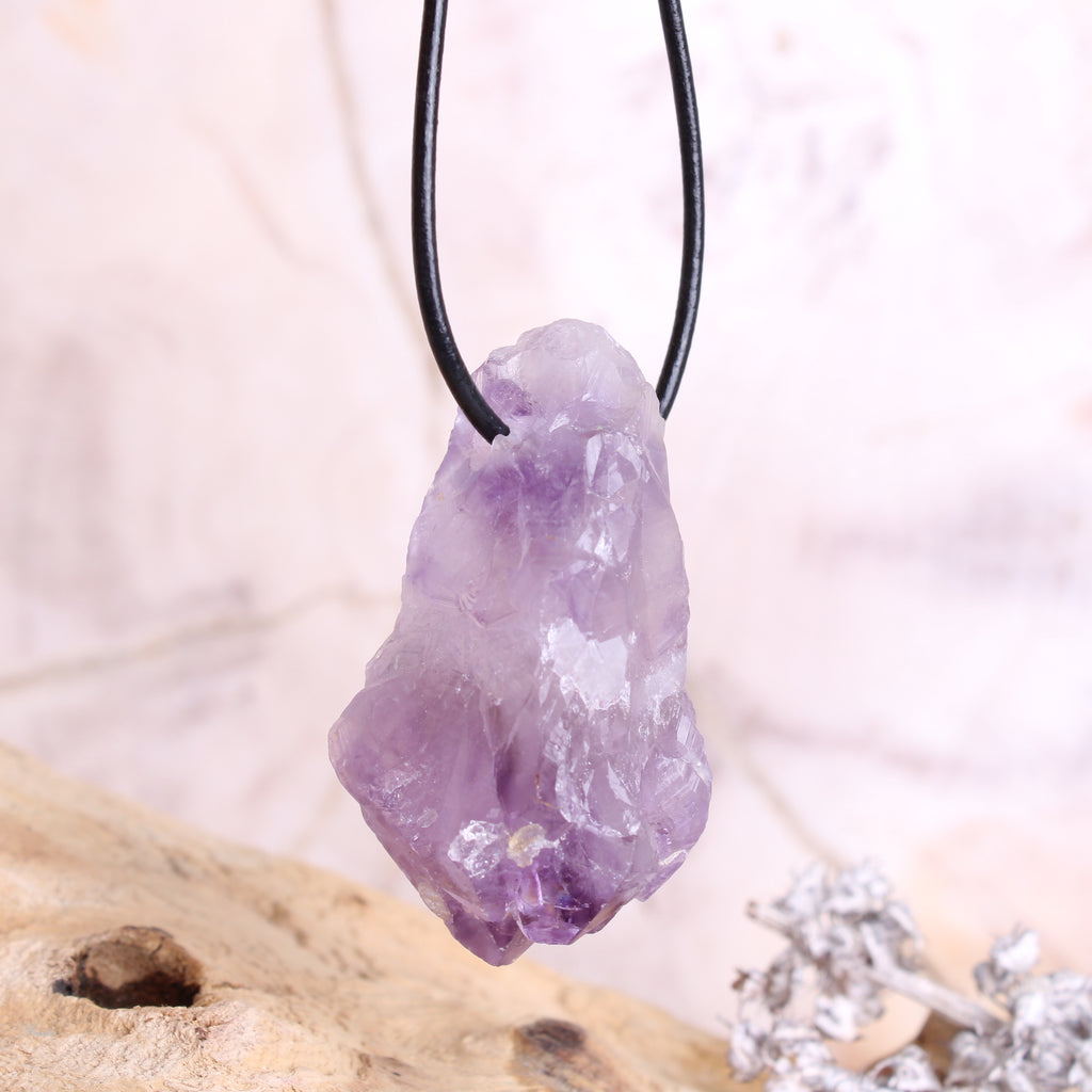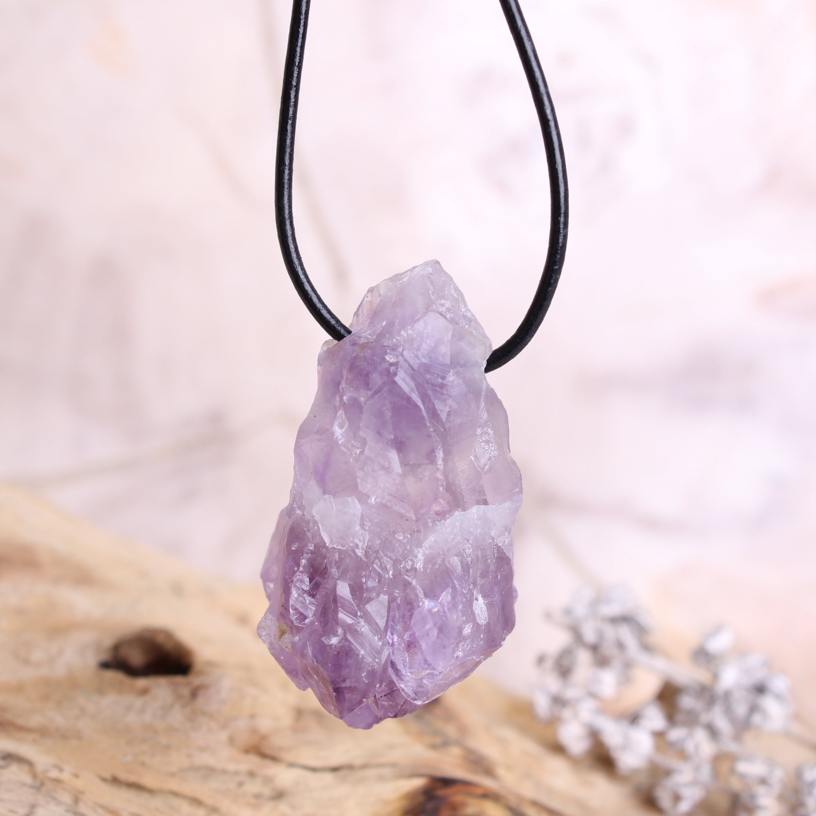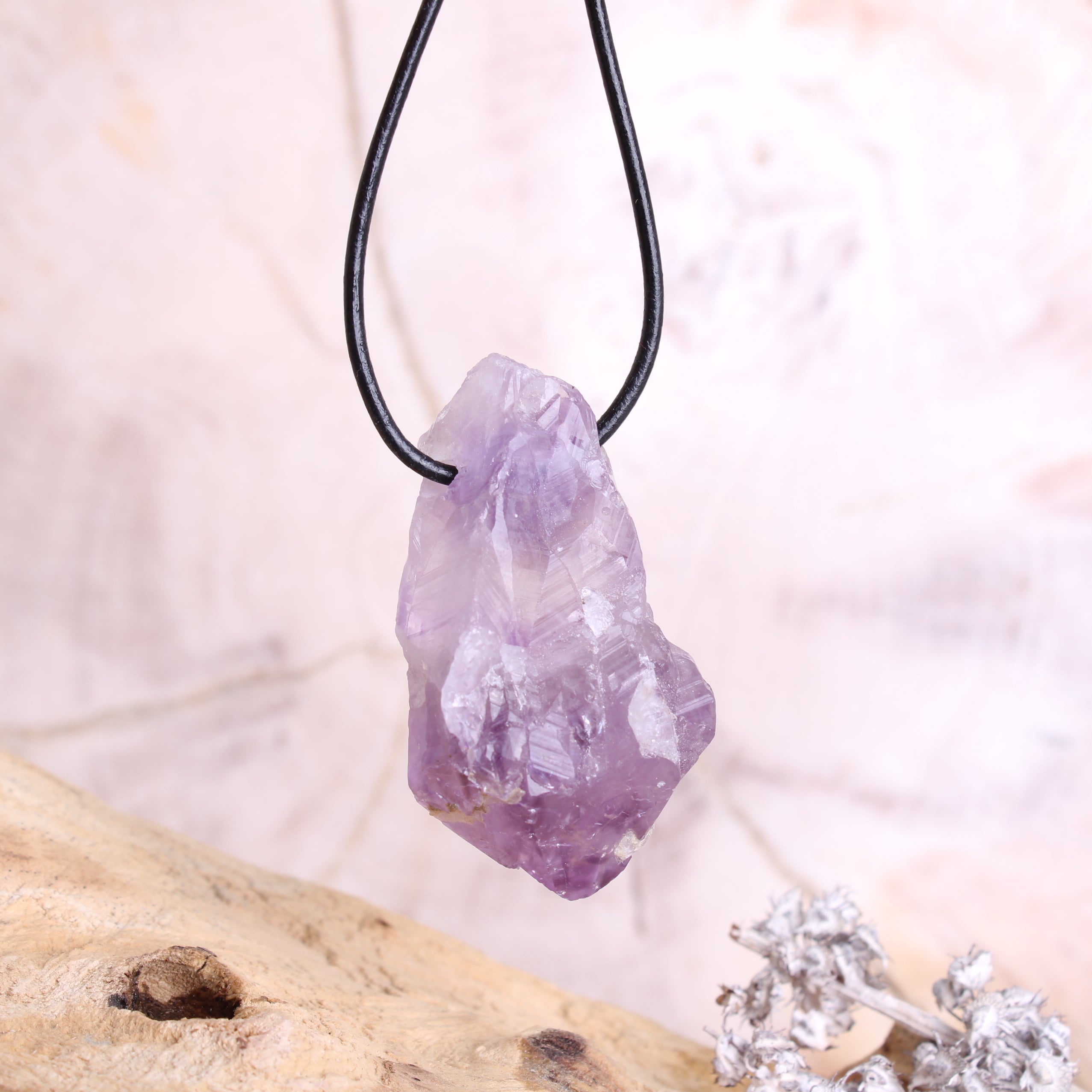 Amethyst Spitze Anhänger – Naturbelassener Kristall gebohrt – ca. 35 x 20 mm – mit Lederband zum Kürzen – Spiritueller Edelsteinschmuck – inkl. Organzasäckchen