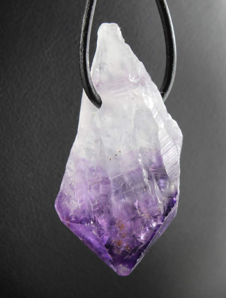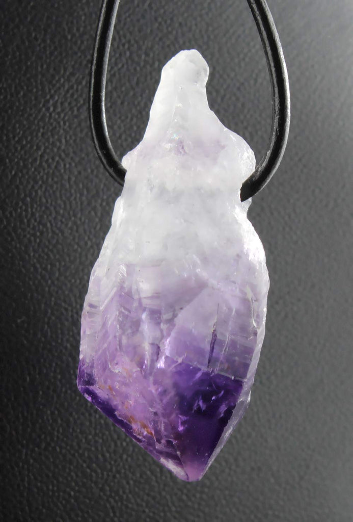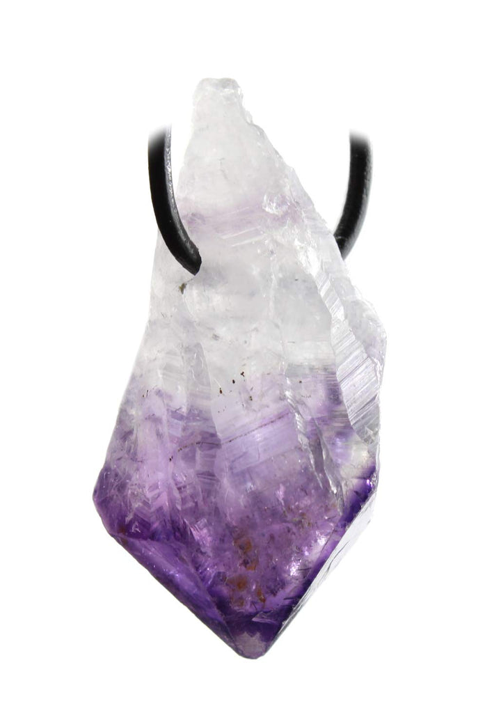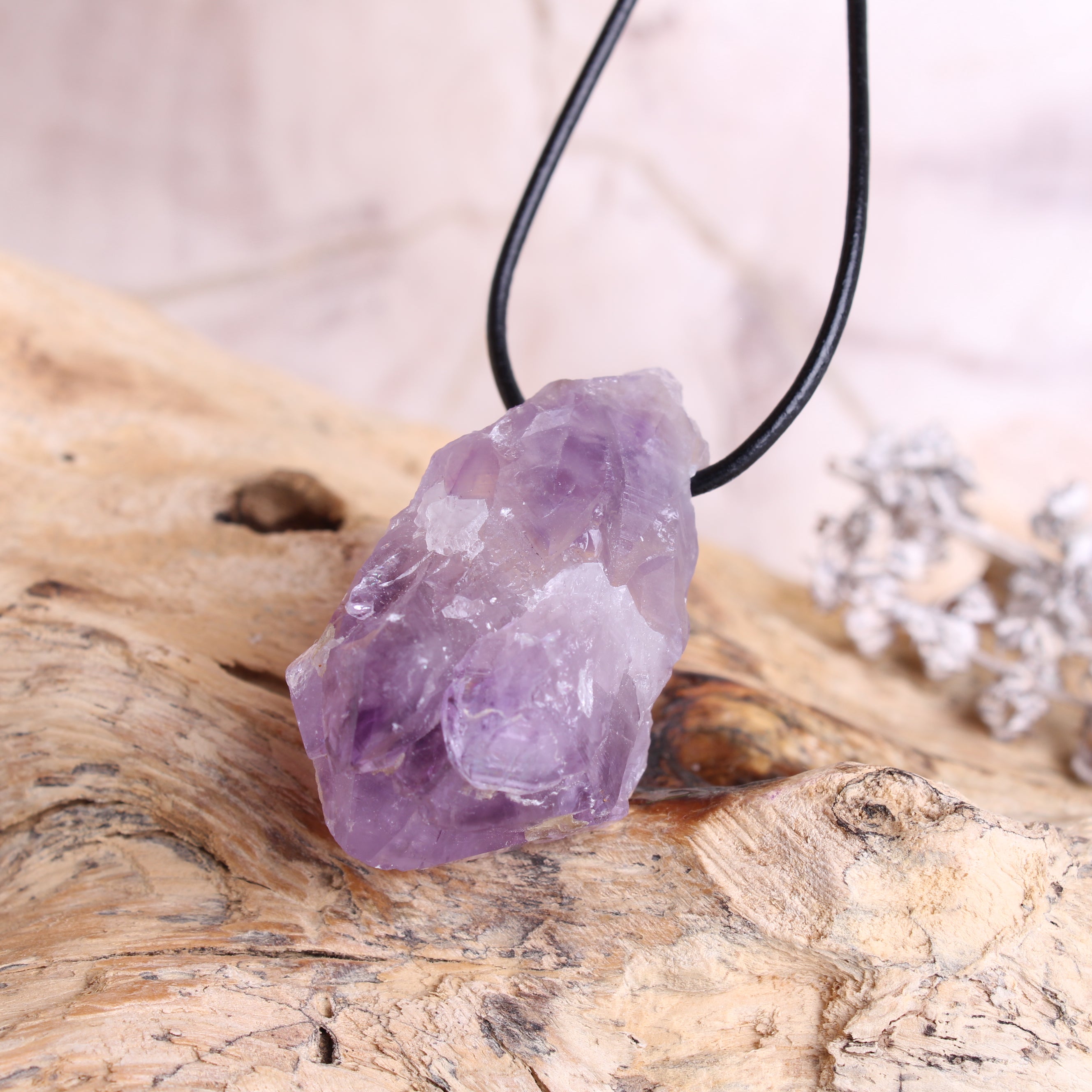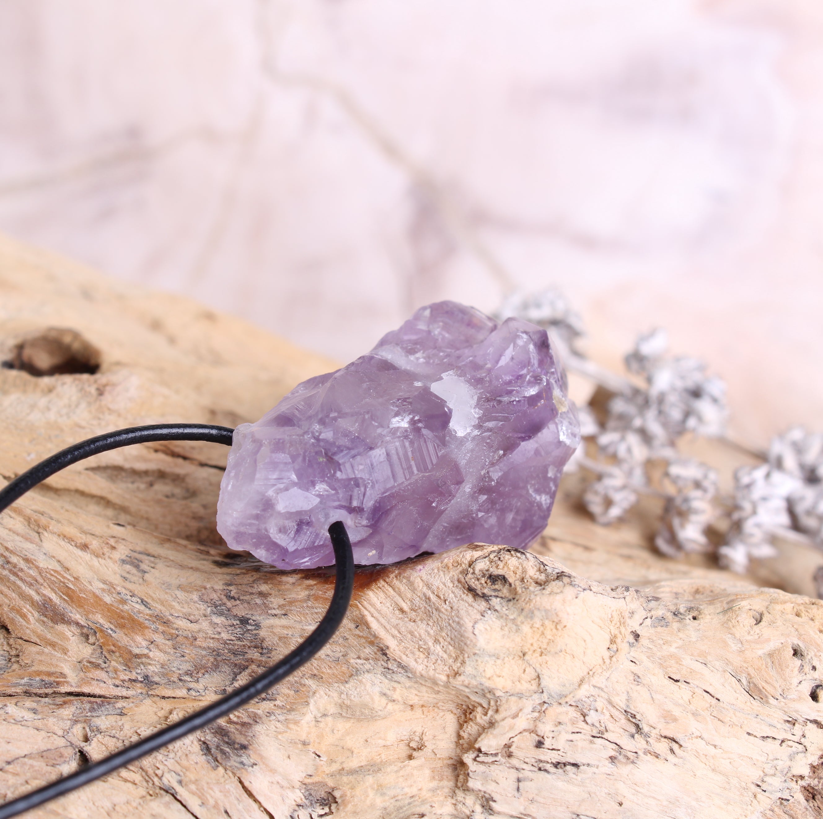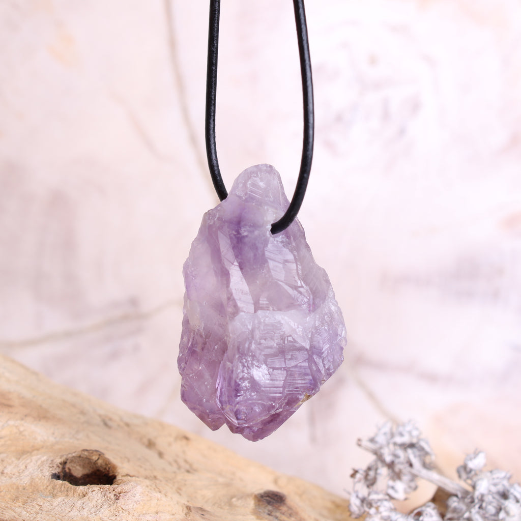 Amethyst Spitze Anhänger – Naturbelassener Kristall gebohrt – ca. 35 x 20 mm – mit Lederband zum Kürzen – Spiritueller Edelsteinschmuck – inkl. Organzasäckchen