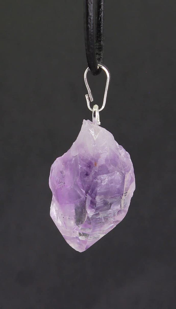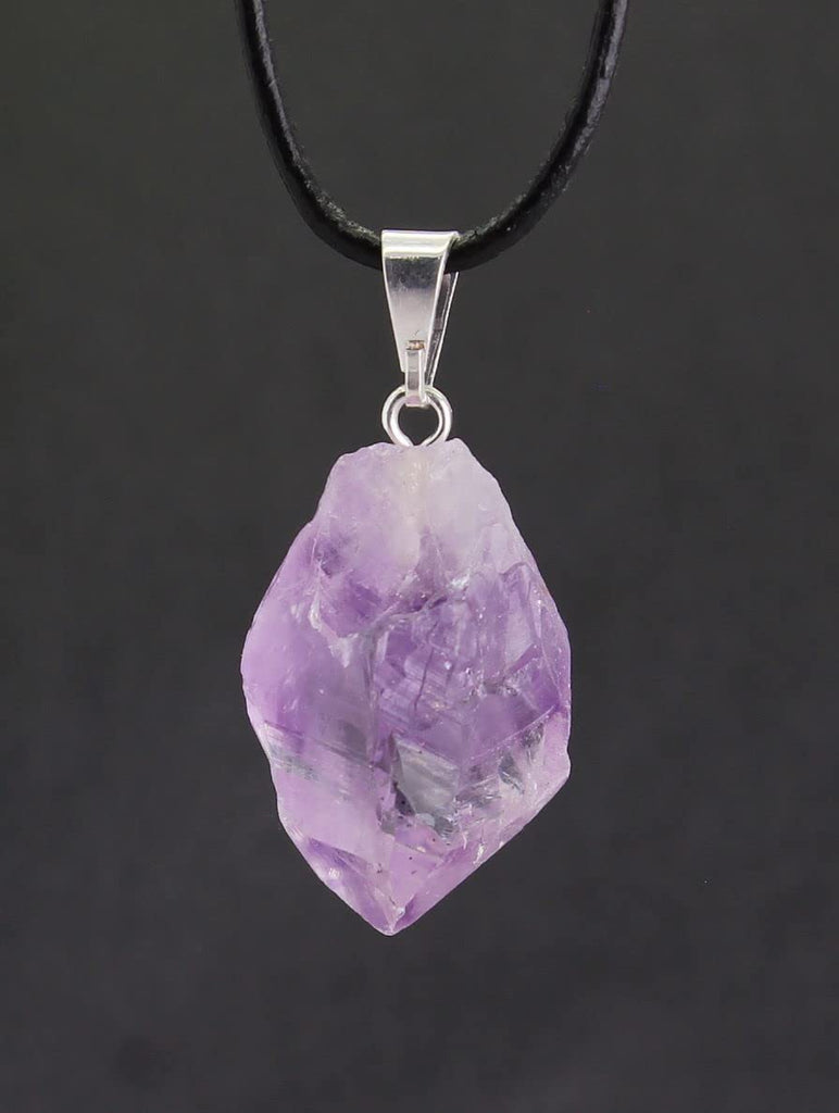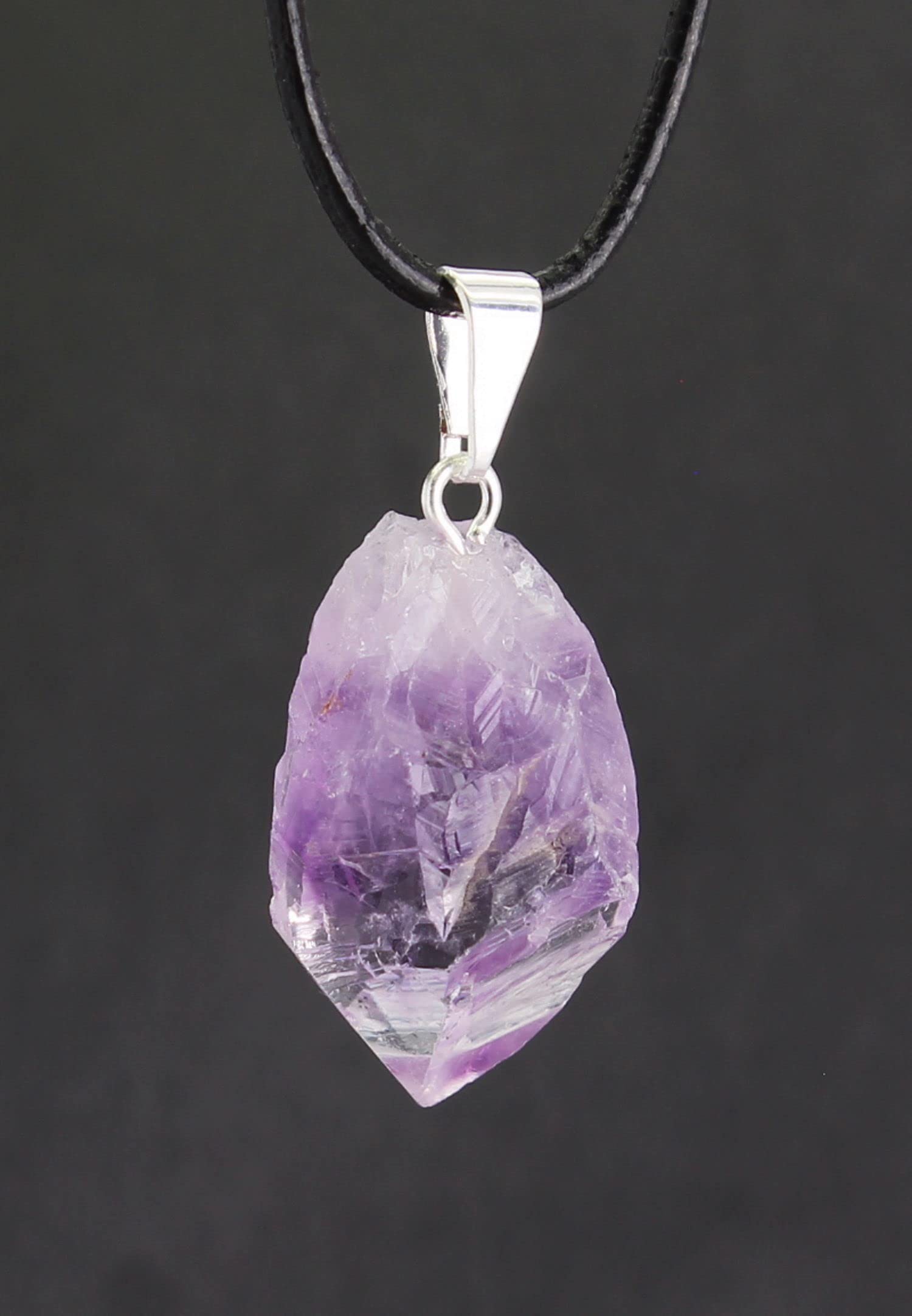 Amethyst Spitze Anhänger – ca. 20 x 15 mm – gestiftet mit silberfarbener Metallöse – mit Lederband zum Kürzen – Rohkristall Schmuck – inkl. Organzasäckchen
