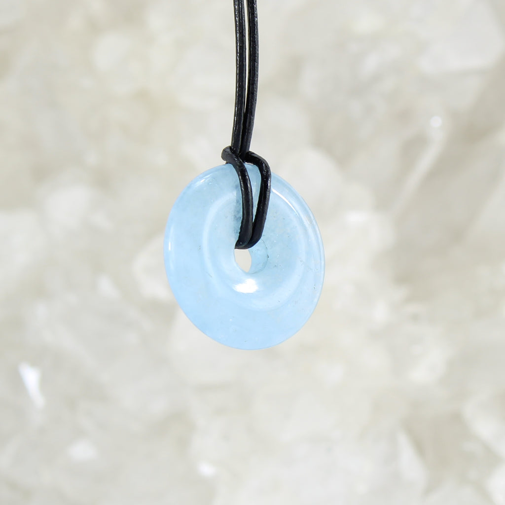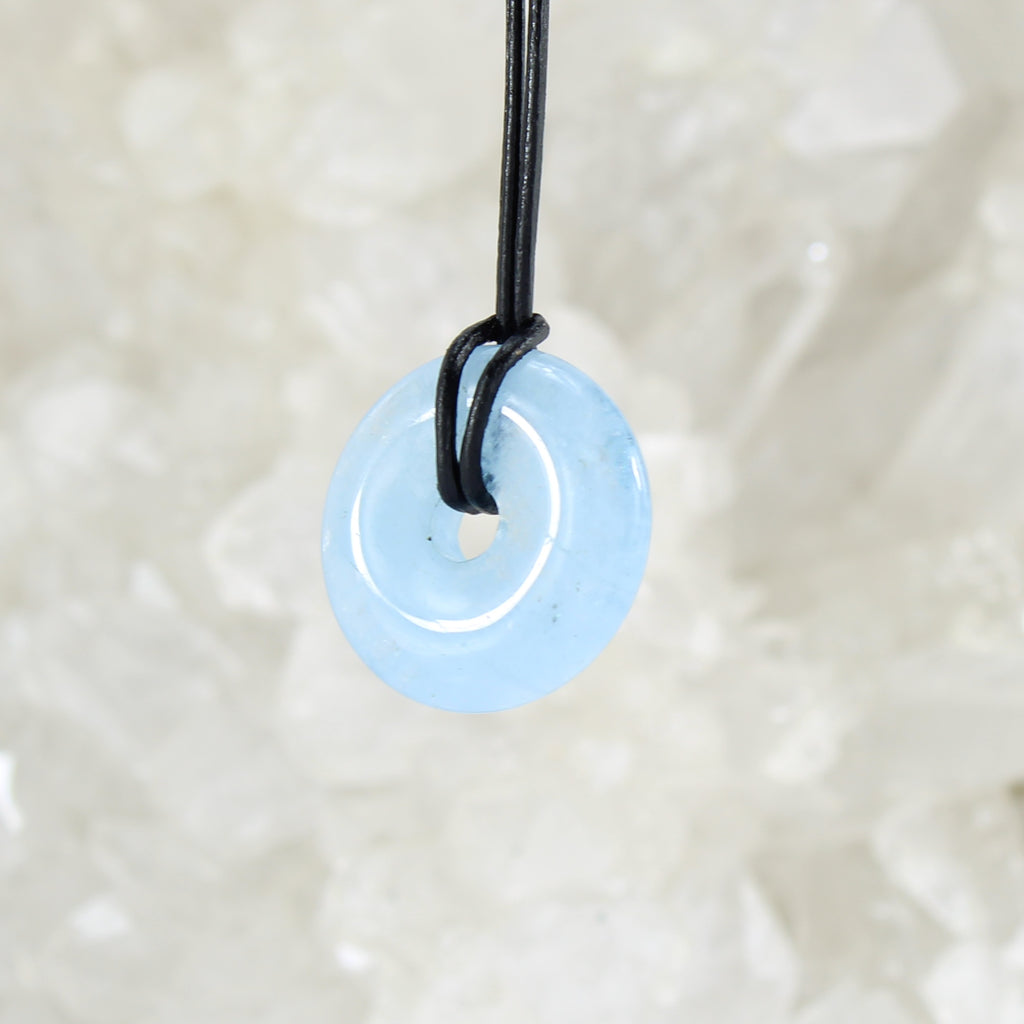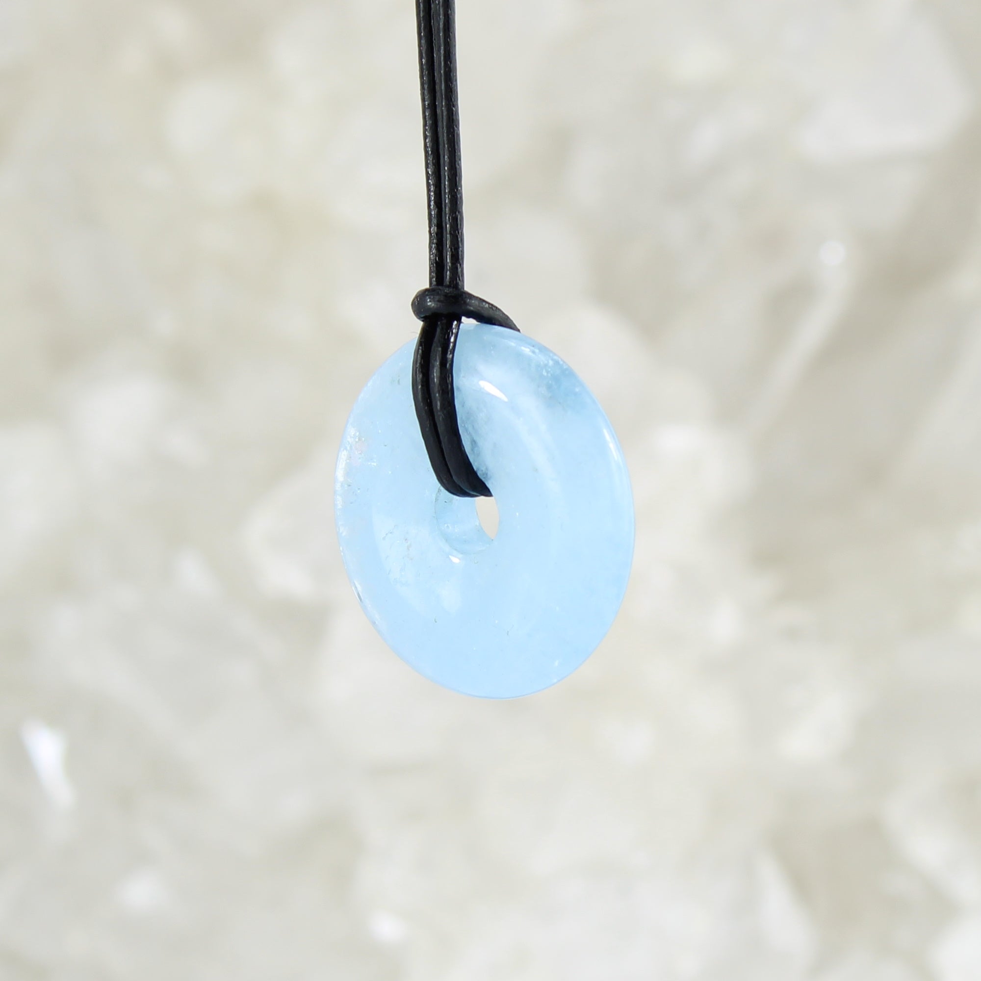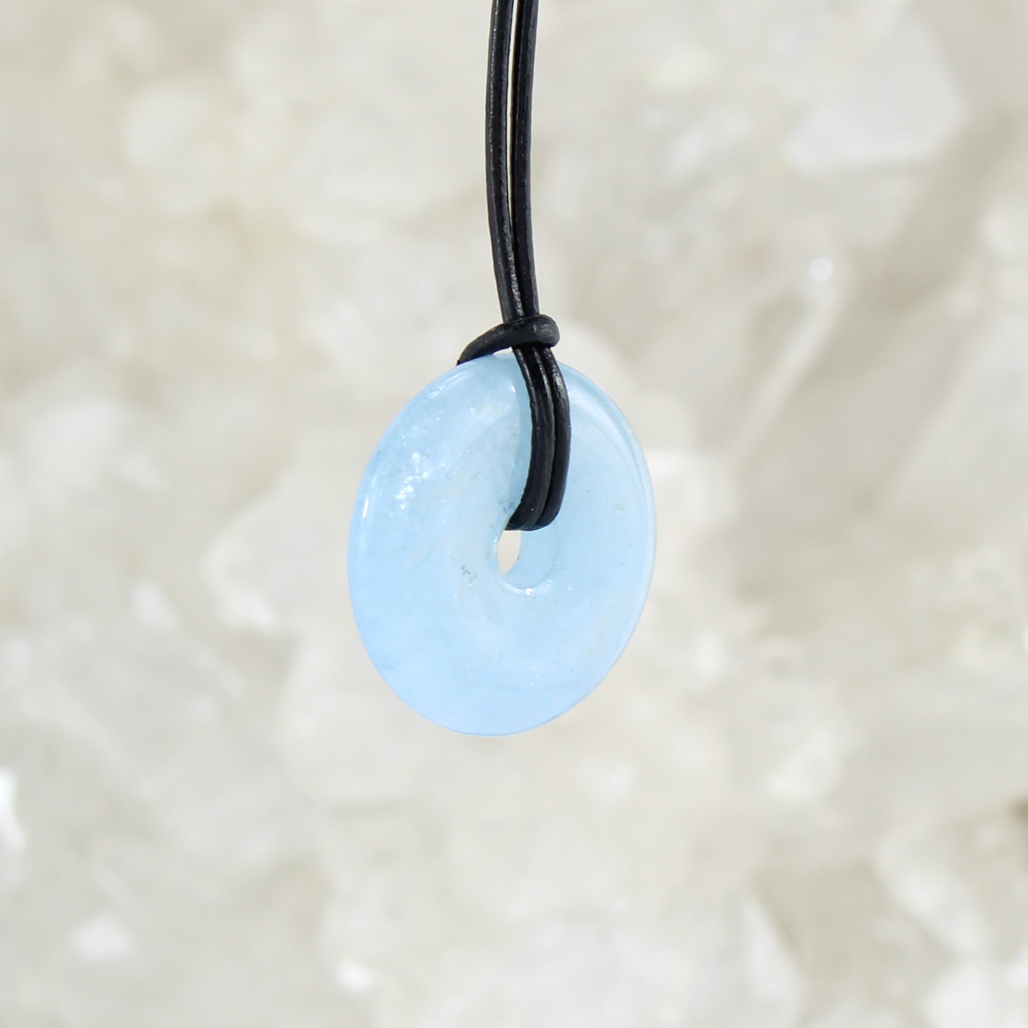 Kleiner Aquamarin Donut Anhänger – hellblau, echter Naturstein – inkl. 1m Lederband zum Kürzen – zarter Edelstein Schmuck in Geschenkbox – Heilstein & Glücksbringer
