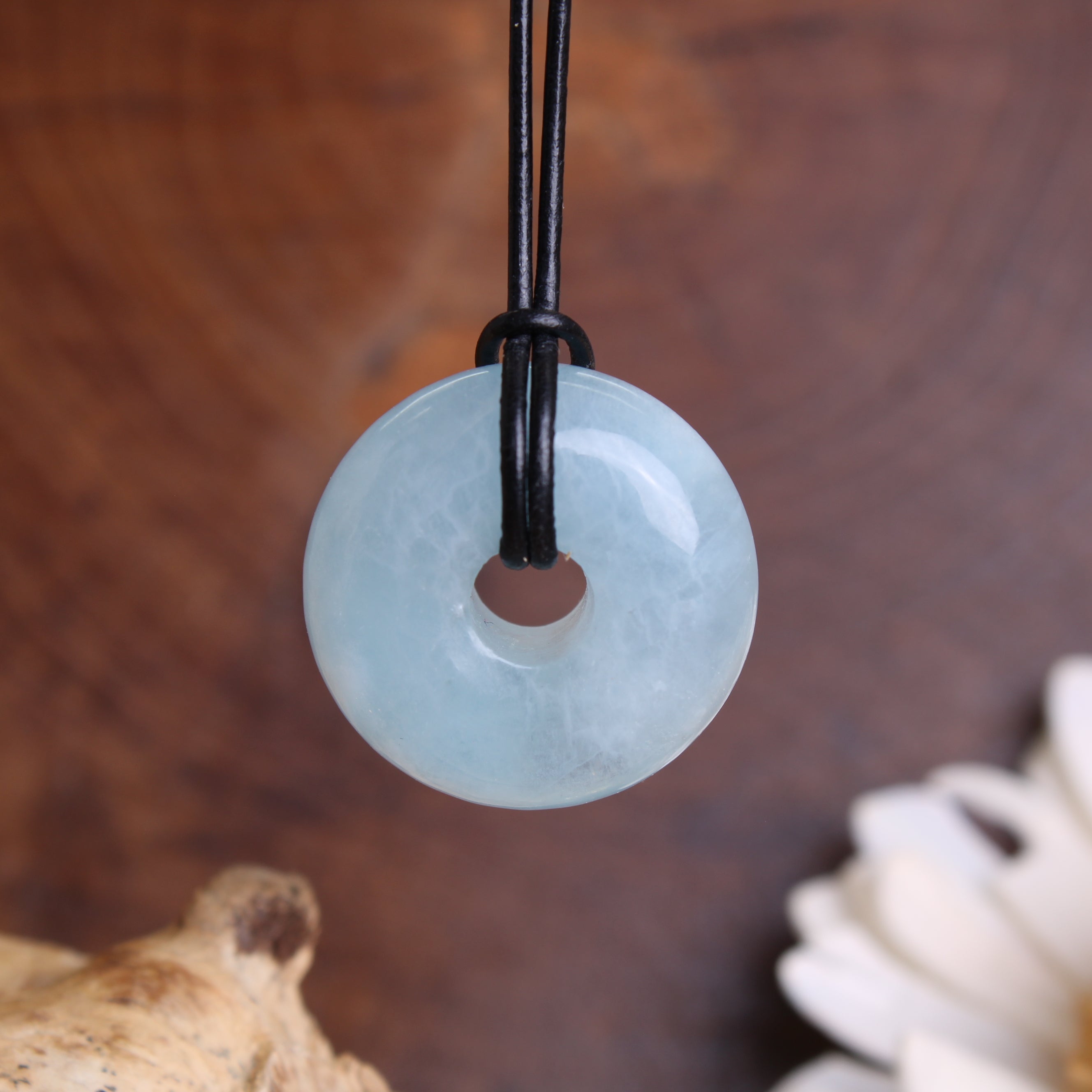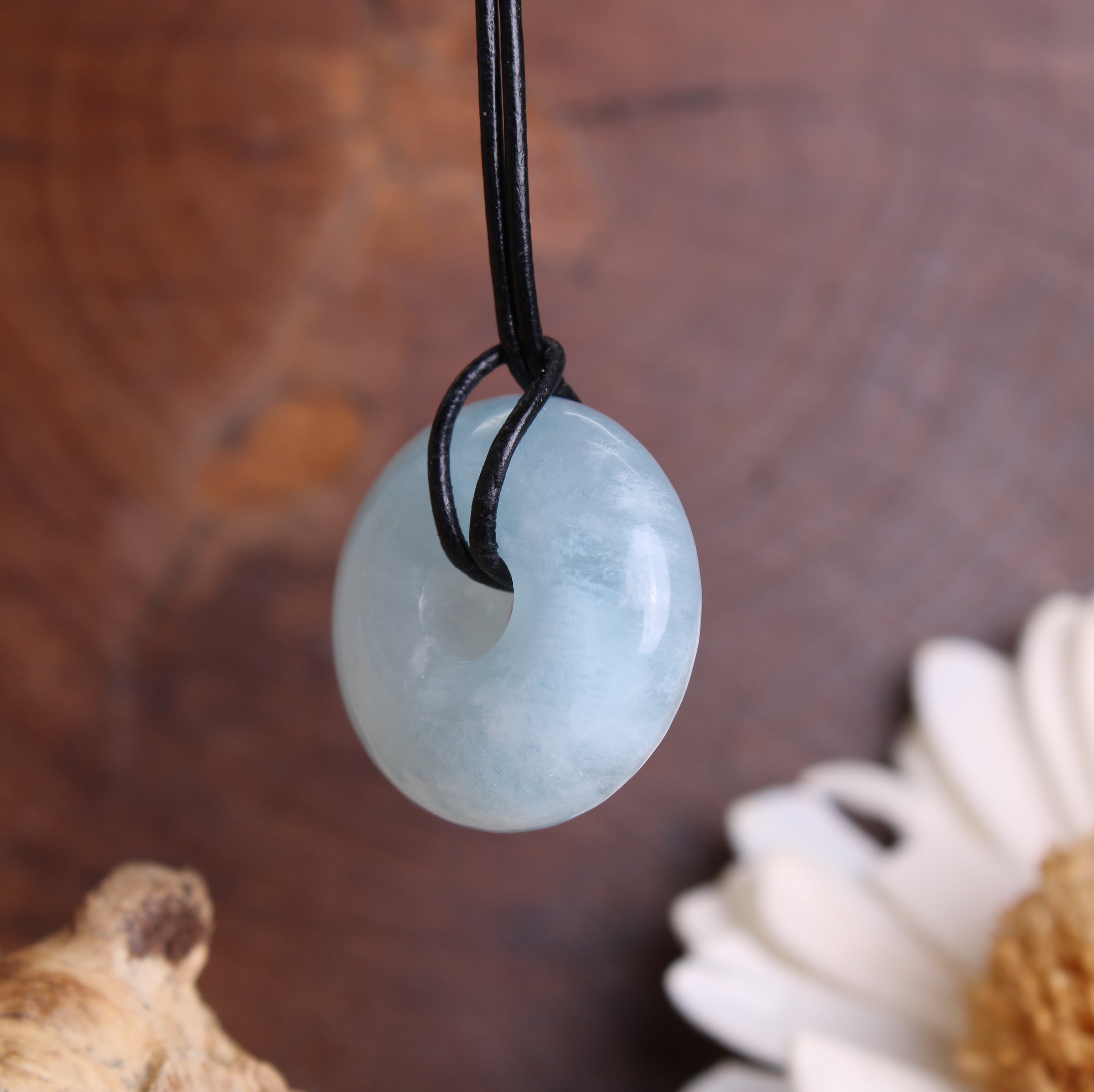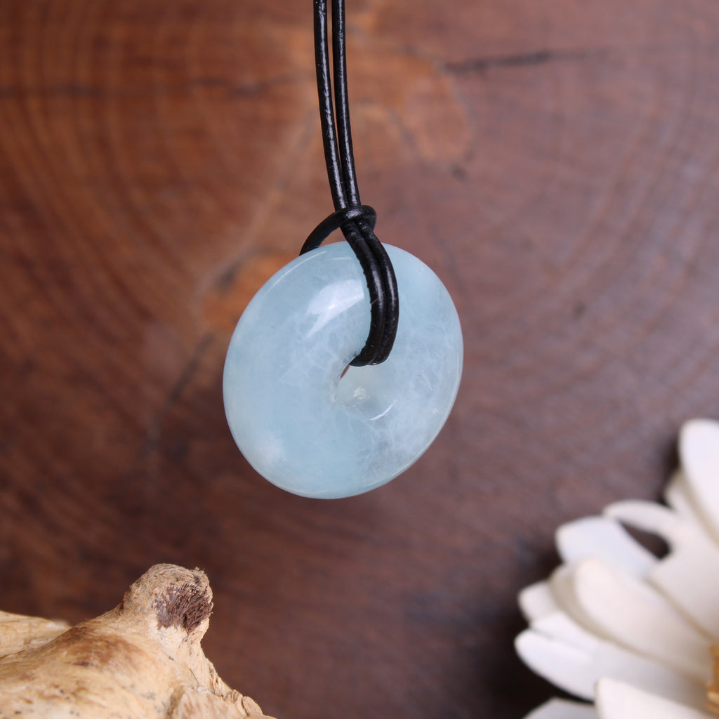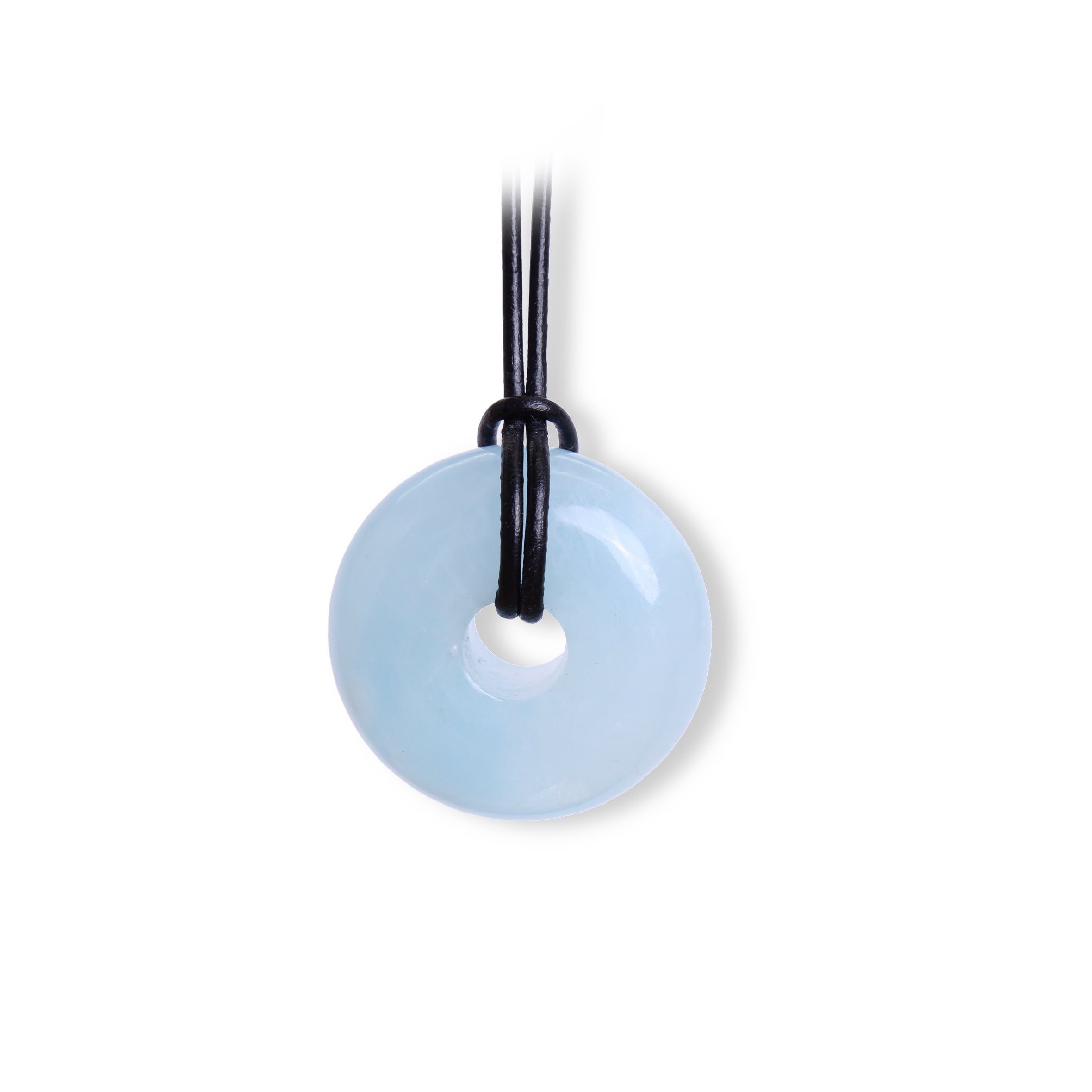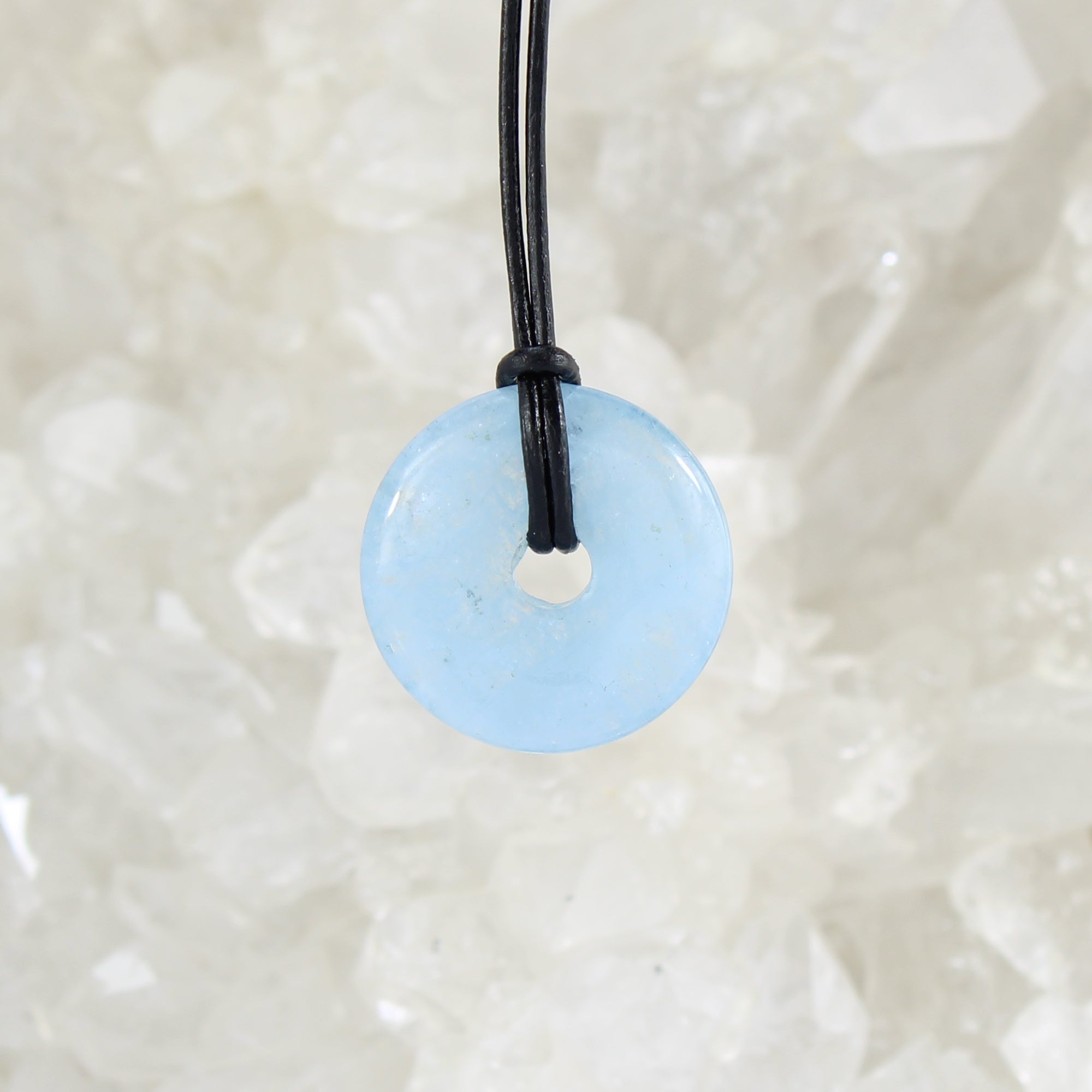 Kleiner Aquamarin Donut Anhänger – hellblau, echter Naturstein – inkl. 1m Lederband zum Kürzen – zarter Edelstein Schmuck in Geschenkbox – Heilstein & Glücksbringer
