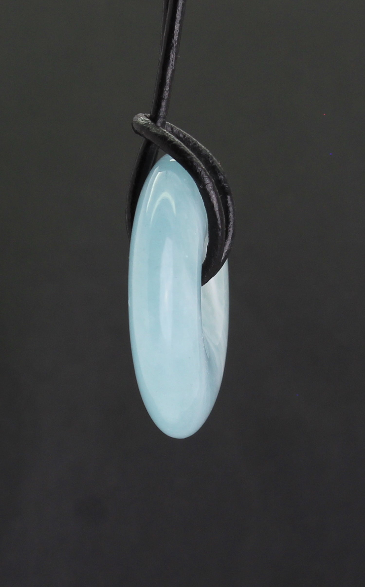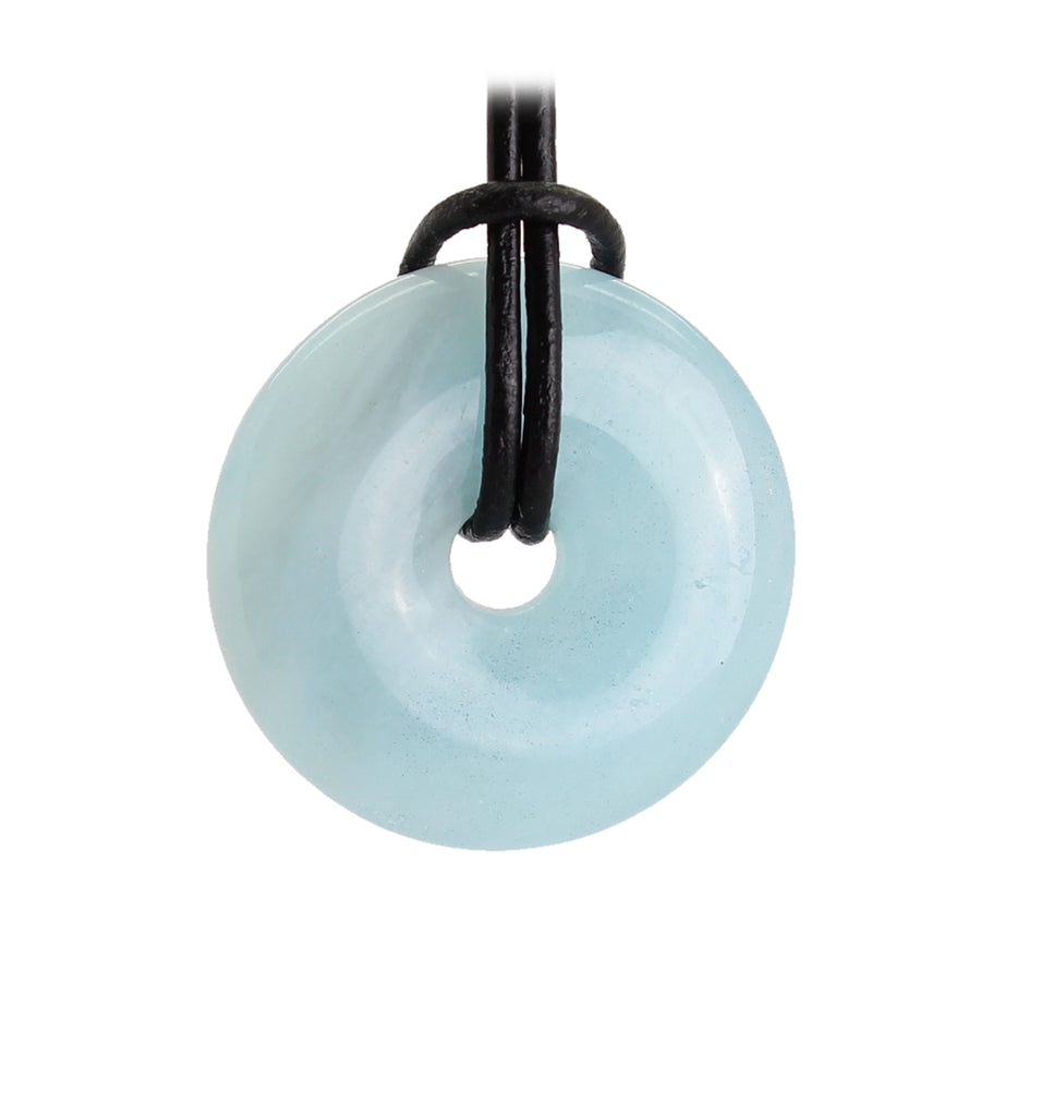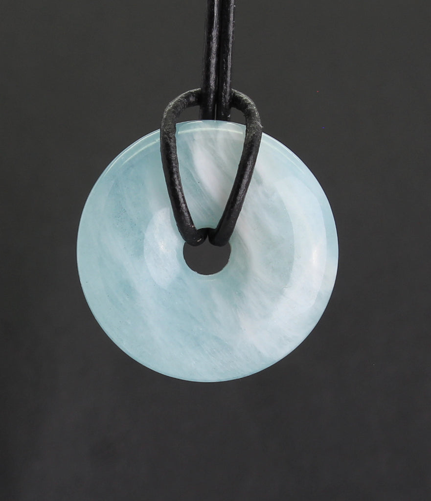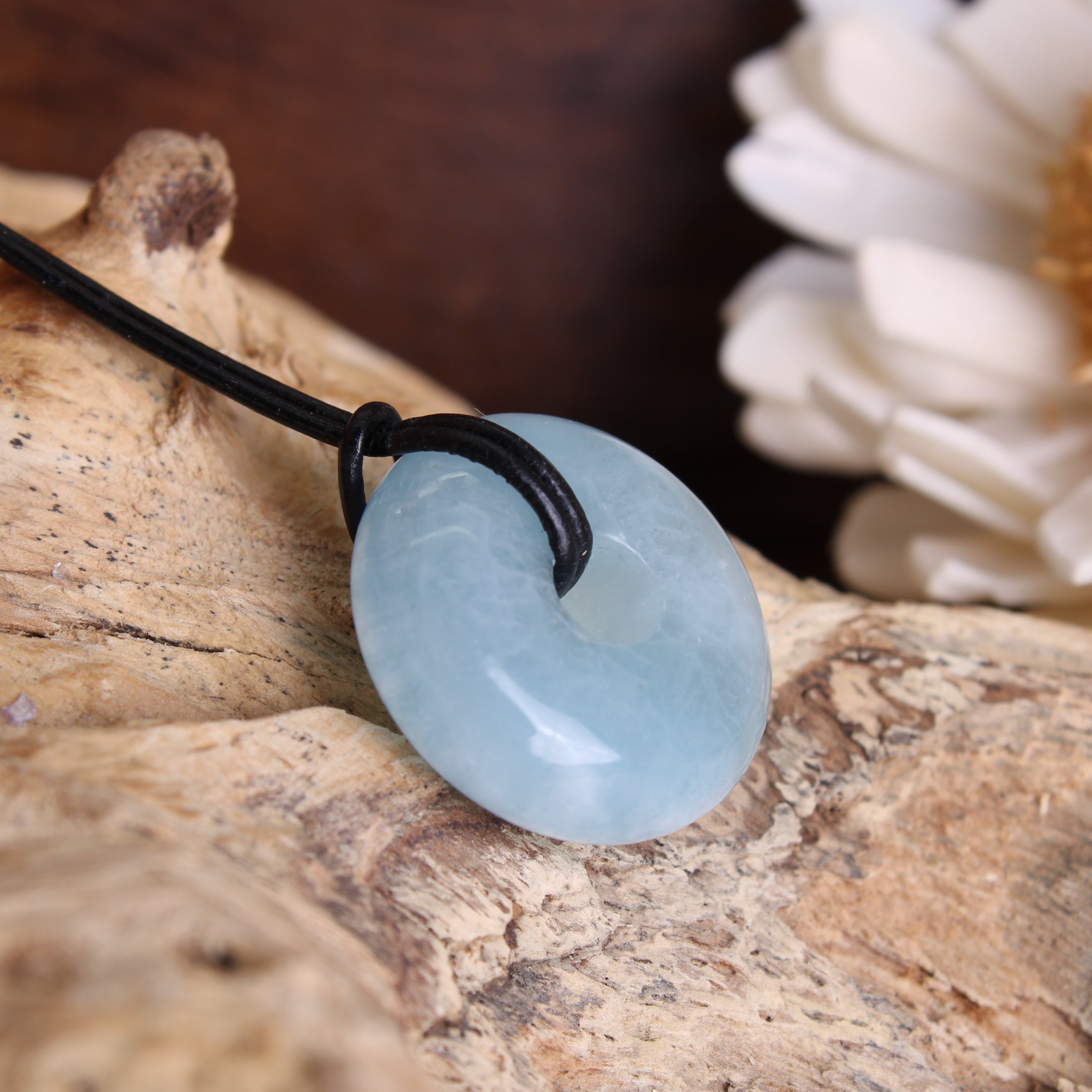 Kleiner Aquamarin Donut Anhänger – hellblau, echter Naturstein – inkl. 1m Lederband zum Kürzen – zarter Edelstein Schmuck in Geschenkbox – Heilstein & Glücksbringer