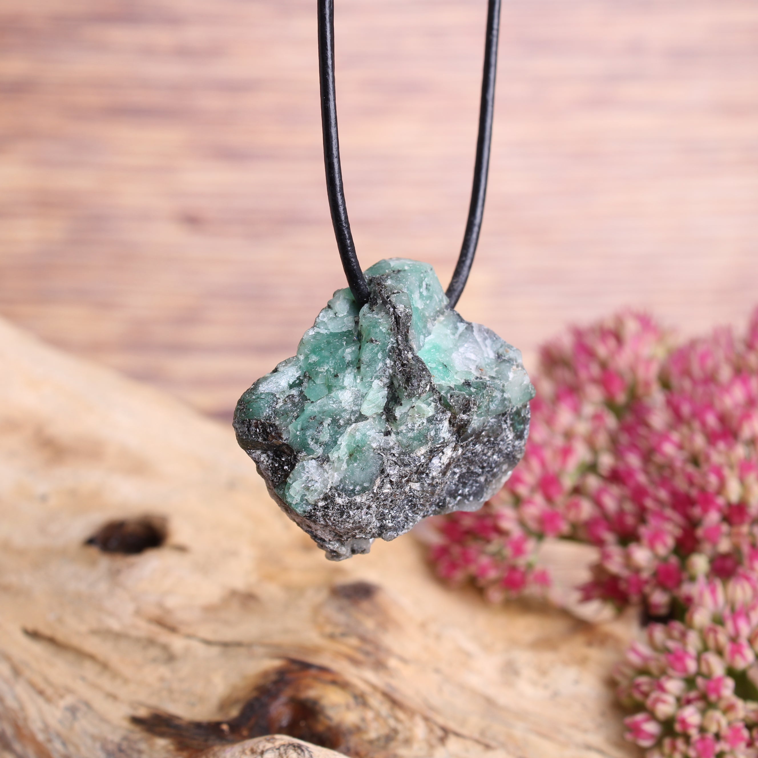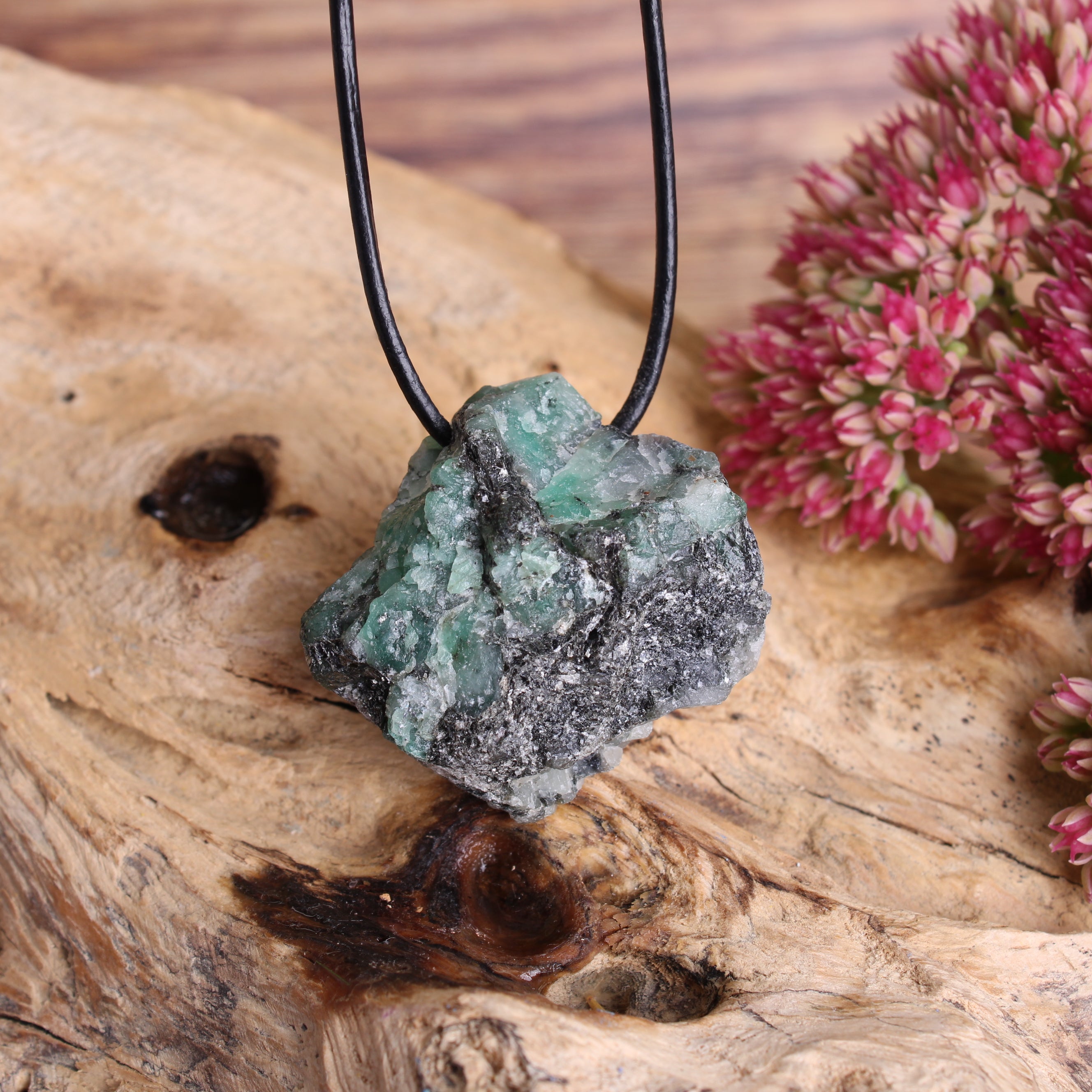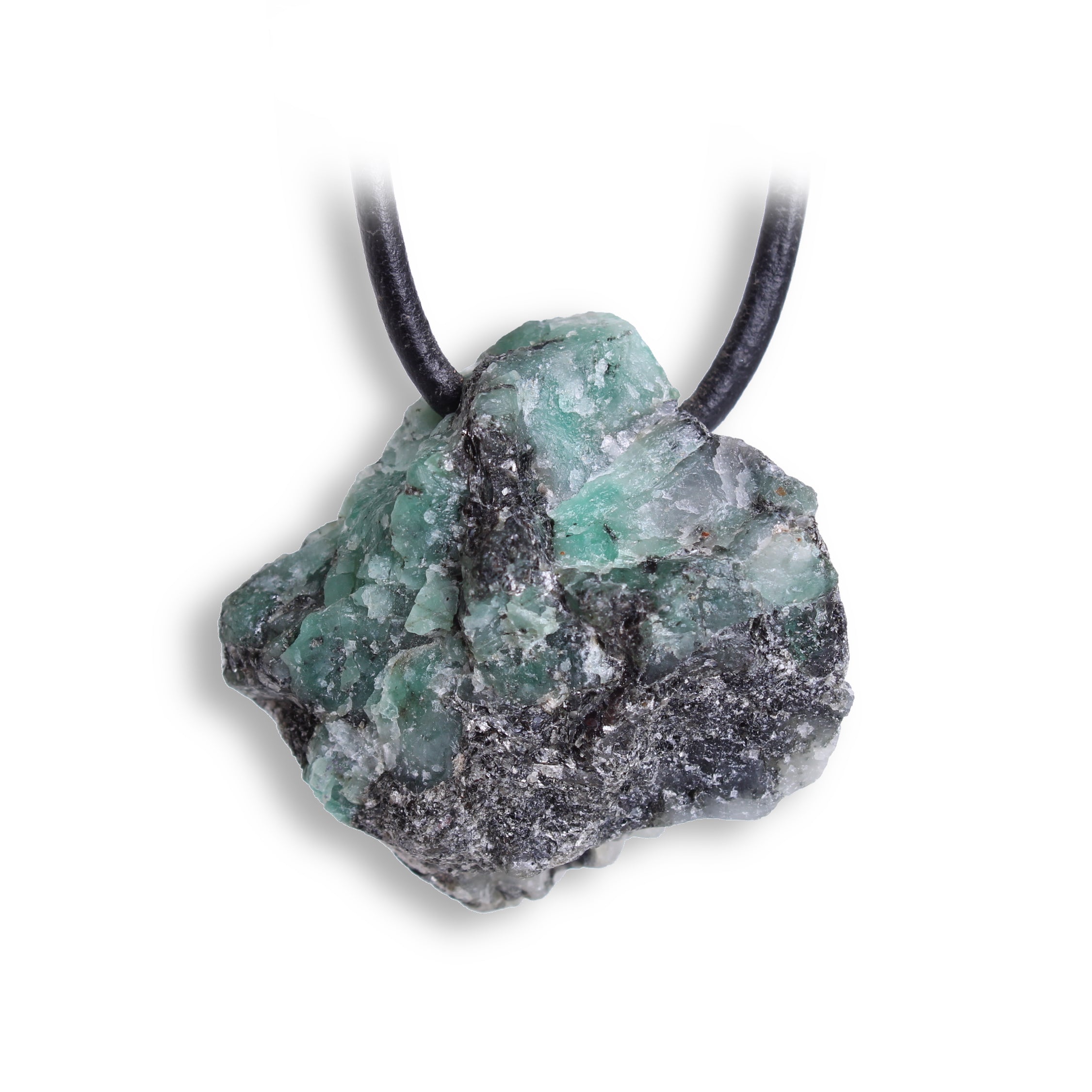 Smaragd im Muttergestein Anhänger Einzelstück gebohrt inkl. schwarzem Lederband 1 Meter in Organzasäckchen Rohstein Unikat Naturstein Edelstein Schmuck