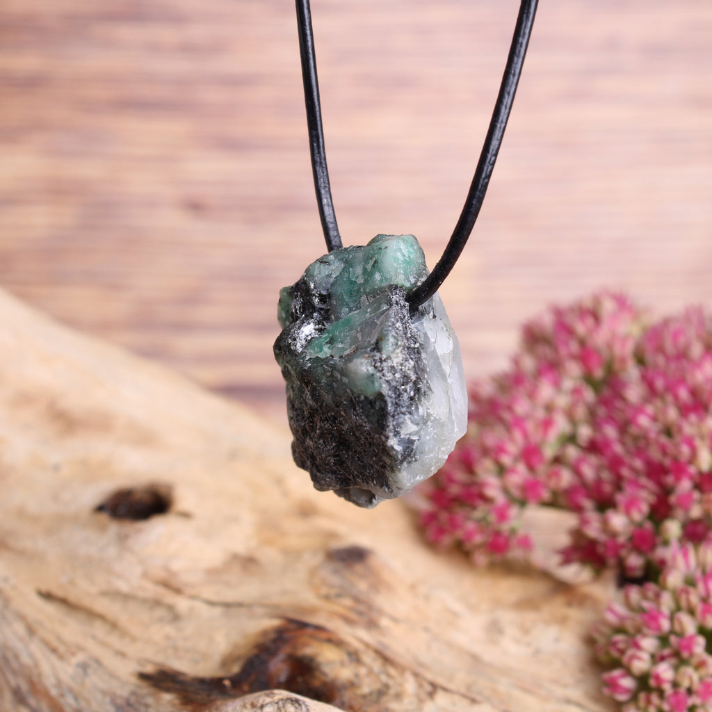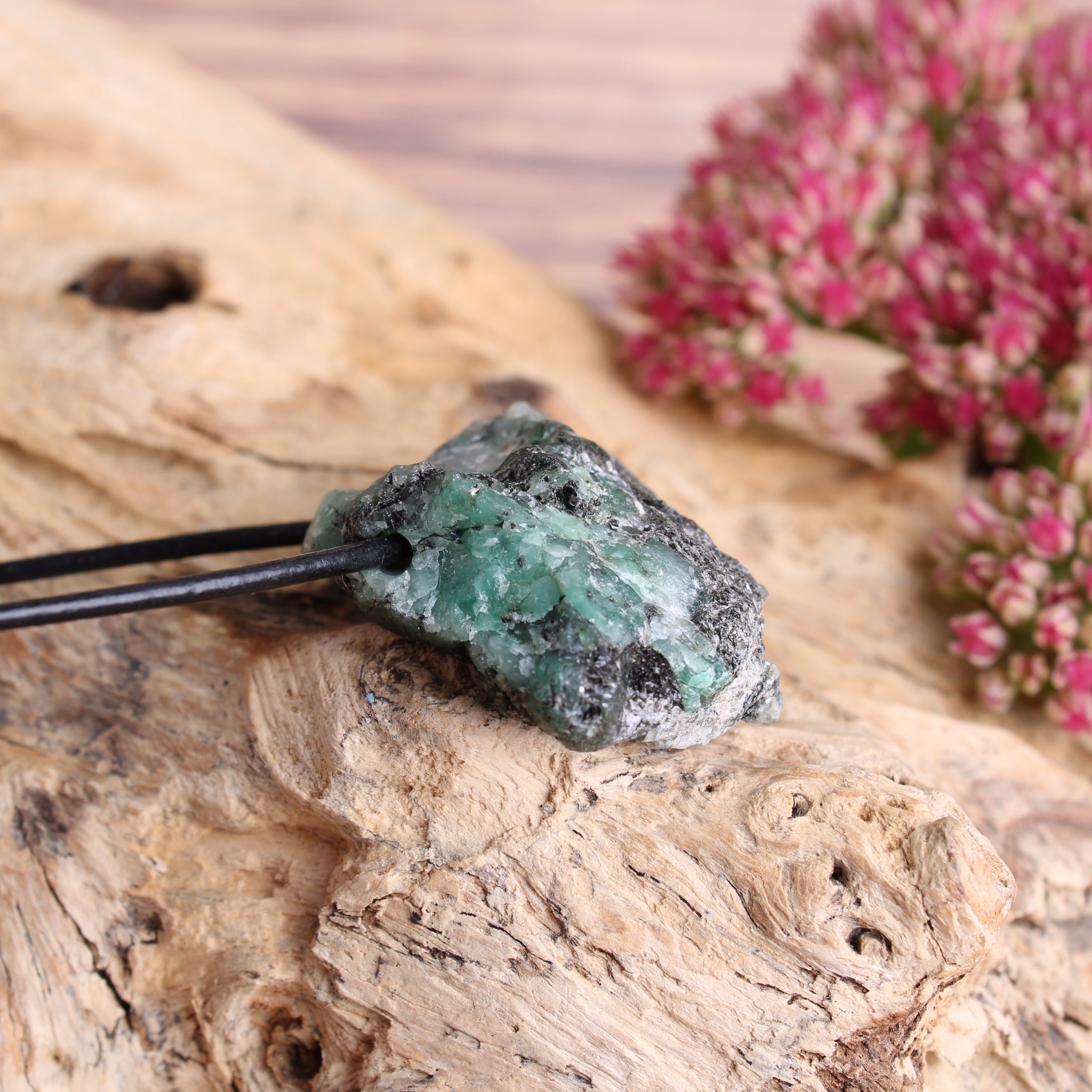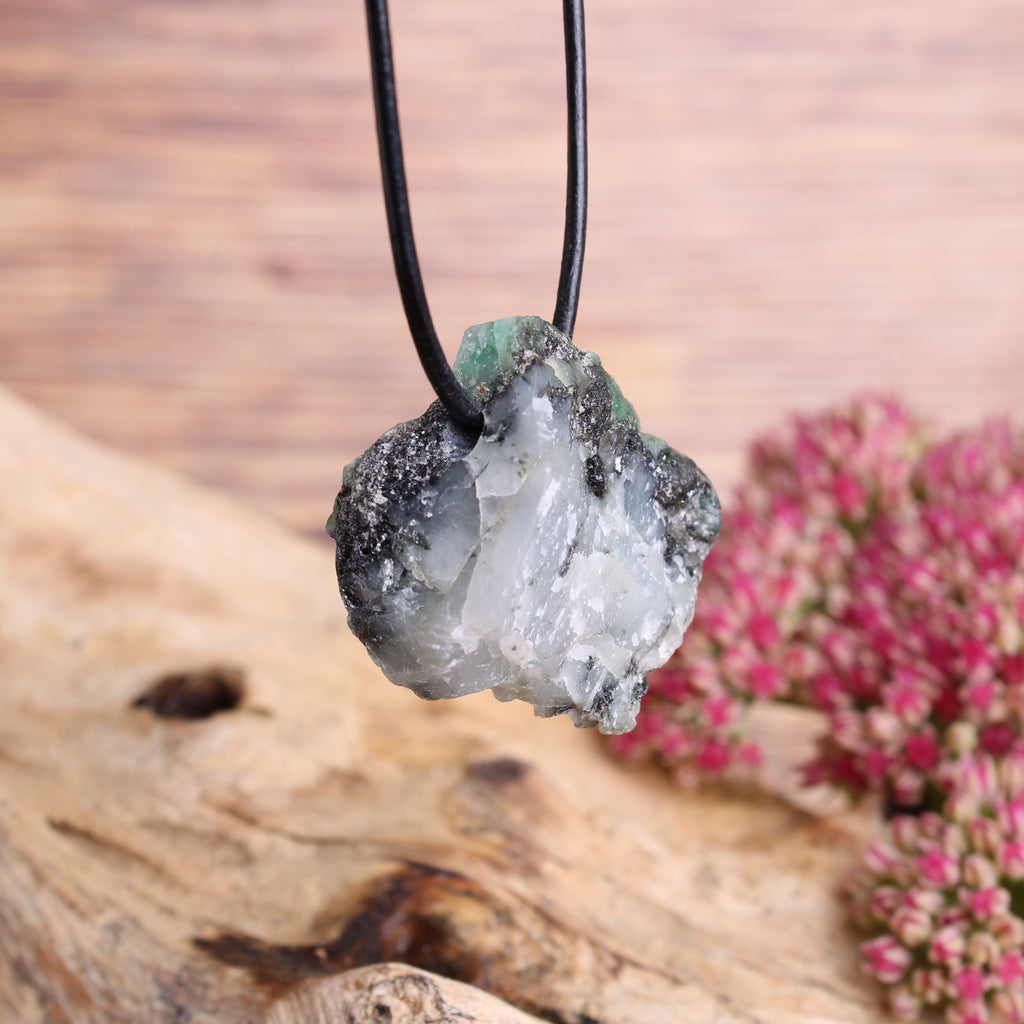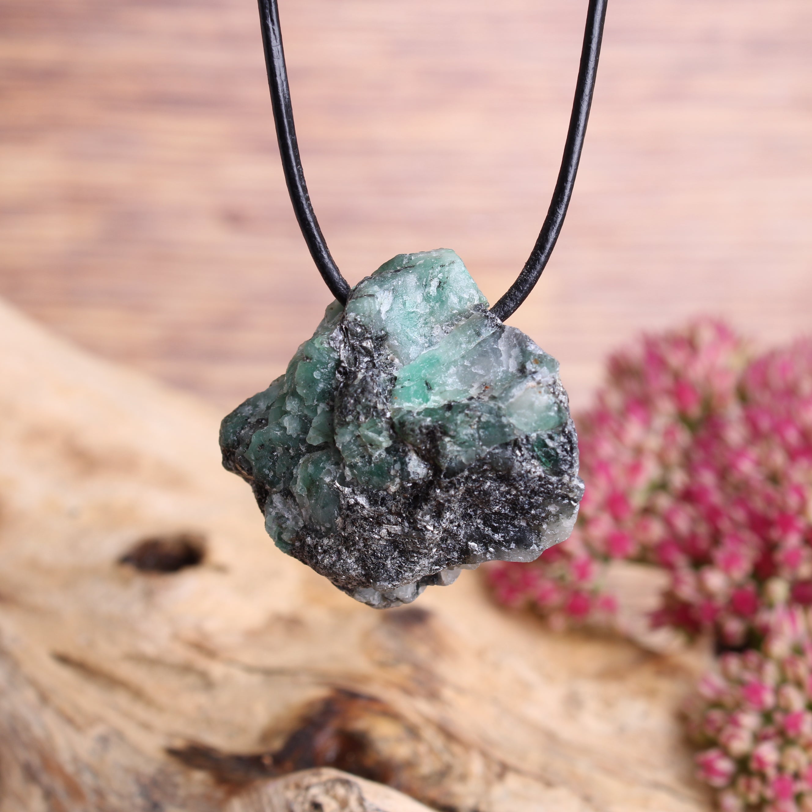 Smaragd im Muttergestein Anhänger Einzelstück gebohrt inkl. schwarzem Lederband 1 Meter in Organzasäckchen Rohstein Unikat Naturstein Edelstein Schmuck