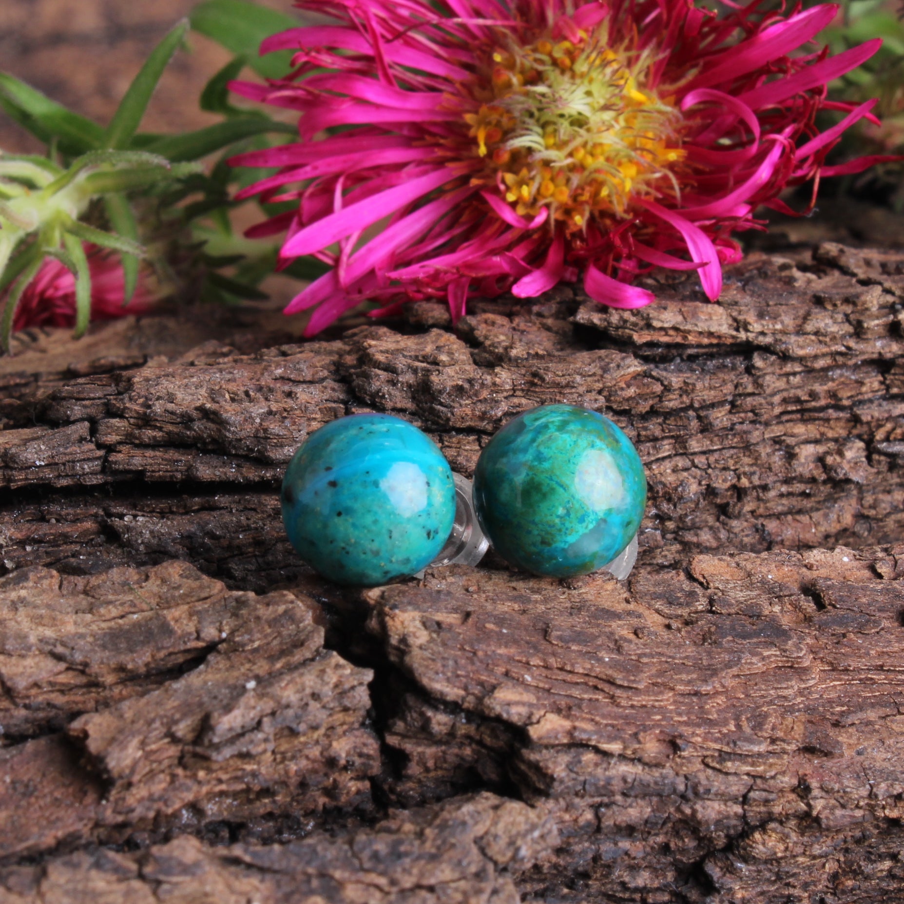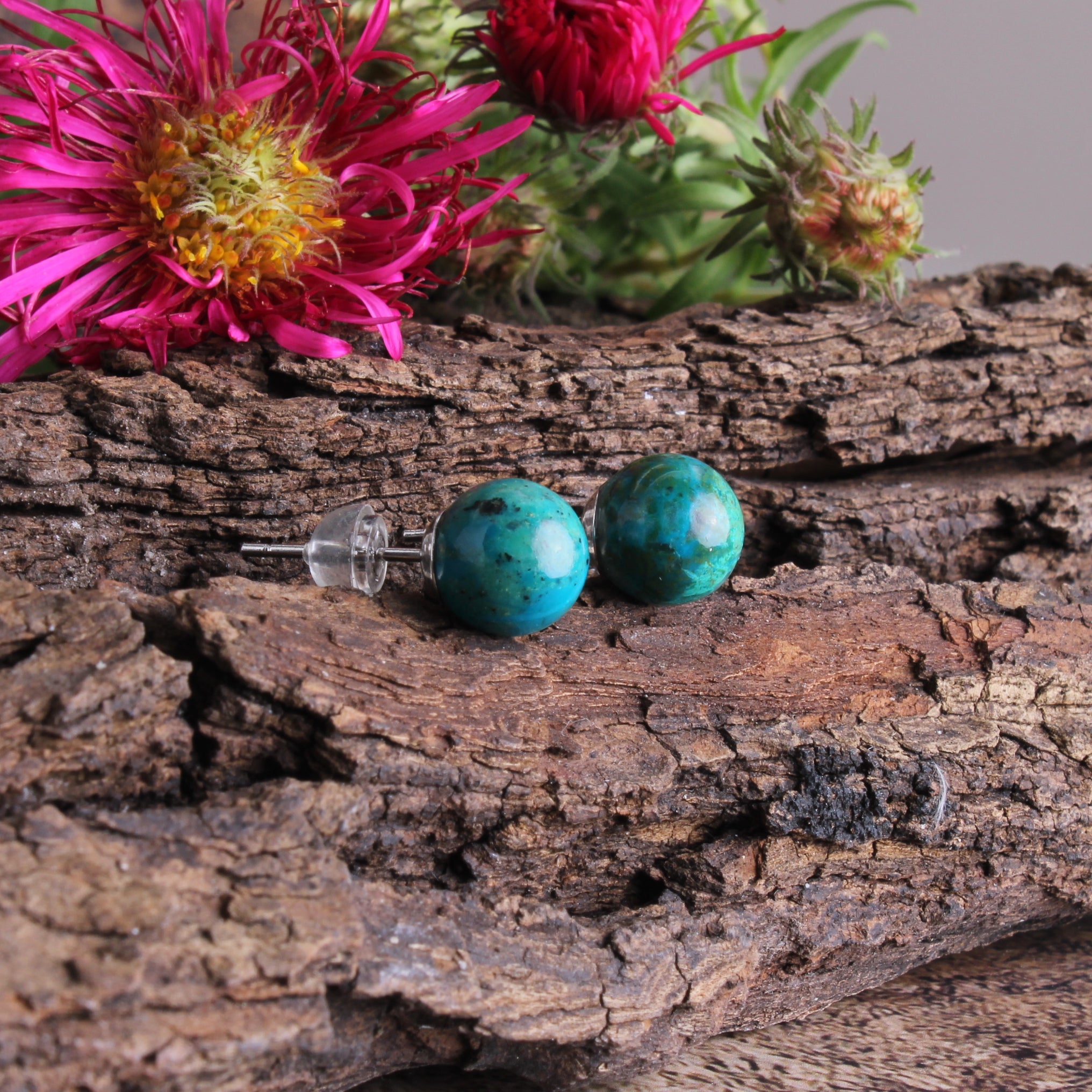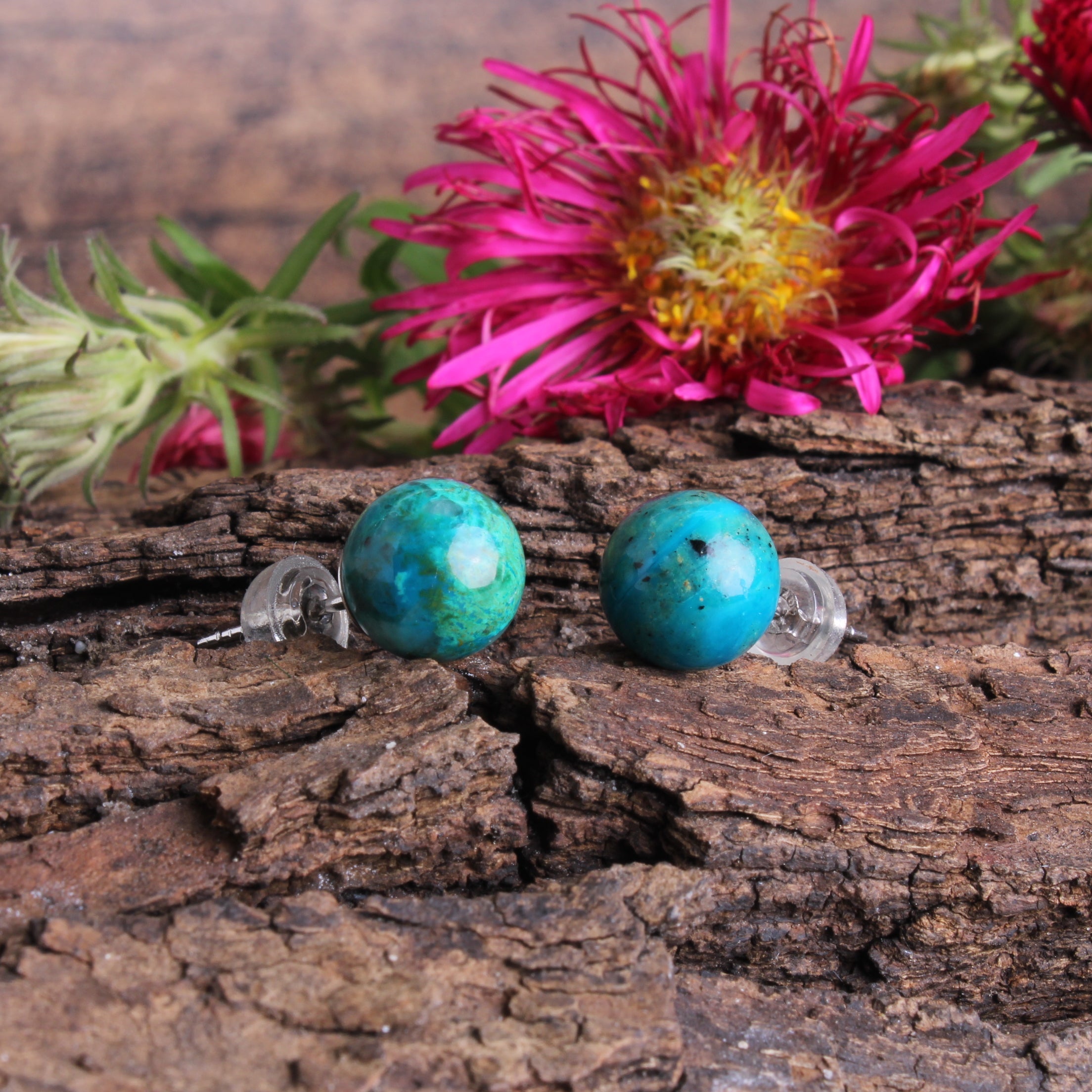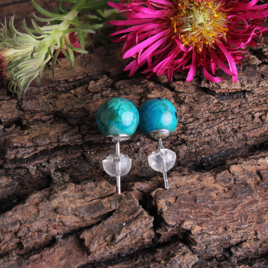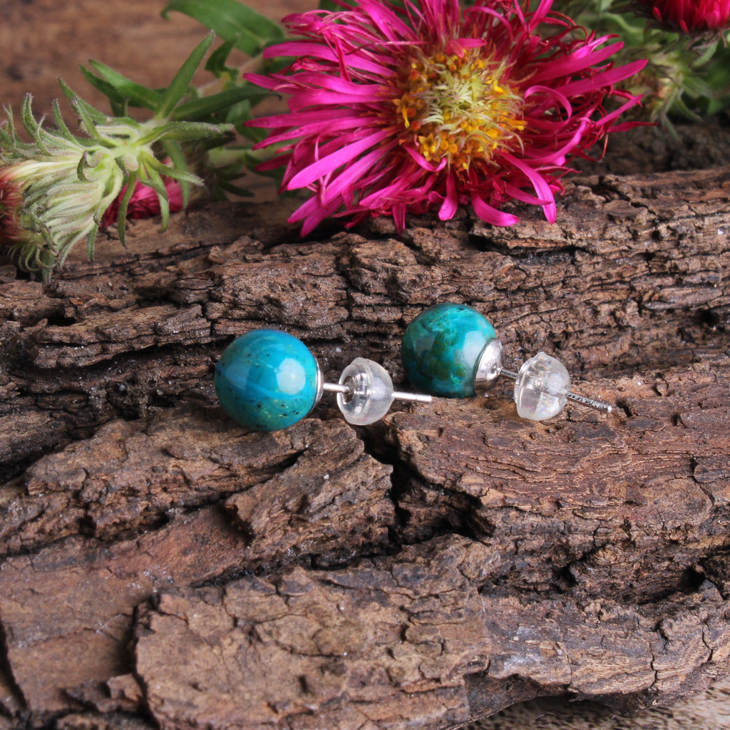 Chrysokoll Edelstein 8 mm Kugel Perle Ohrstecker Ohrringe Ohr Schmuck Stift aus 925er Sterling Silber - Unikat handgefertigt