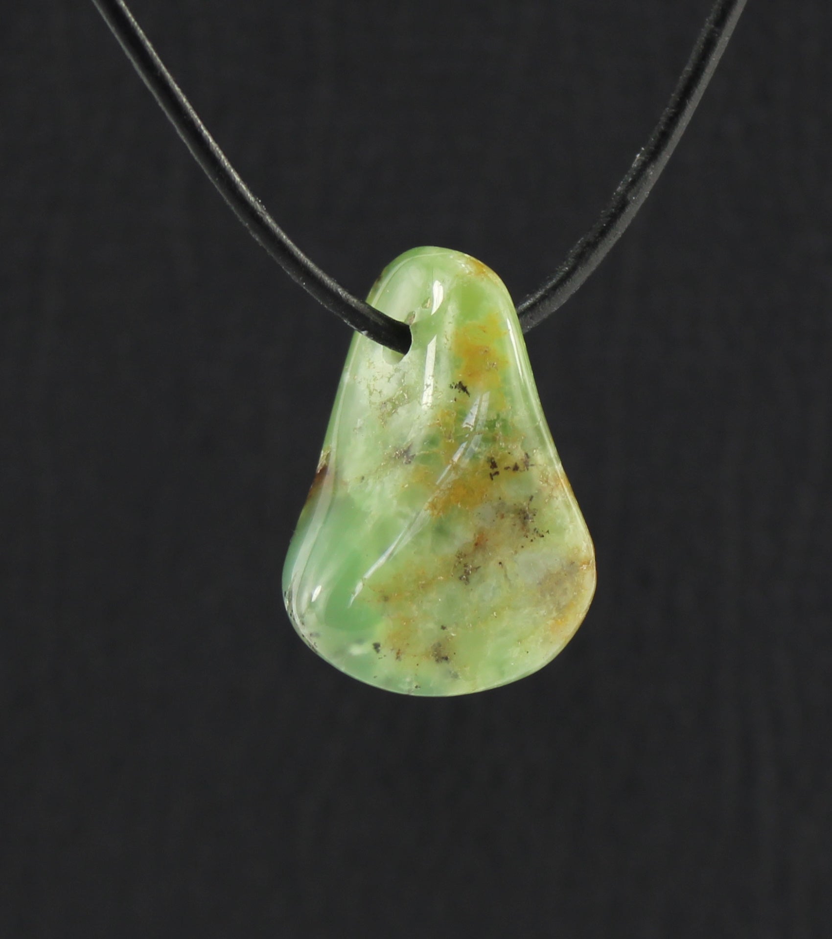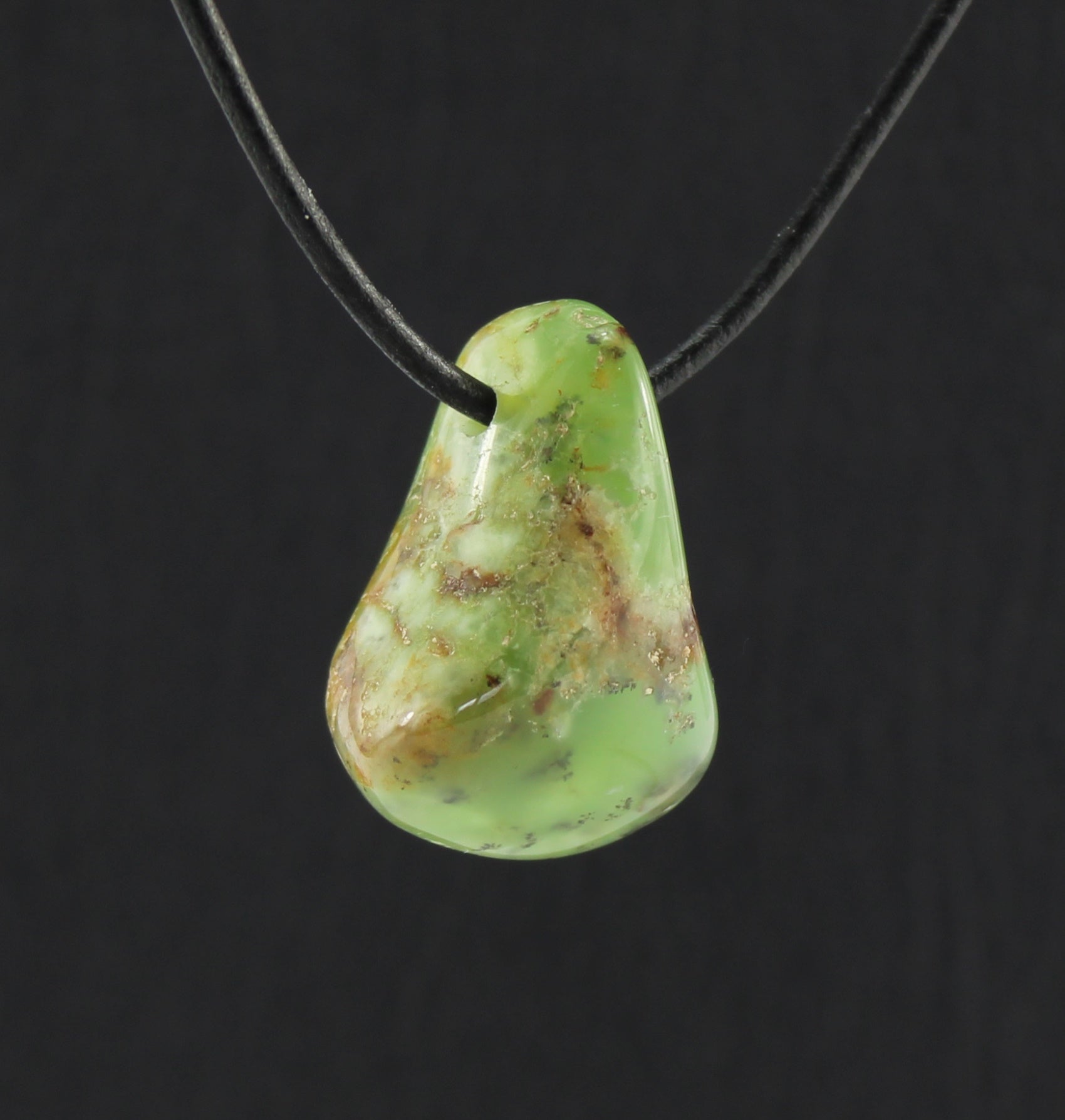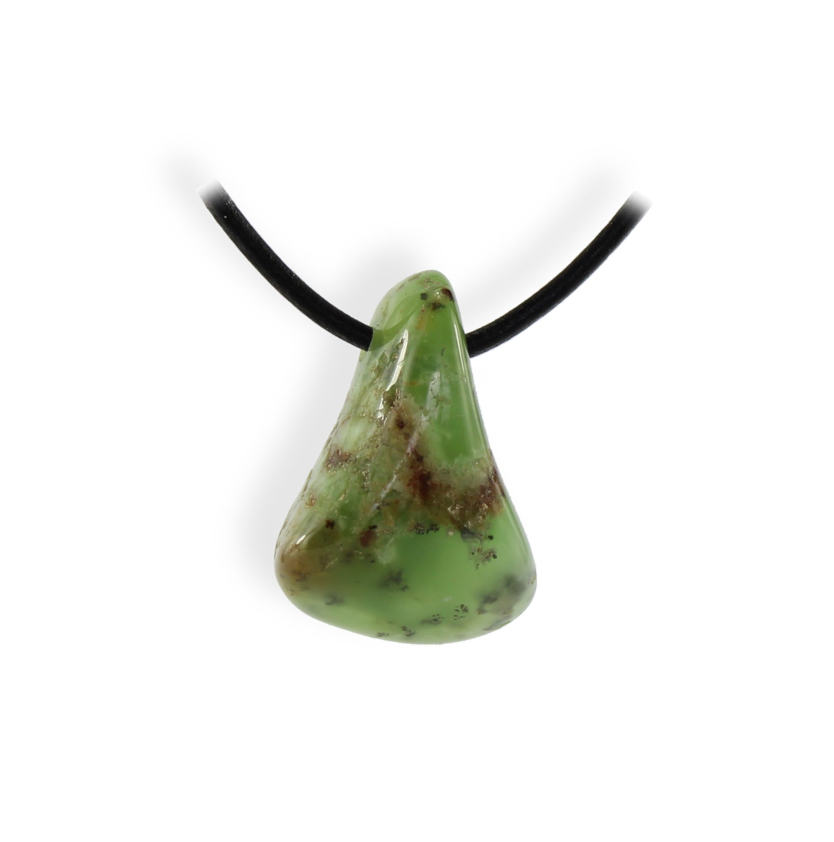 Chrysopras Trommelstein Anhänger – Einzelstück ca. 42×18 mm, gebohrt, inkl. 1 m Lederband & Geschenkschachtel