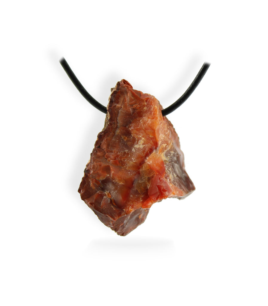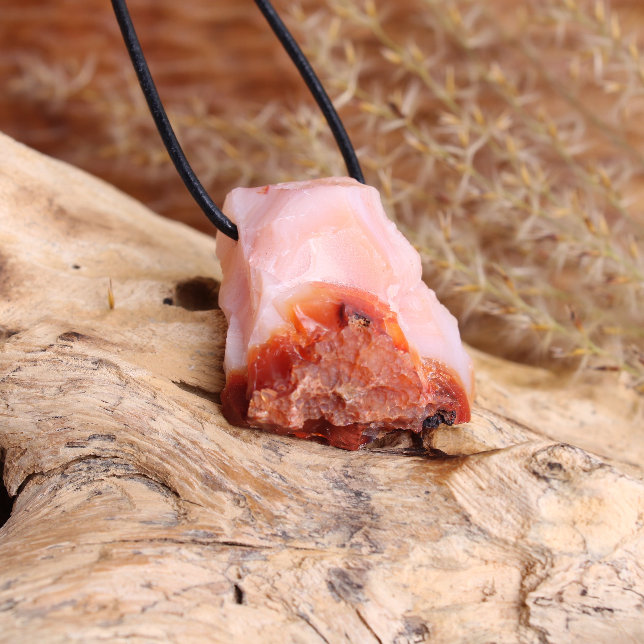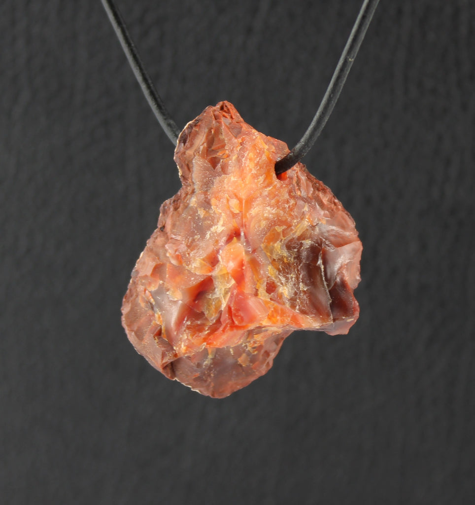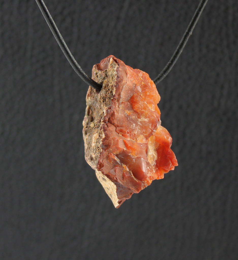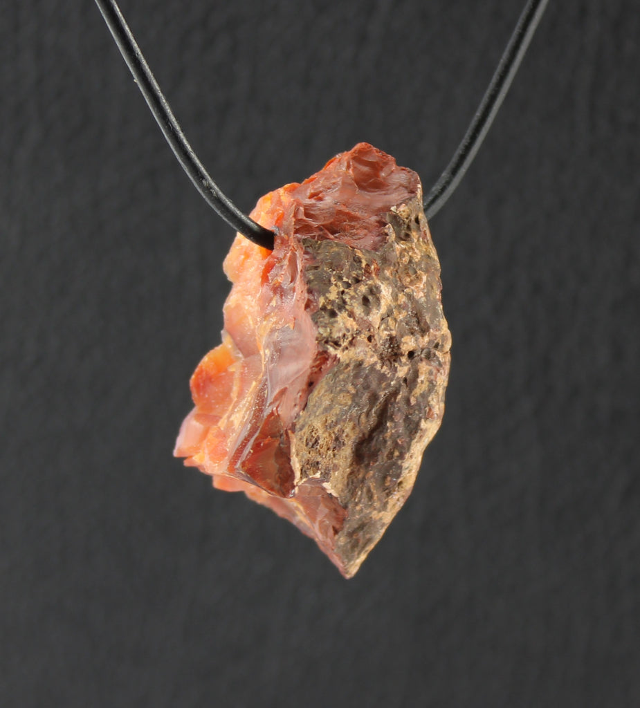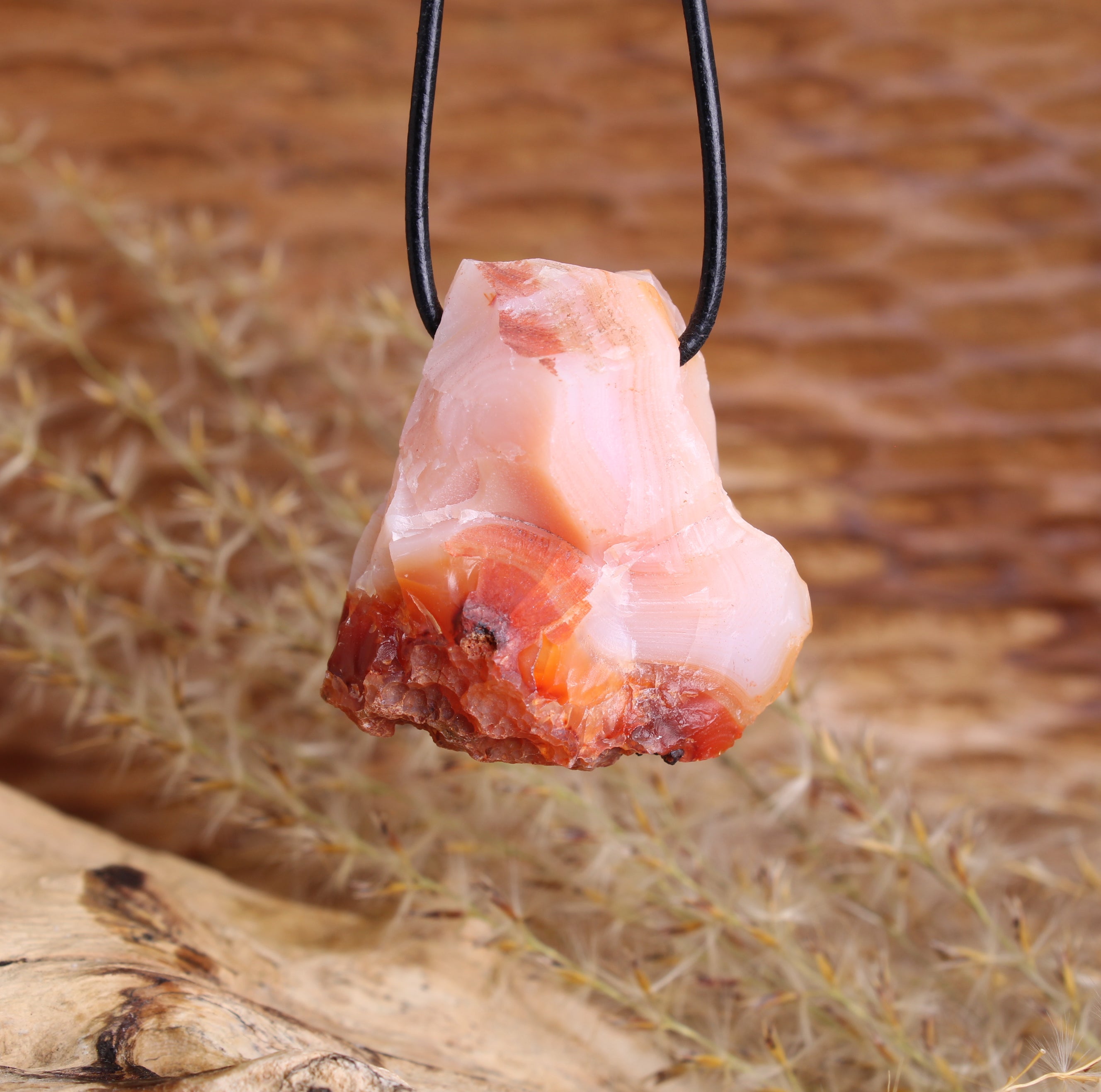 Karneol Anhänger Einzelstück wie abgebildet Rohstein gebohrt mit 1 m schwarzem Lederband zum Kürzen Lieferung im Organza Beutel