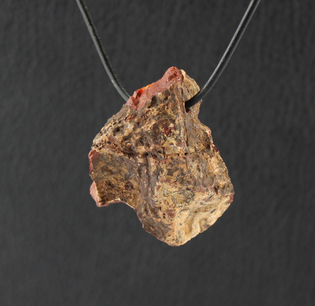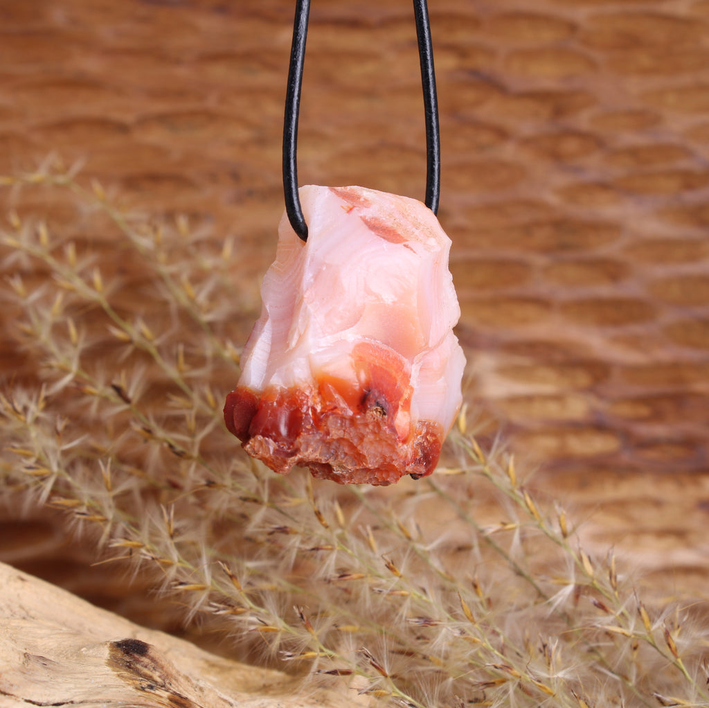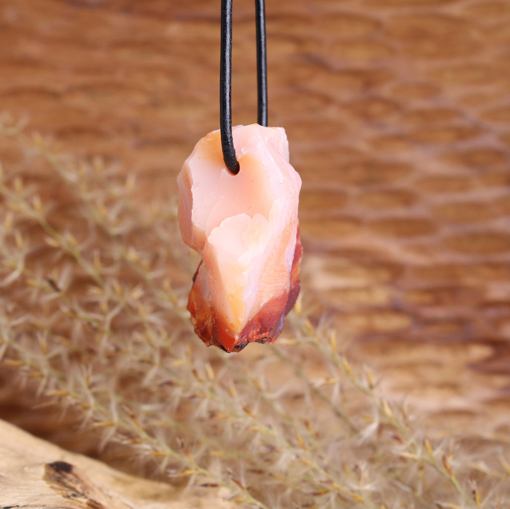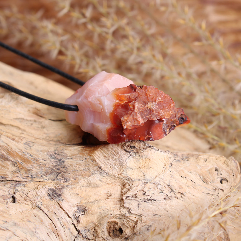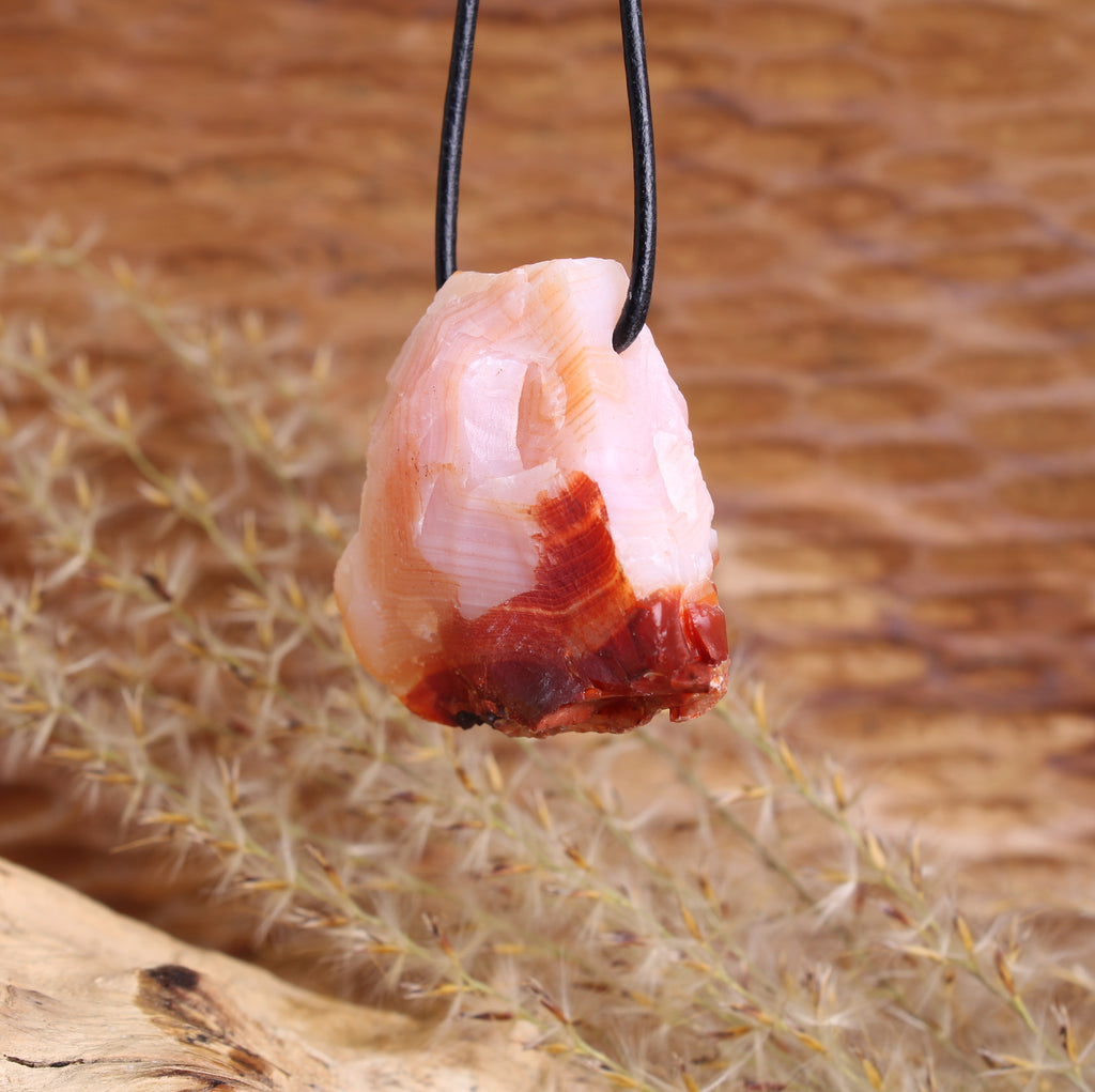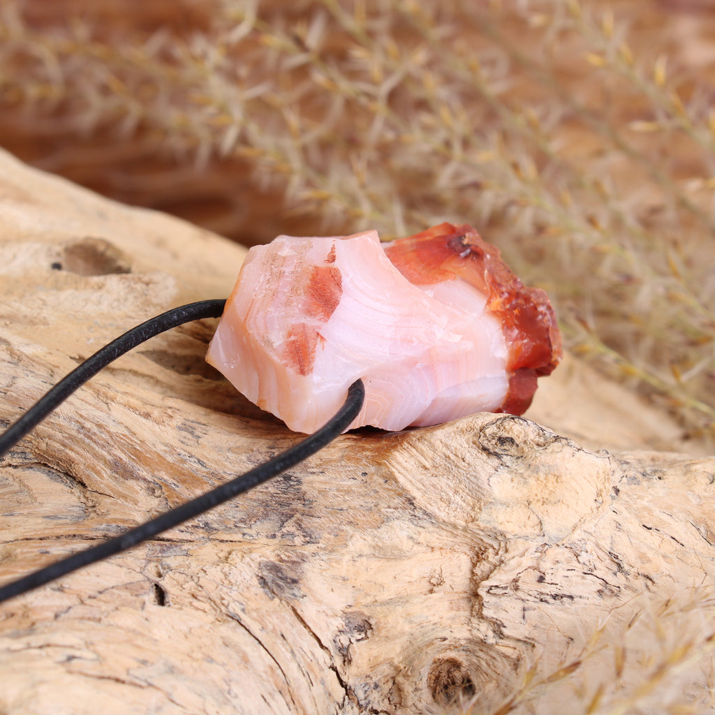 Karneol Anhänger Einzelstück wie abgebildet Rohstein gebohrt mit 1 m schwarzem Lederband zum Kürzen Lieferung im Organza Beutel