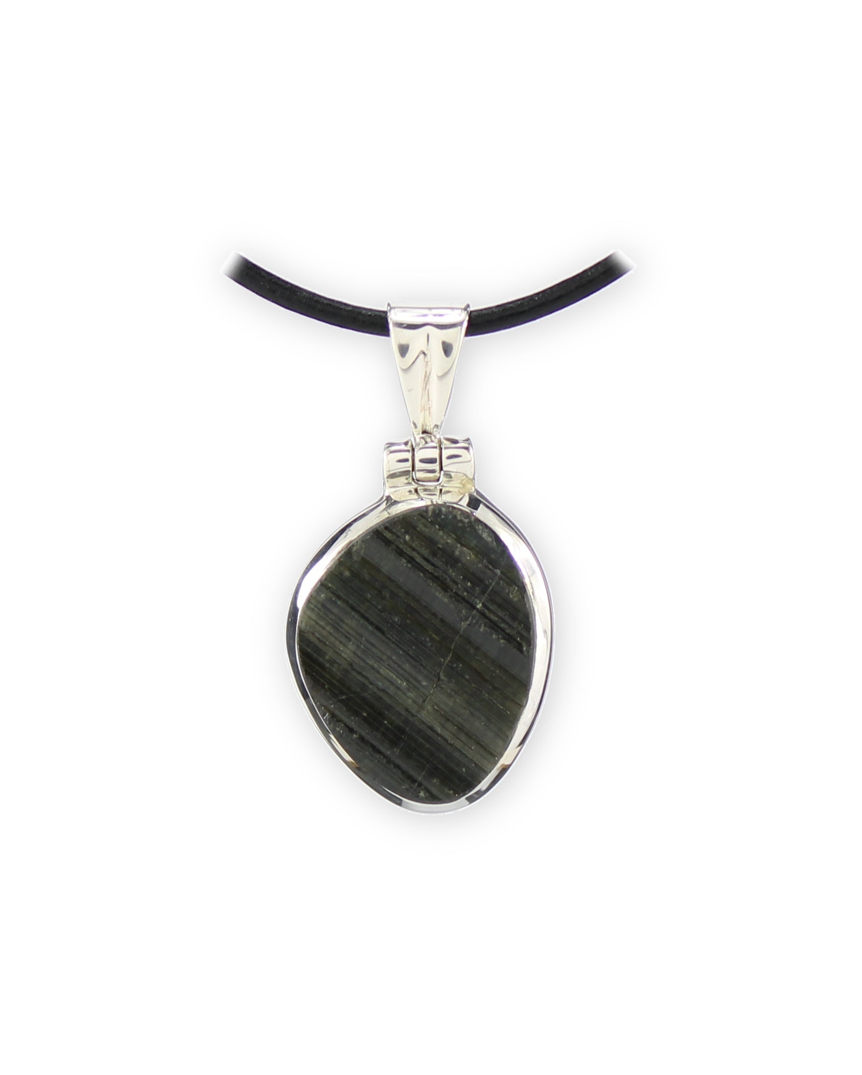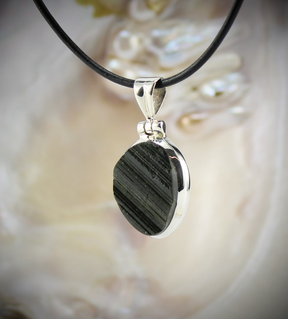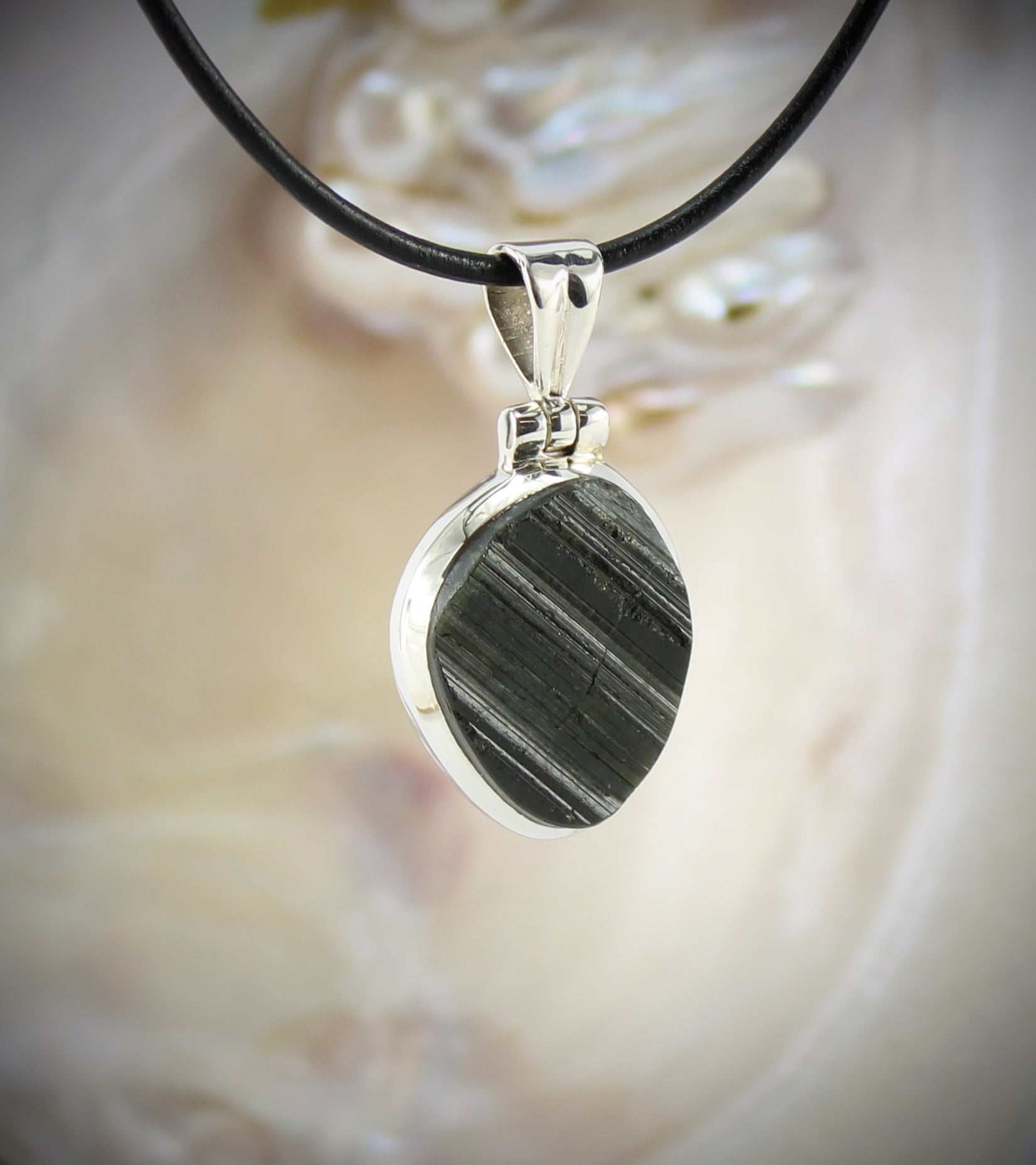 Grüner Turmalin Rohstein Anhänger Tropfenform 925 Sterling Silber mit Lederband kürzbar Naturstein Unikat Schmuck in Geschenkschachtel