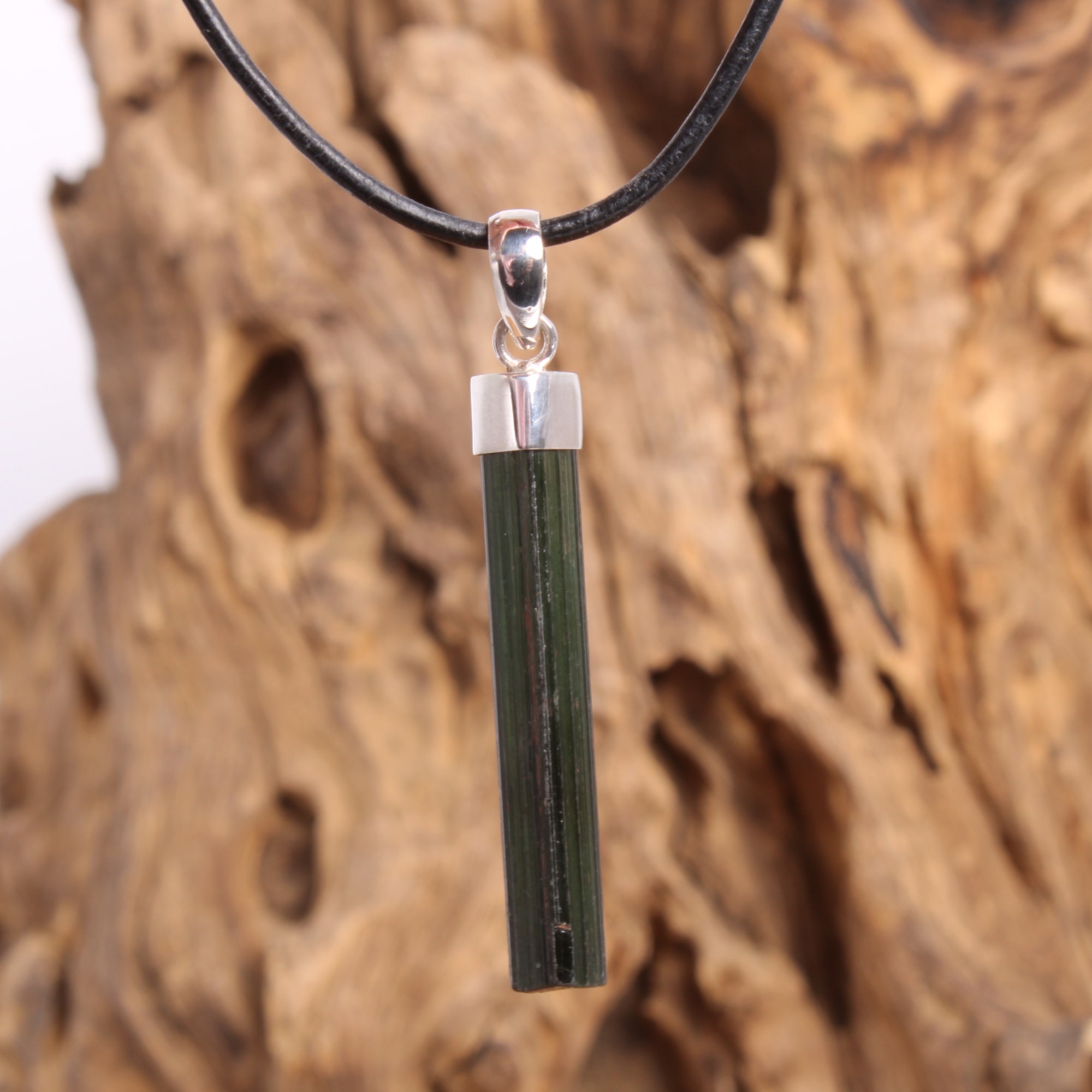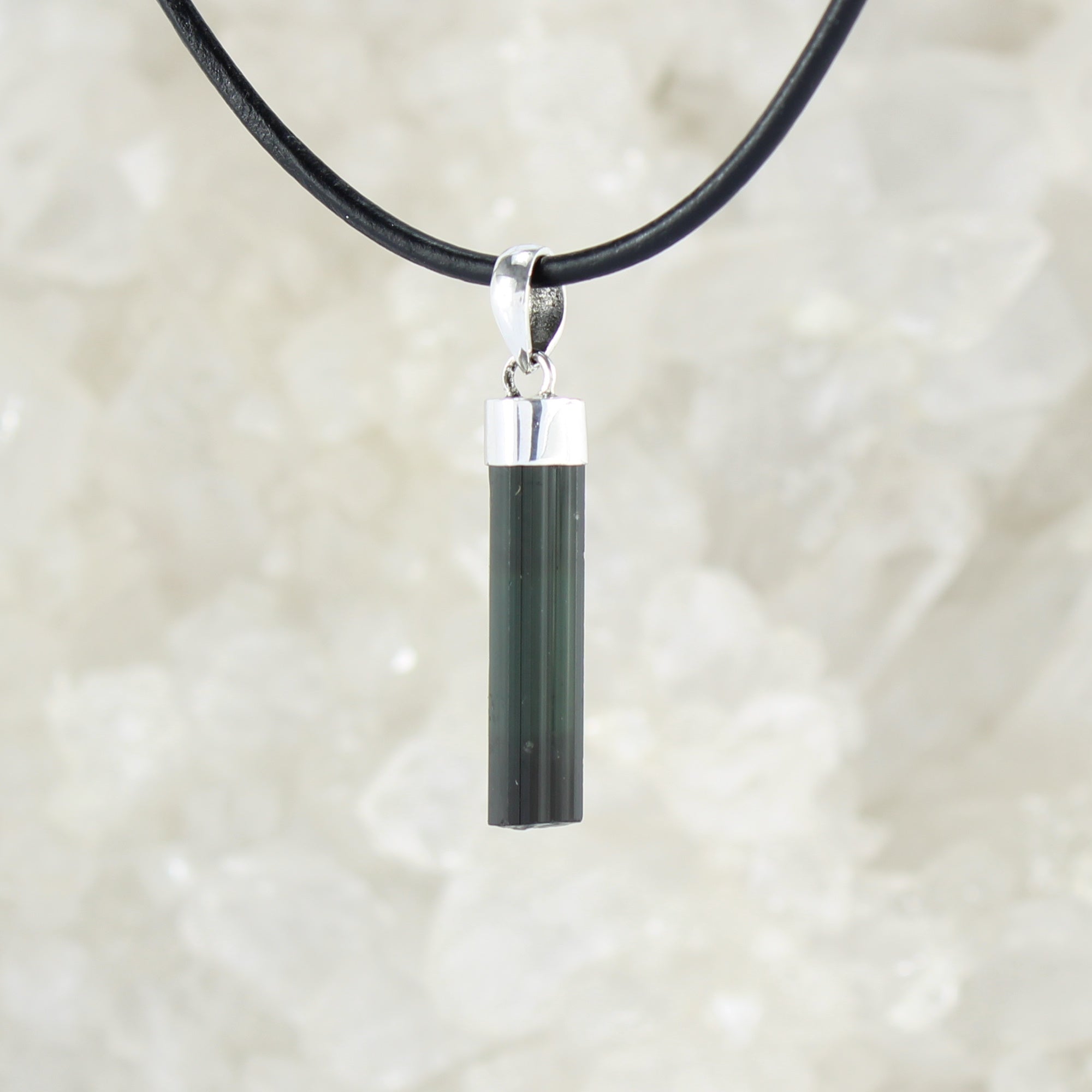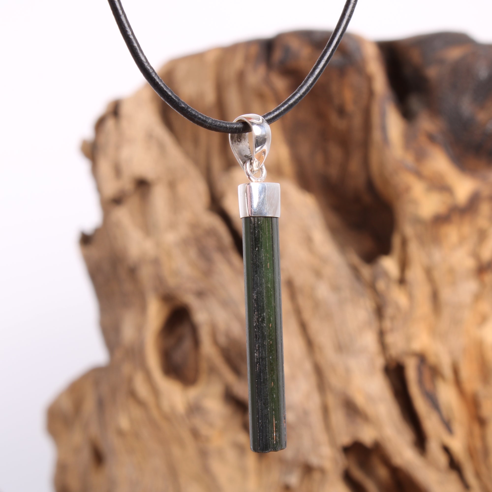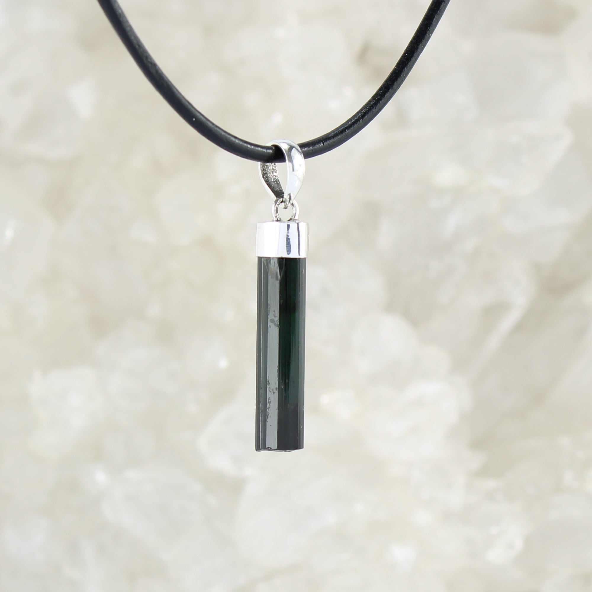 Turmalin Kristall Anhänger – Grüner Verdelit ca. 33×6 mm, 925 Silberfassung, inkl. 1 m Lederband & Geschenkschachtel