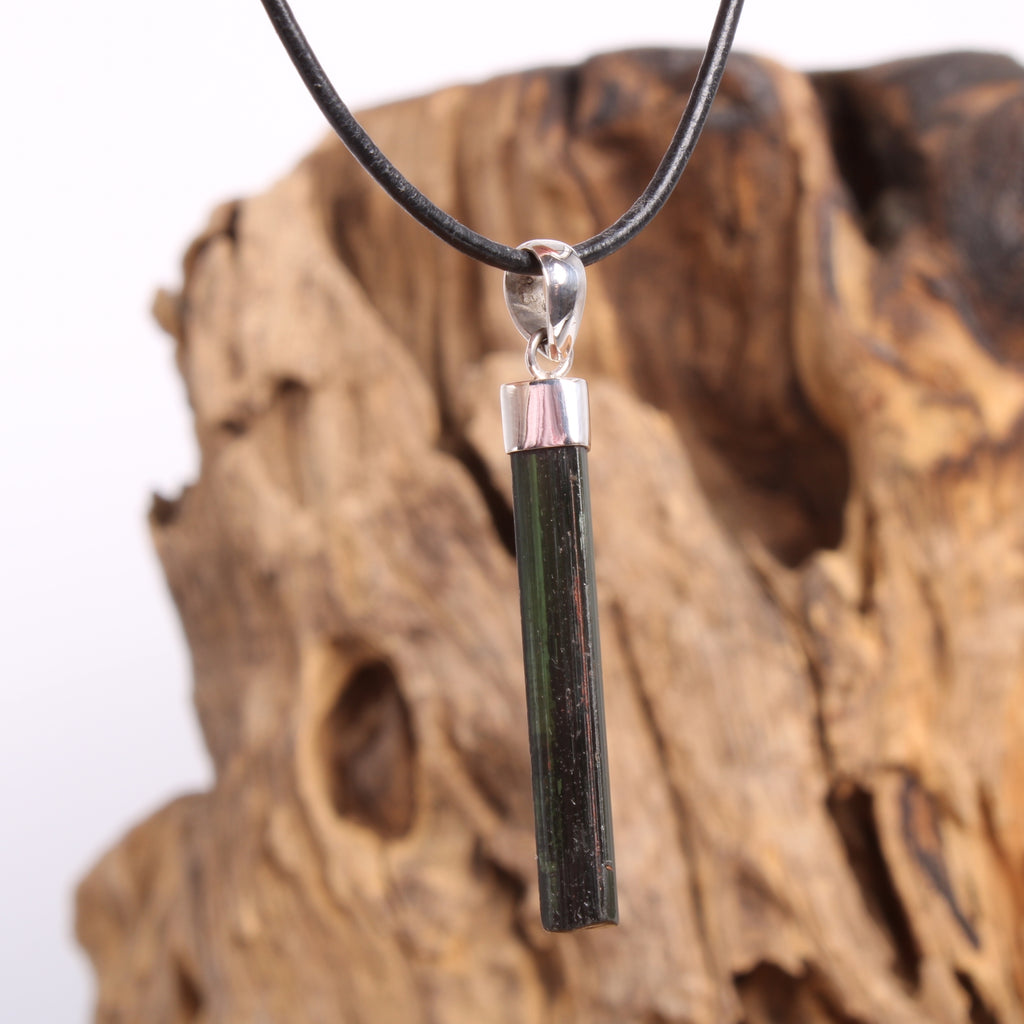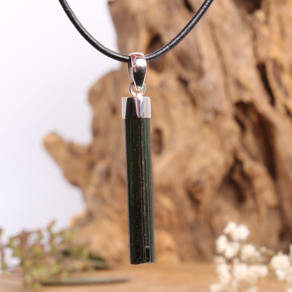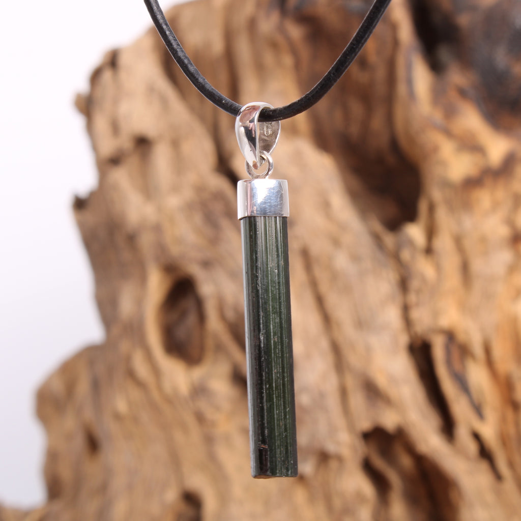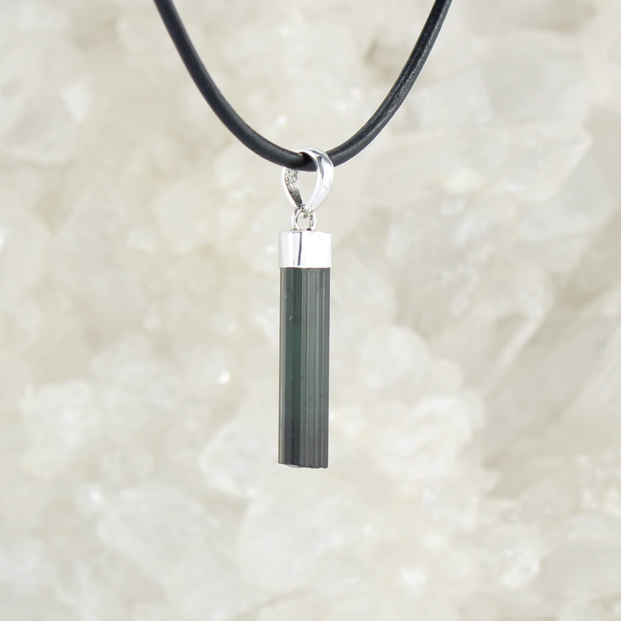 Turmalin Kristall Anhänger – Grüner Verdelit ca. 33×6 mm, 925 Silberfassung, inkl. 1 m Lederband & Geschenkschachtel