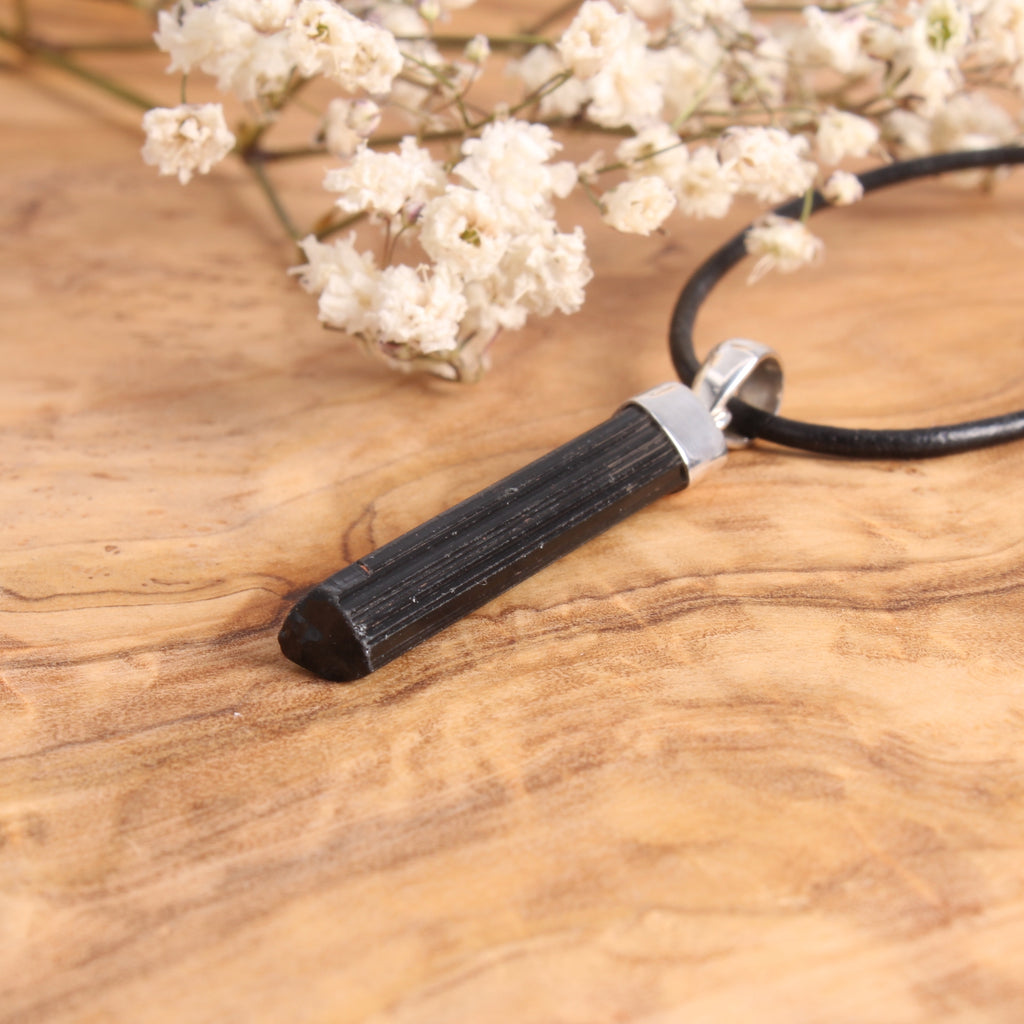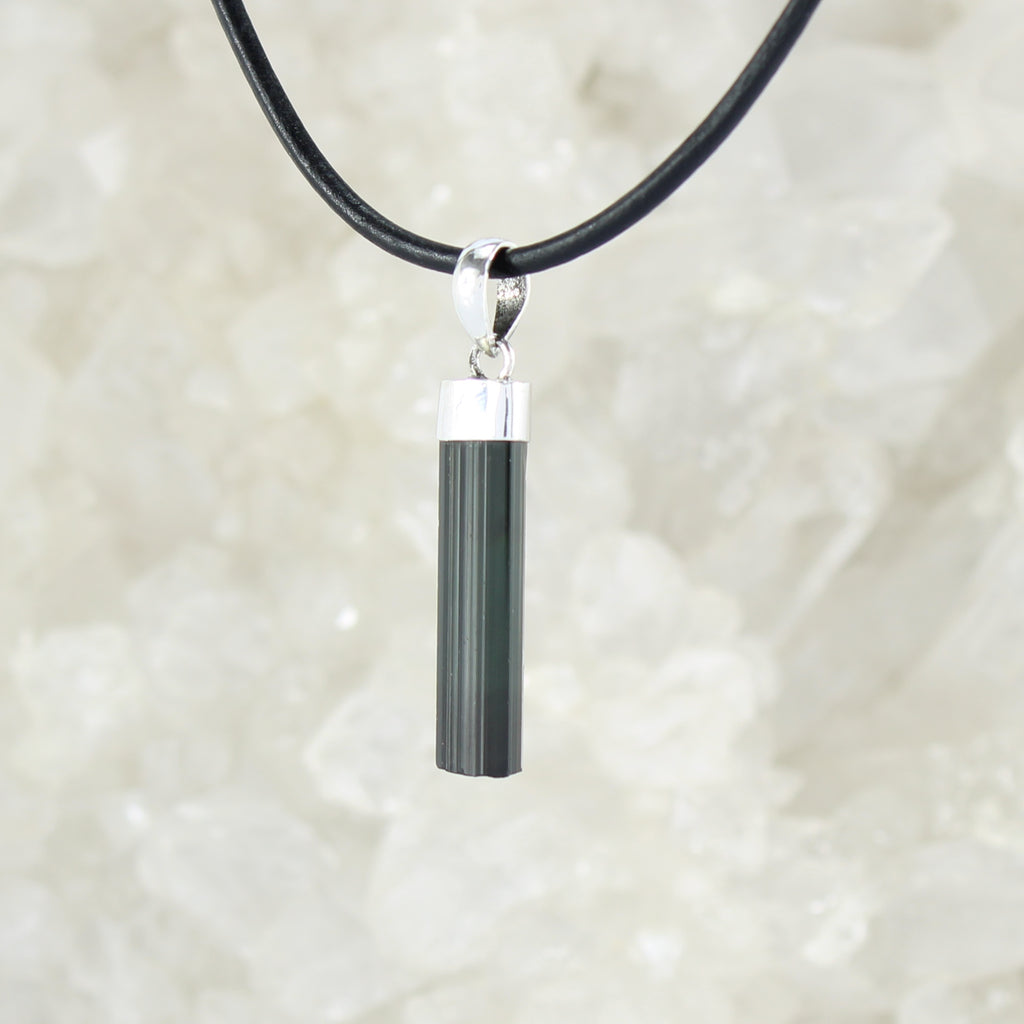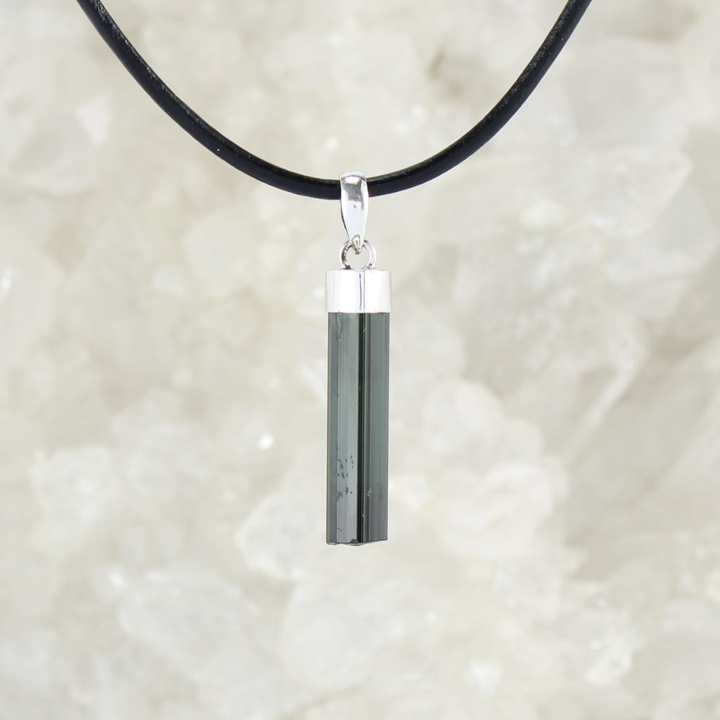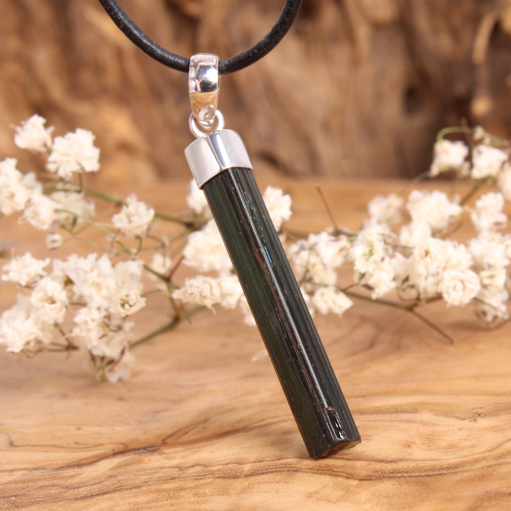 Turmalin Kristall Anhänger – Grüner Verdelit ca. 33×6 mm, 925 Silberfassung, inkl. 1 m Lederband & Geschenkschachtel