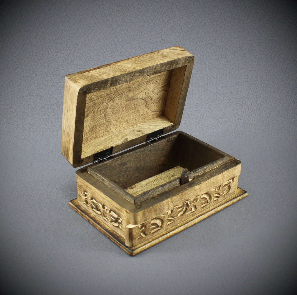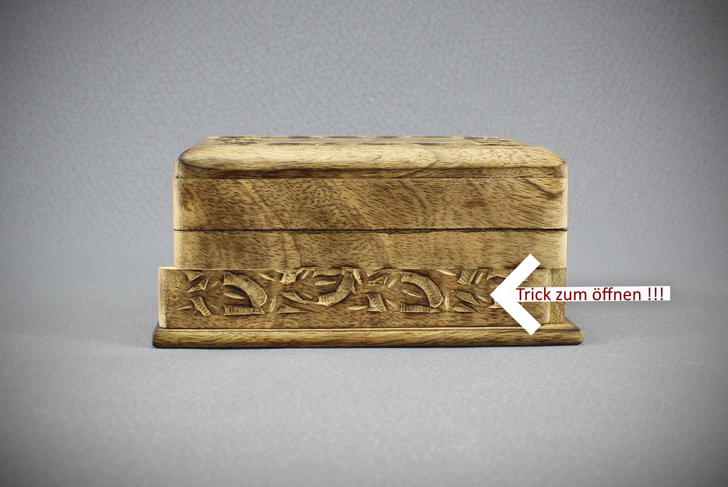Holzbox Trickbox aus Mangoholz mit Blumenornament Schatulle mit Trick zum Öffnen Holztruhe Holzkiste Trickbox