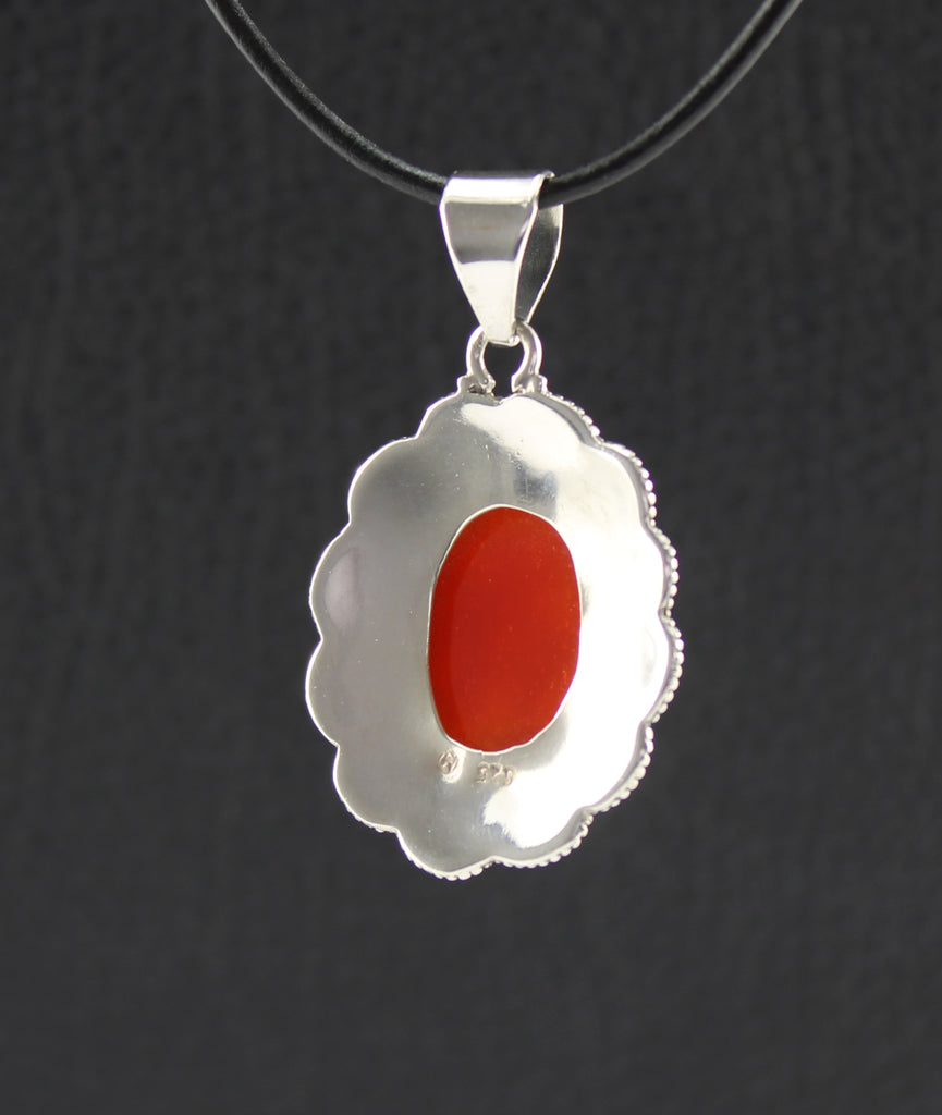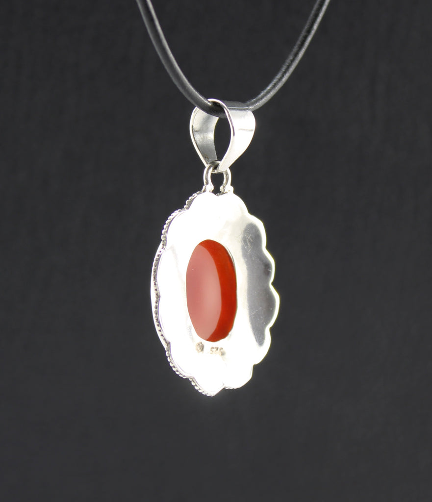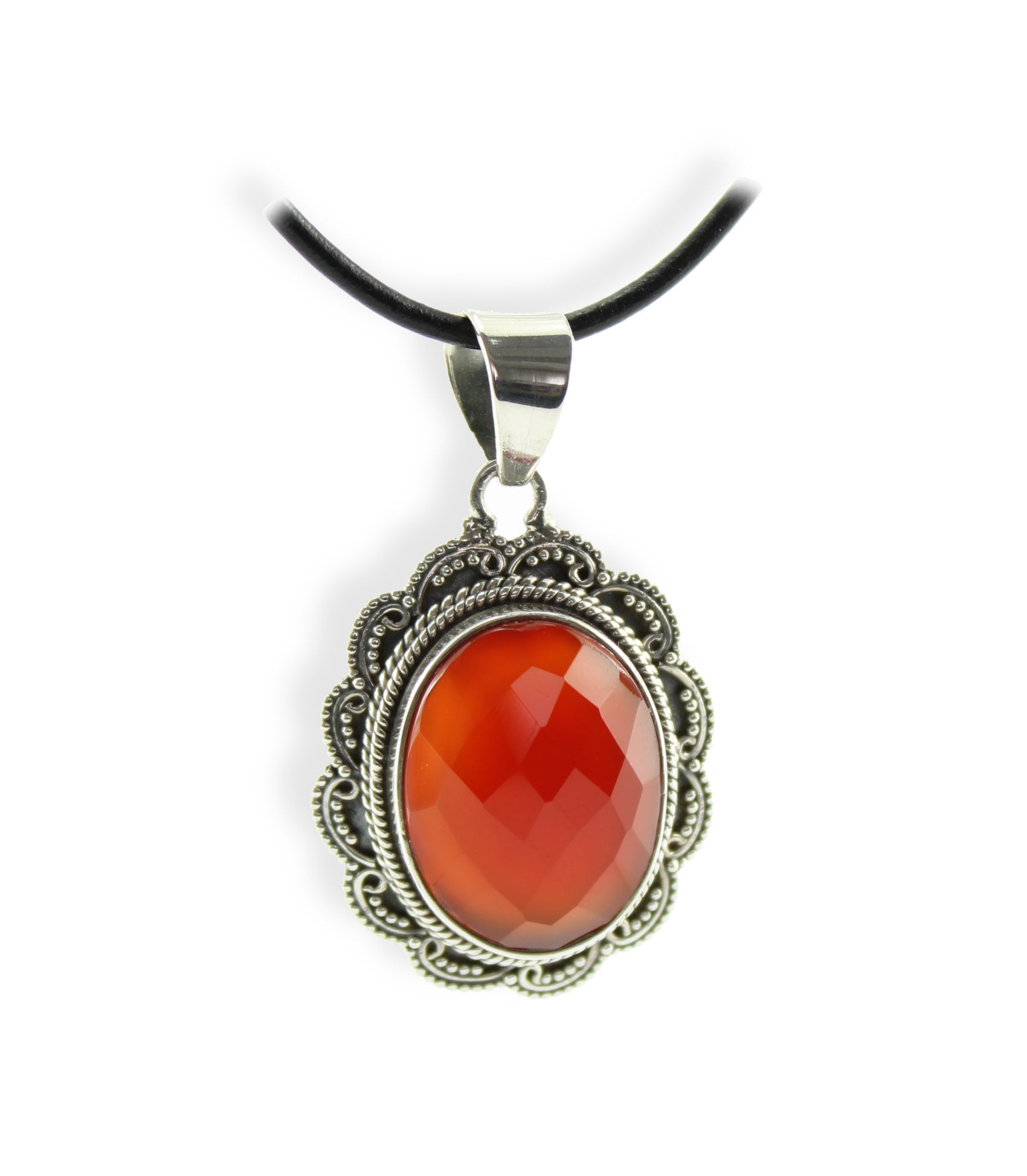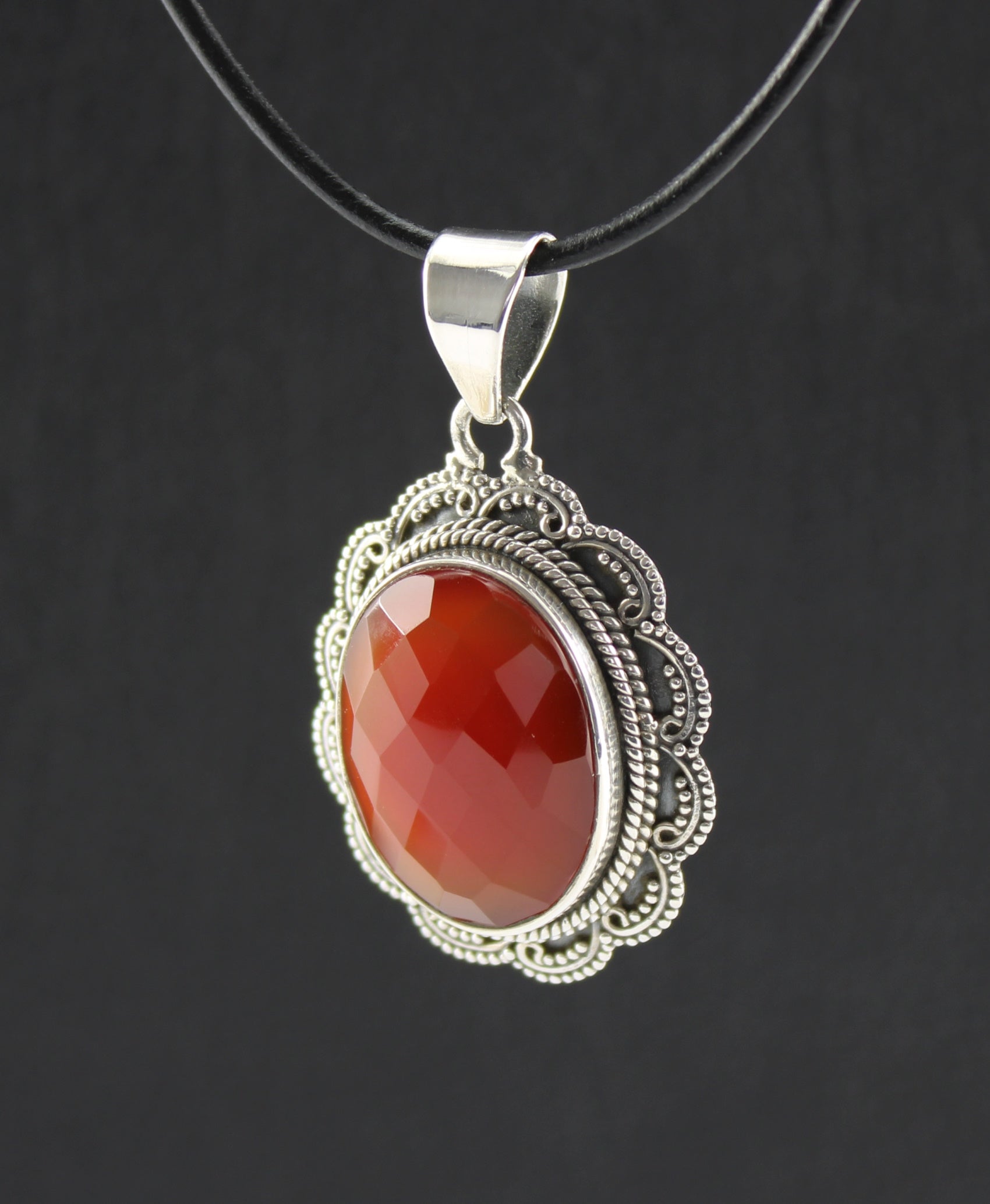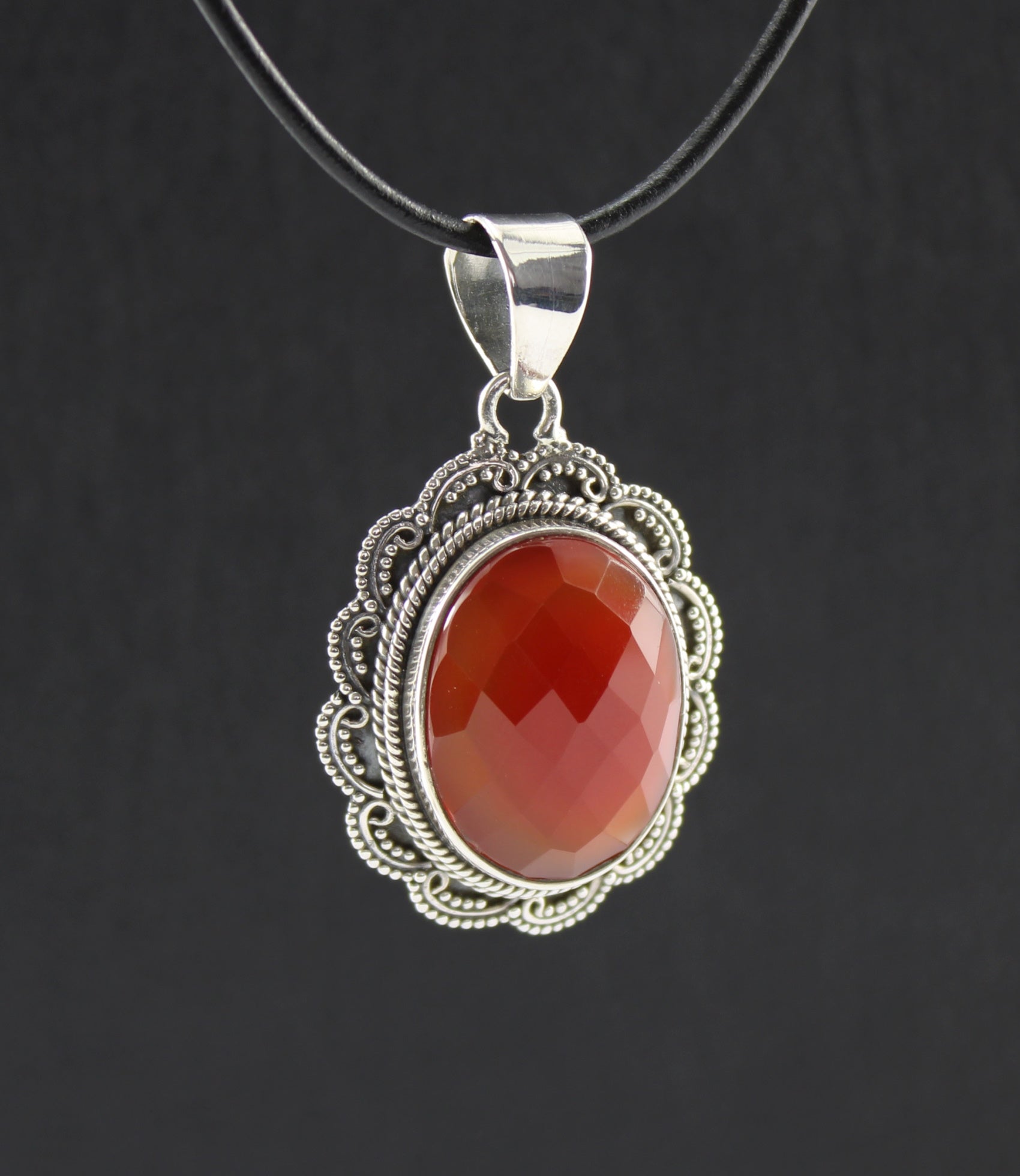 Facettierter Karneol Anhänger ovaler Edelstein 925 Silber Schmuck Unikat Handarbeit filigran gefasst mit schwarzem Lederband 1m individuell kürzbar Lieferung in Geschenkbox