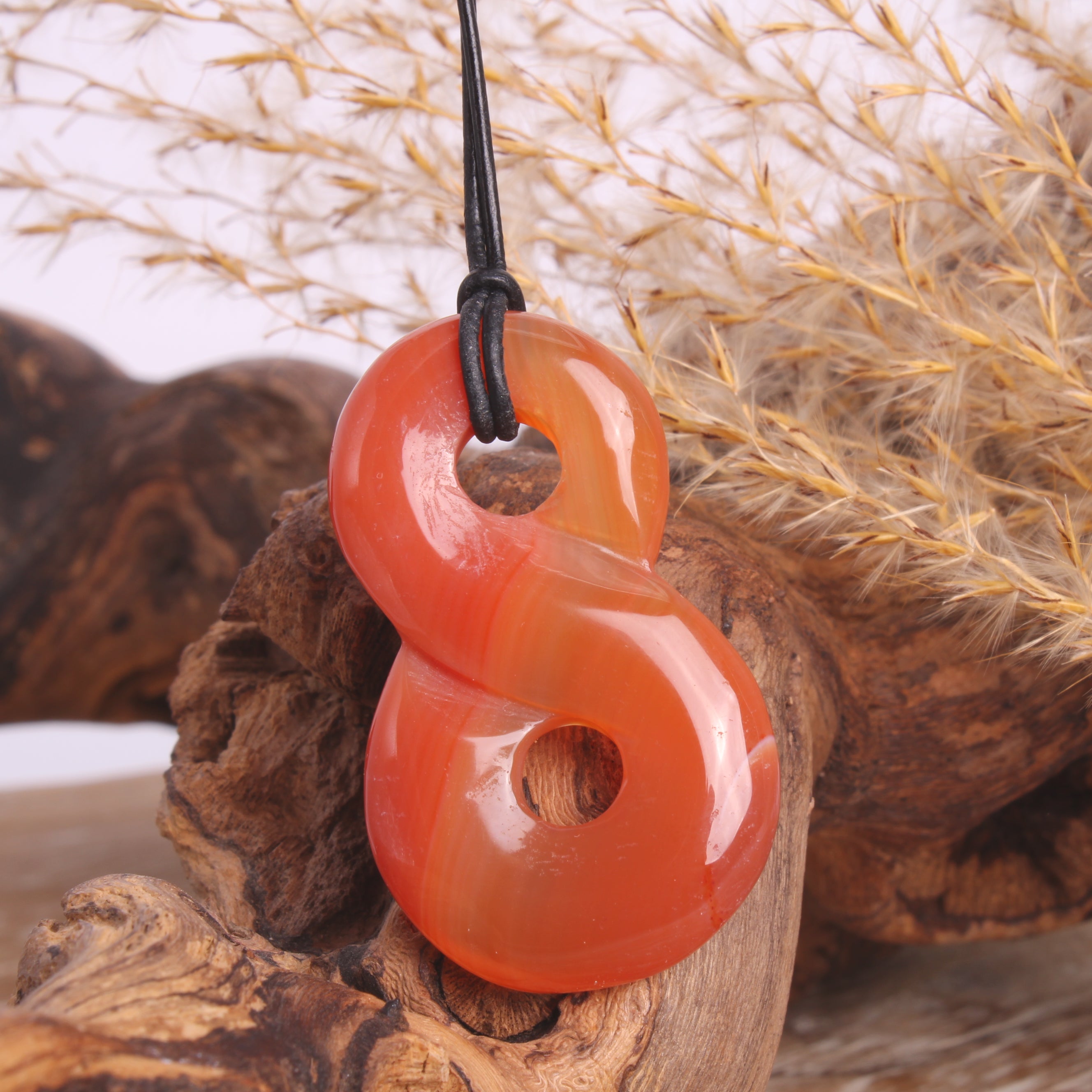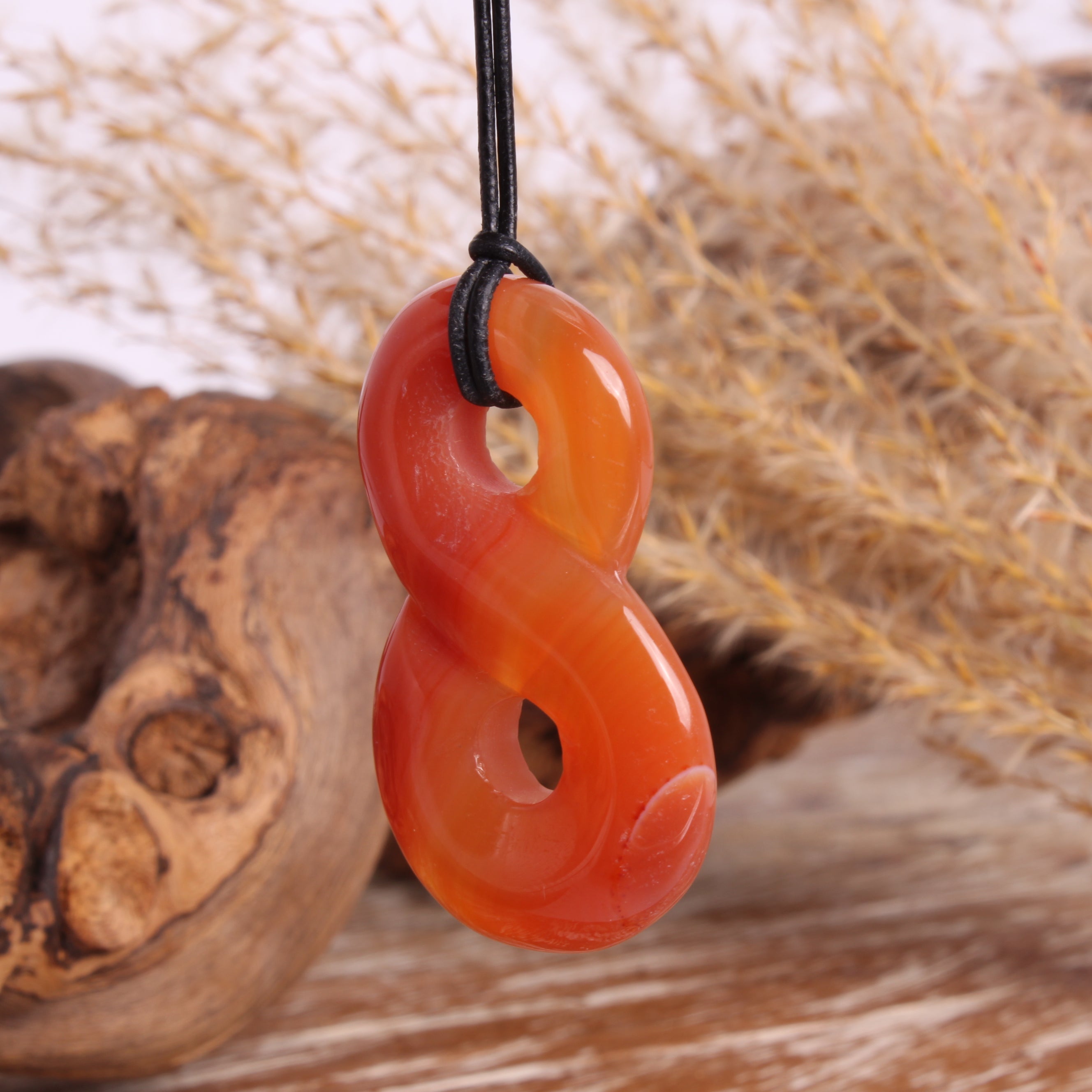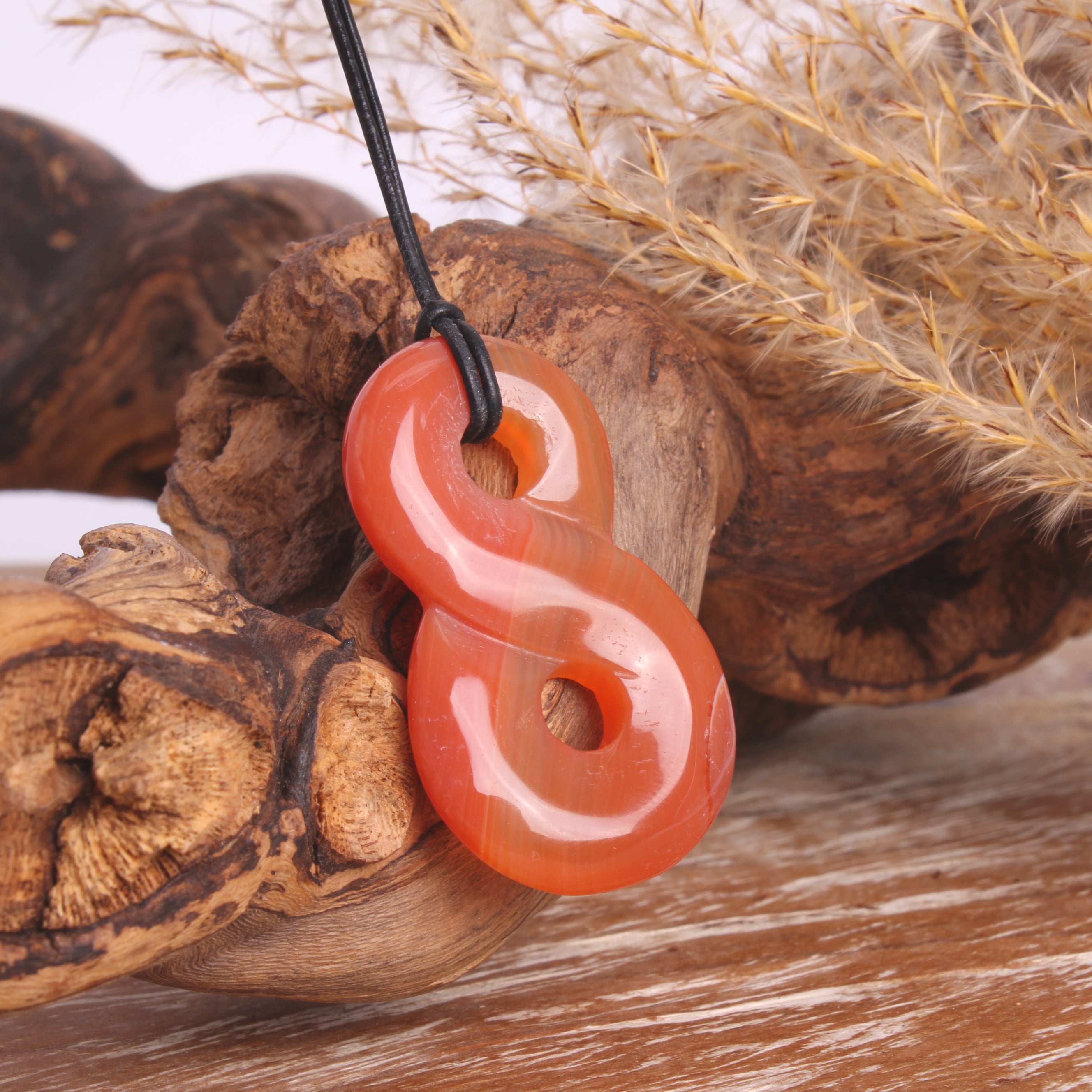 Karneol Anhänger „Unendlichkeit“ – Handgefertigter Edelsteinanhänger mit Lederband, ca. 40 × 24 mm, im Organzasäckchen