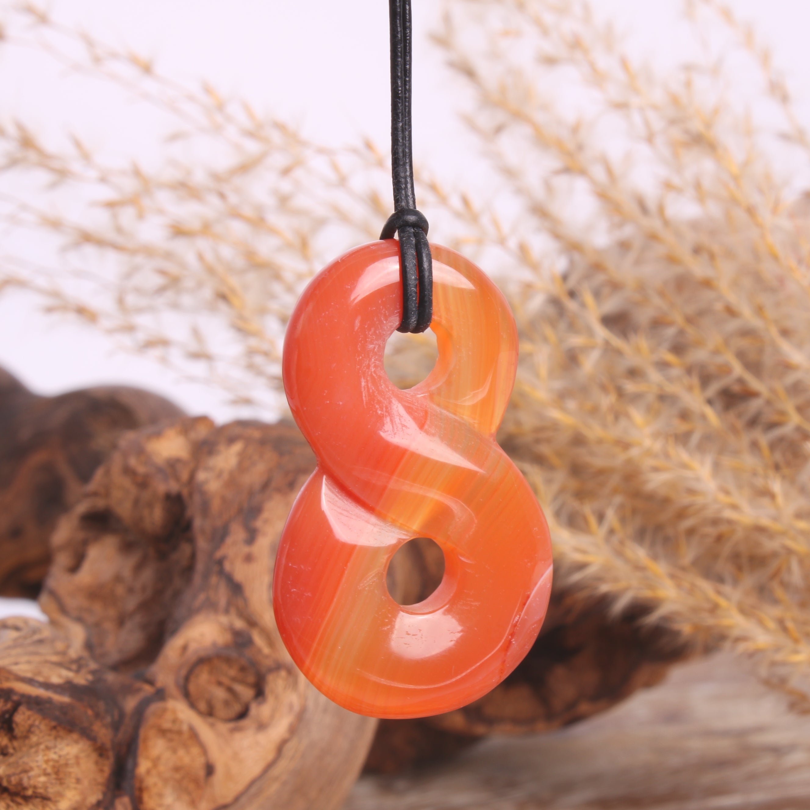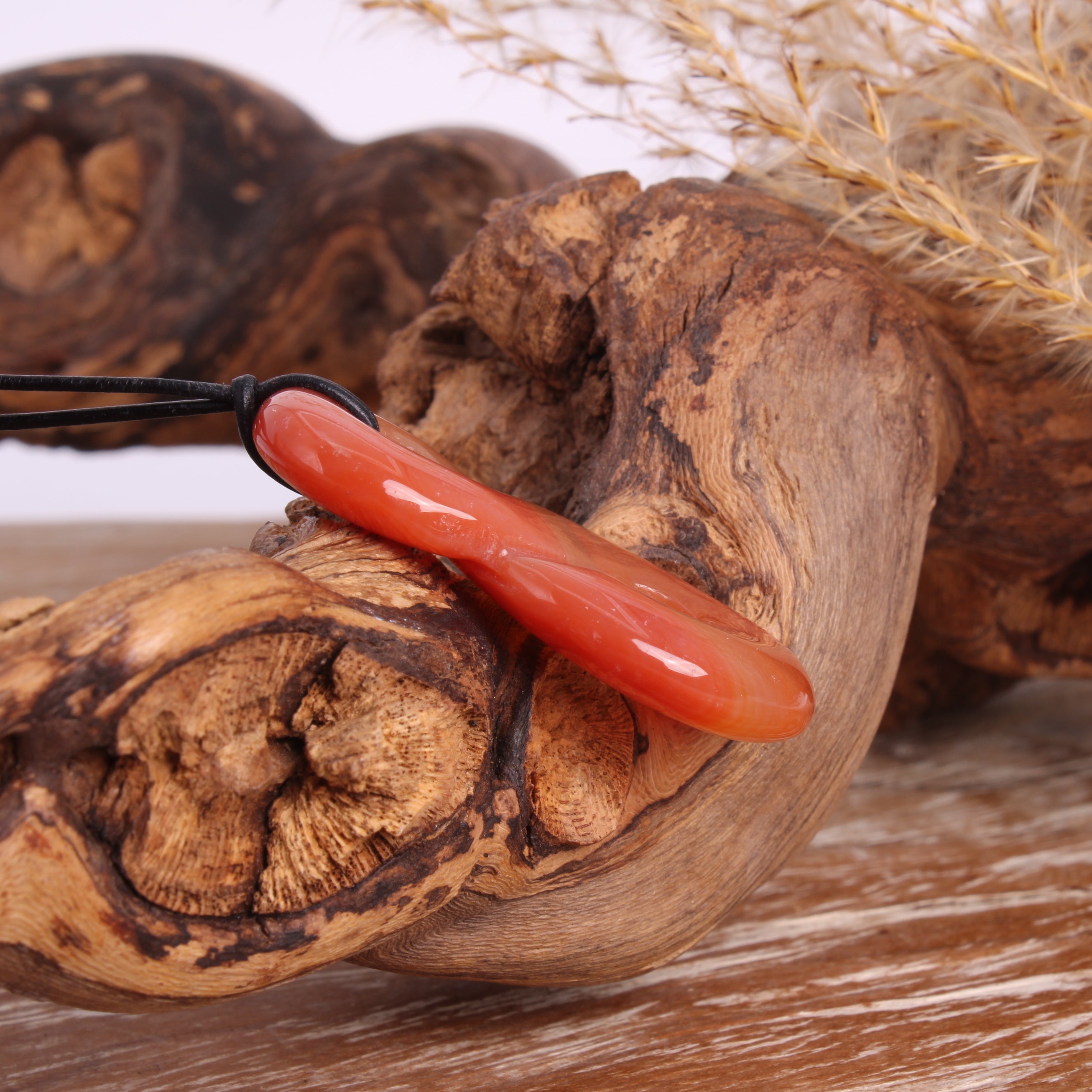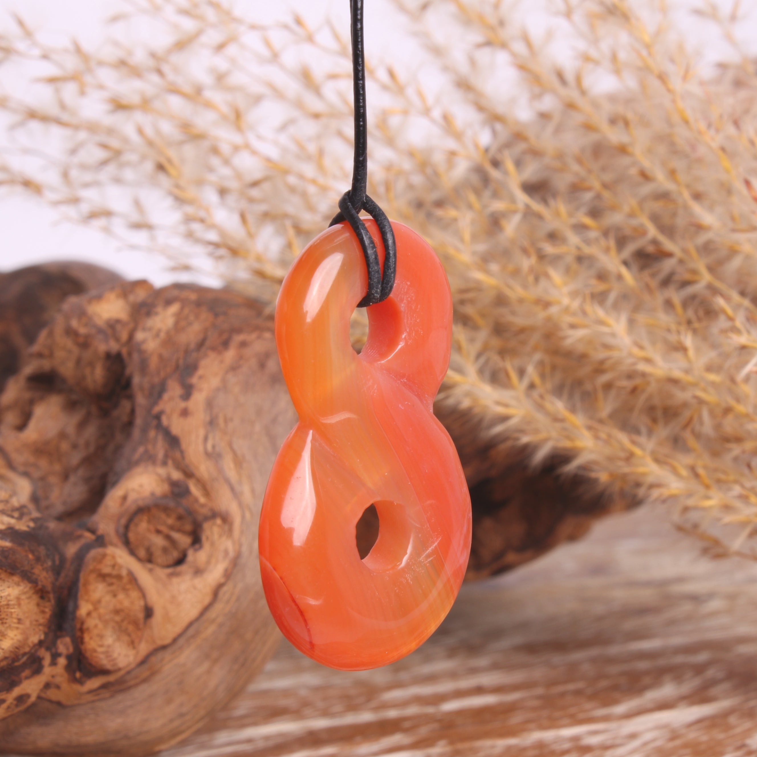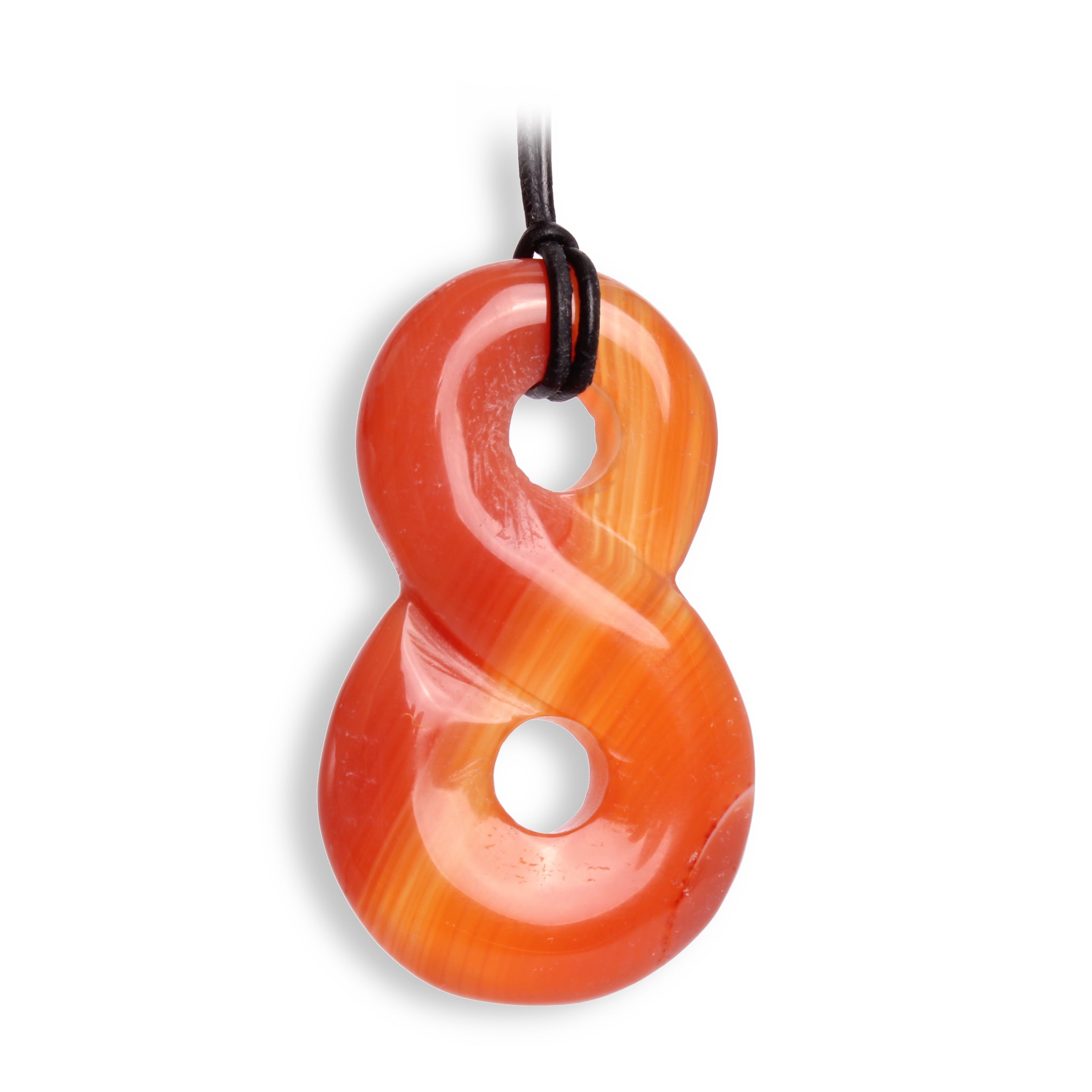 Karneol Anhänger „Unendlichkeit“ – Handgefertigter Edelsteinanhänger mit Lederband, ca. 40 × 24 mm, im Organzasäckchen