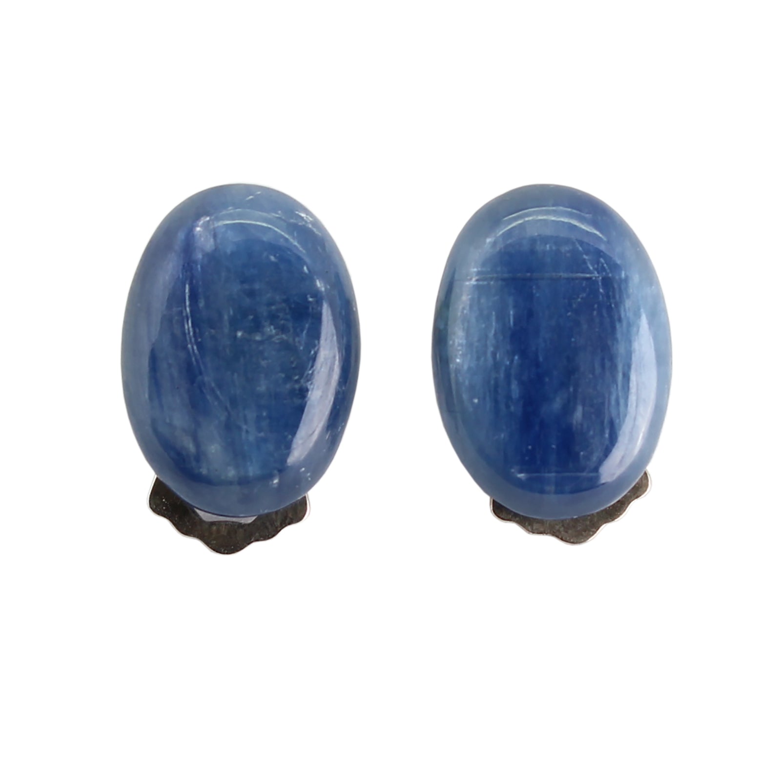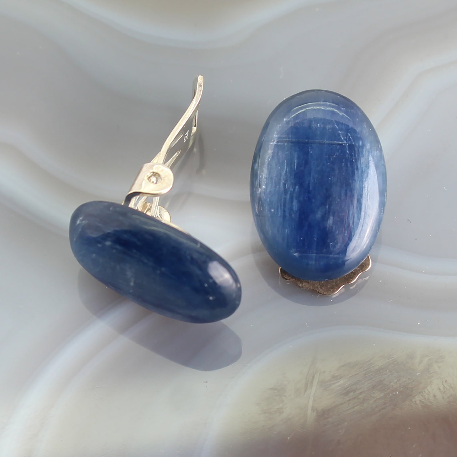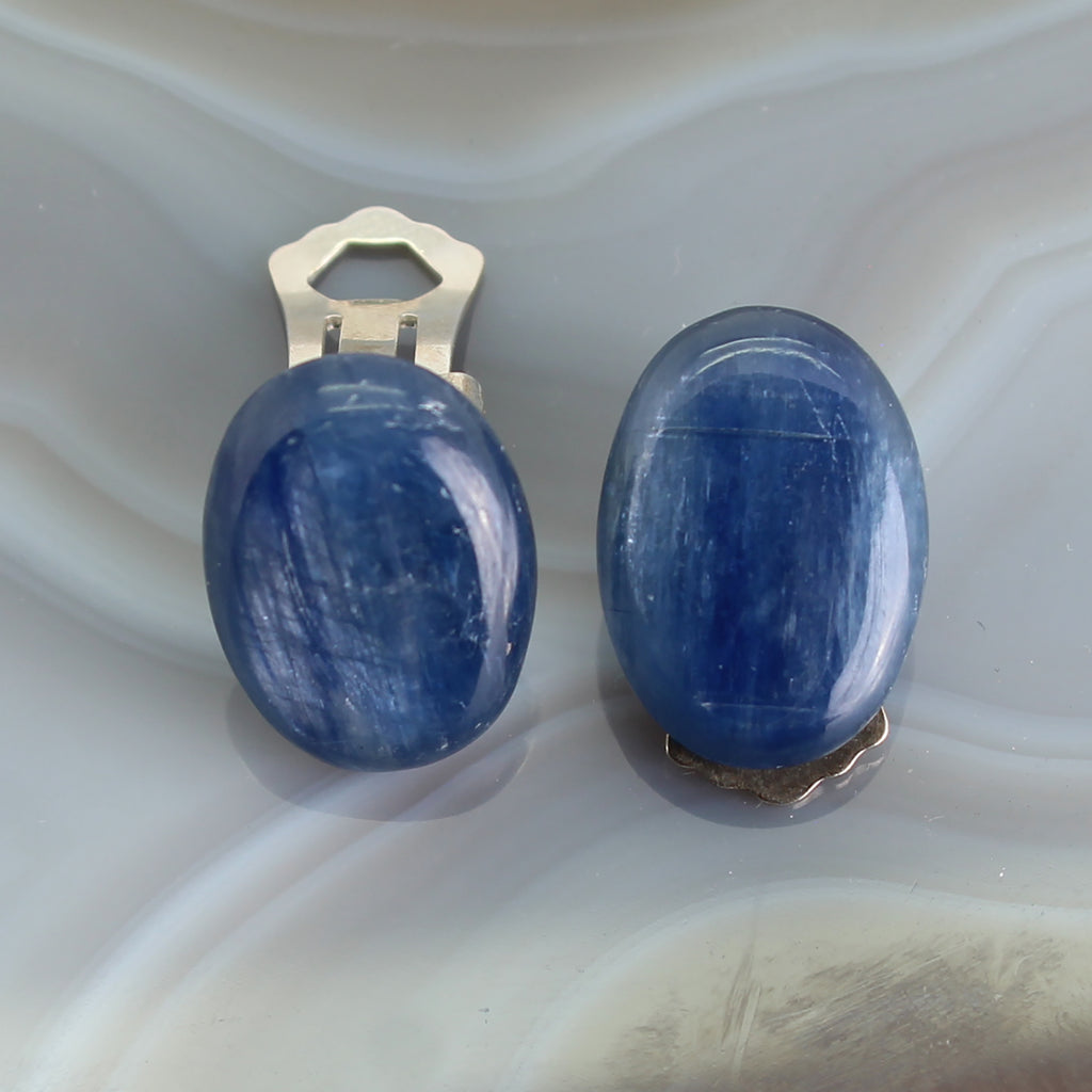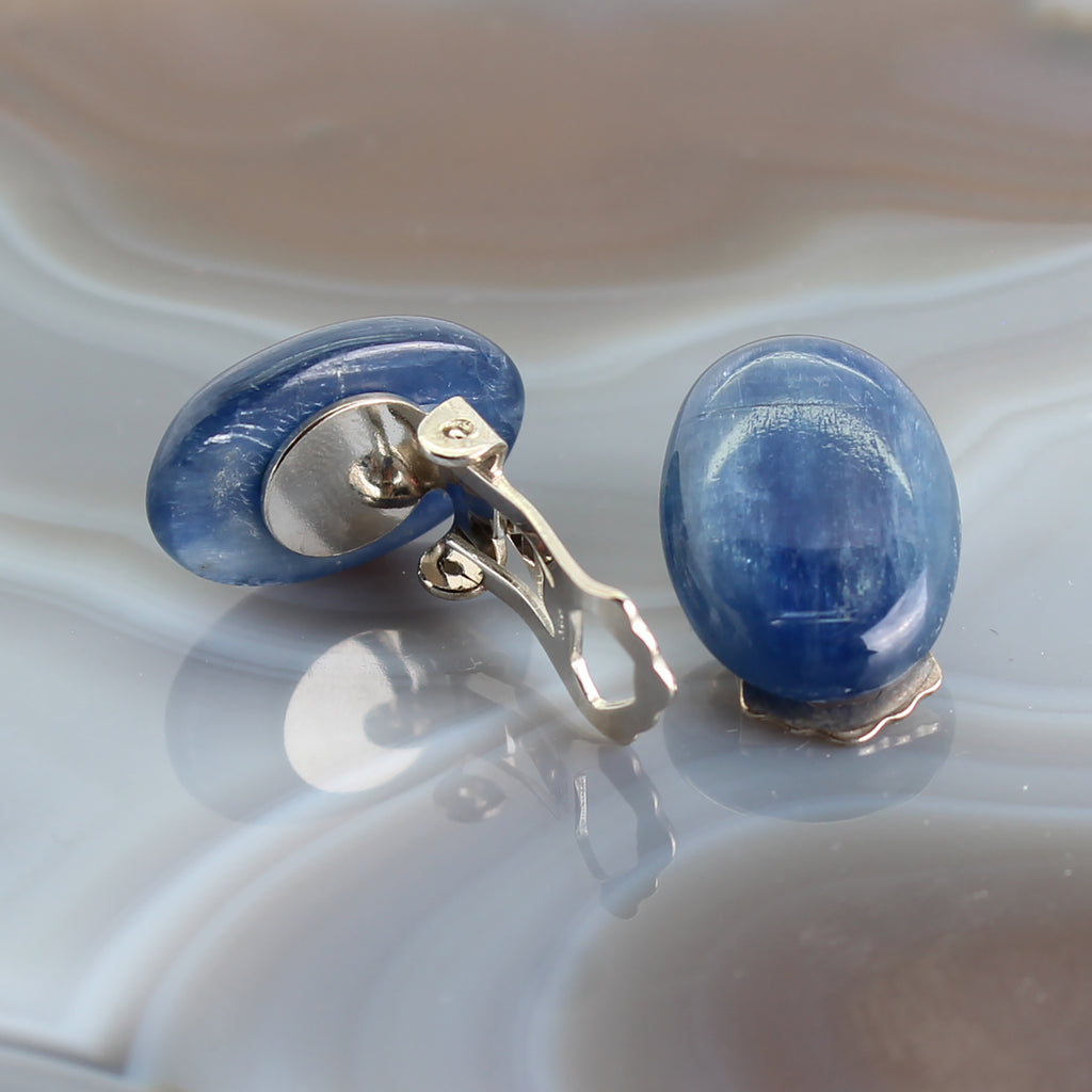 Kyanit Ohrclips oval Cabochon Einzelstück 925 Silber ca 17 x 12 mm – schimmernd jeansblau – echte Edelsteine – Clips aus Sterling Silber – Lieferung in Geschenkschachtel
