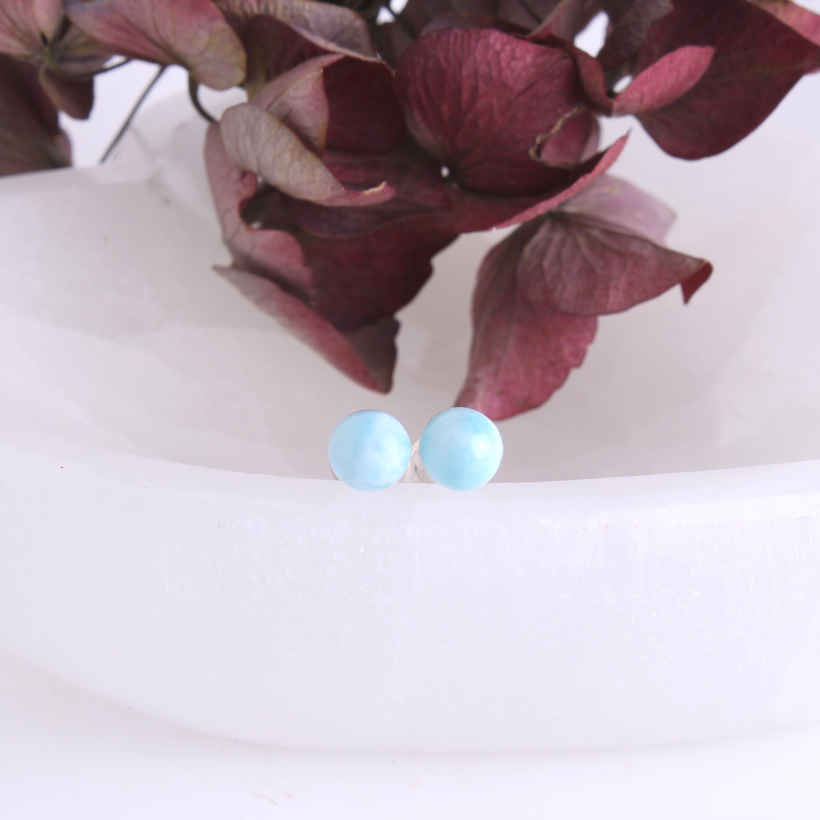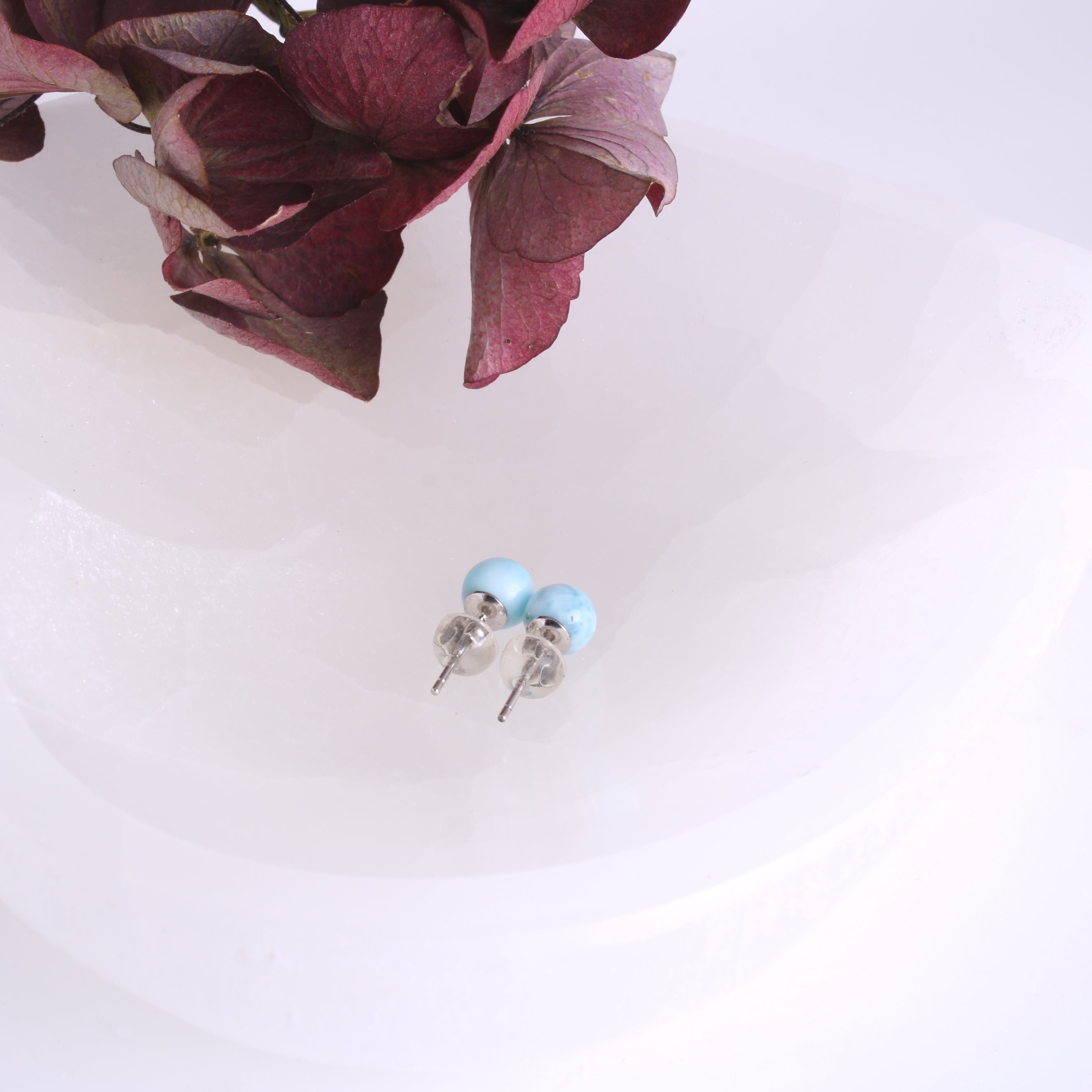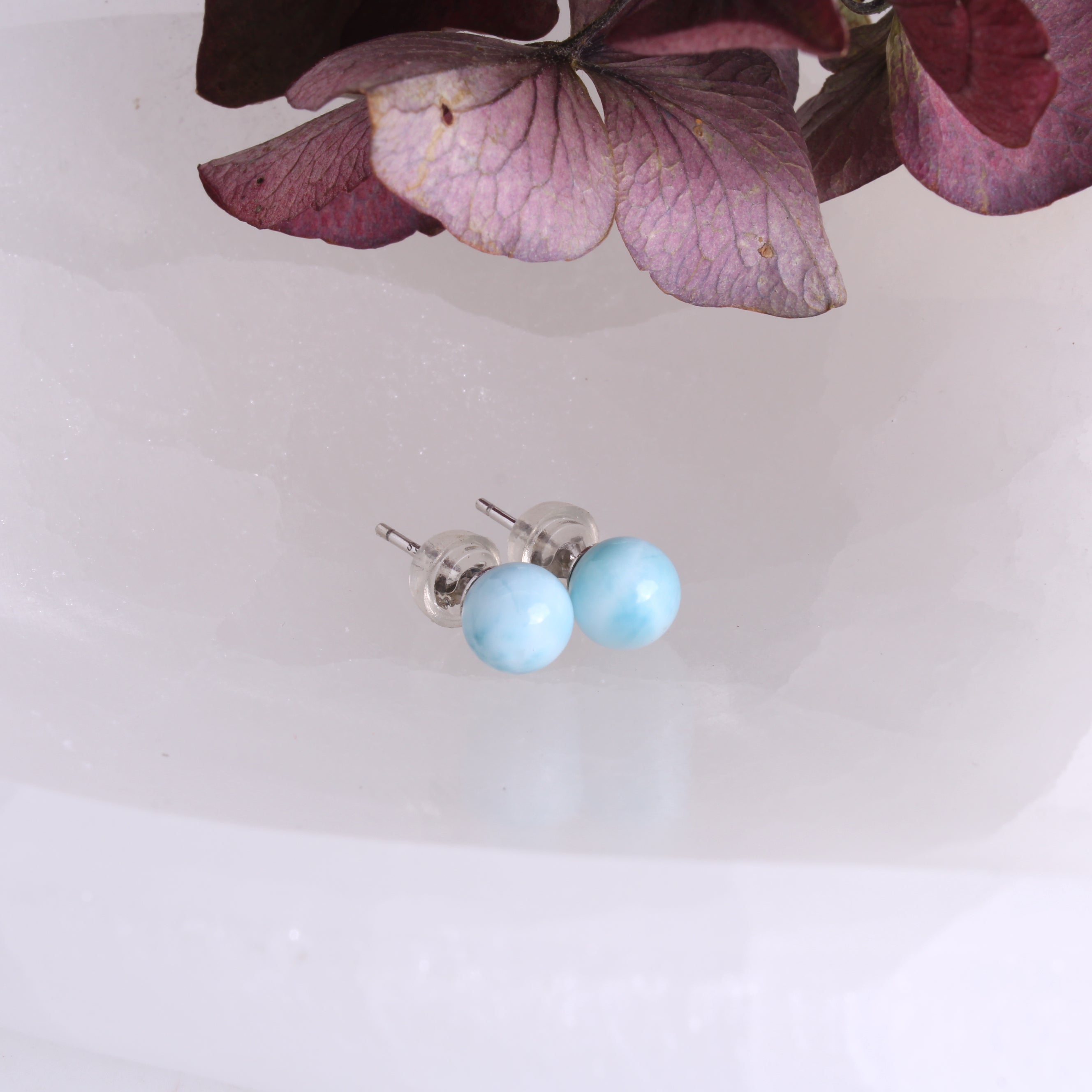 Larimar Ohrstecker 6 mm Kugel – Paar – Echter Edelstein – 925 Sterling Silber rhodiniert – Silikon Schraubverschluss – Handgefertigter Ohrschmuck – Lieferung in Geschenkbox