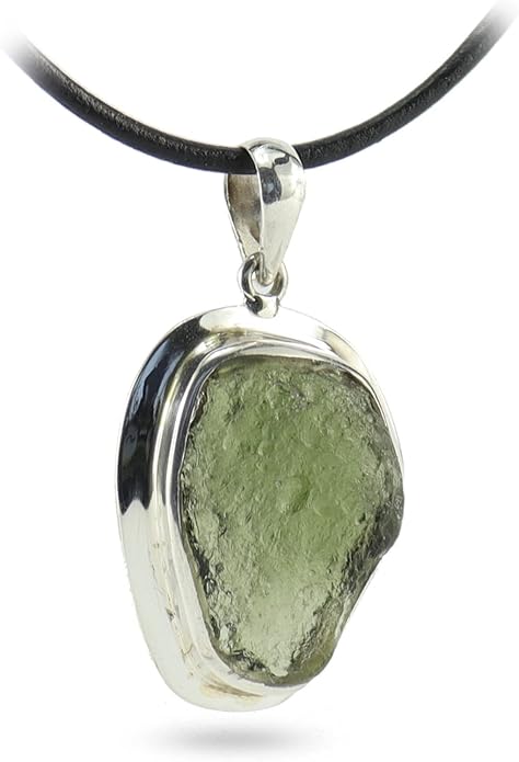 Naturbelassener Moldavit Anhänger Unikat mit Fassung und Öse aus 925er Sterling Silber inklusive Lederband 1 m und Geschenkschachtel echter Edelstein Schmuck