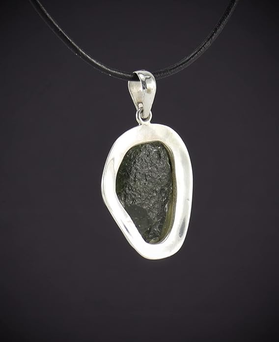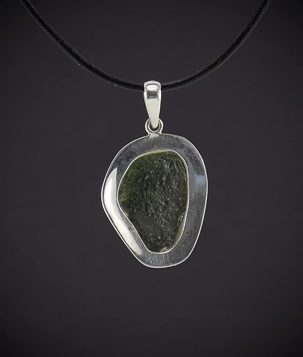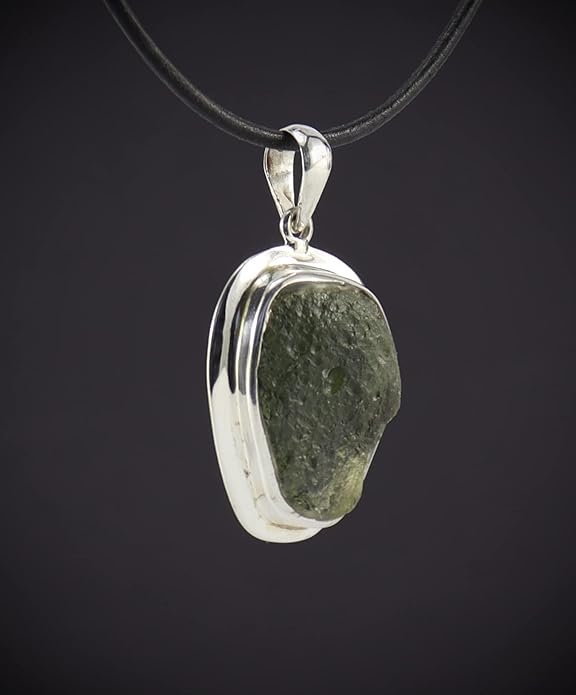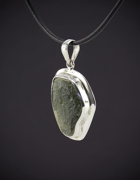 Der rohe Moldavit wird von einer 925er Sterling Silberfassung gehalten, die das Naturmaterial elegant zur Geltung bringt. Durch die hochwertige Verarbeitung ist der Anhänger langlebig und angenehm zu tragen.