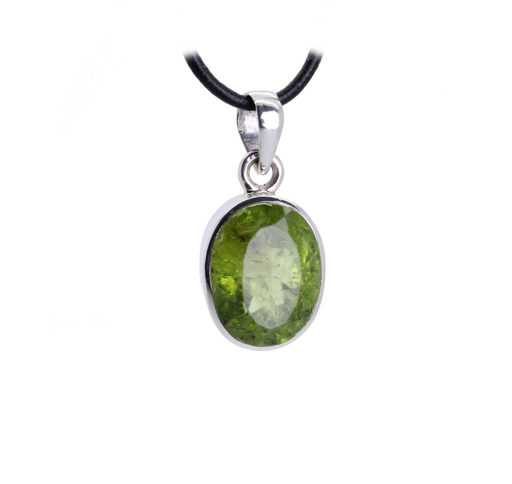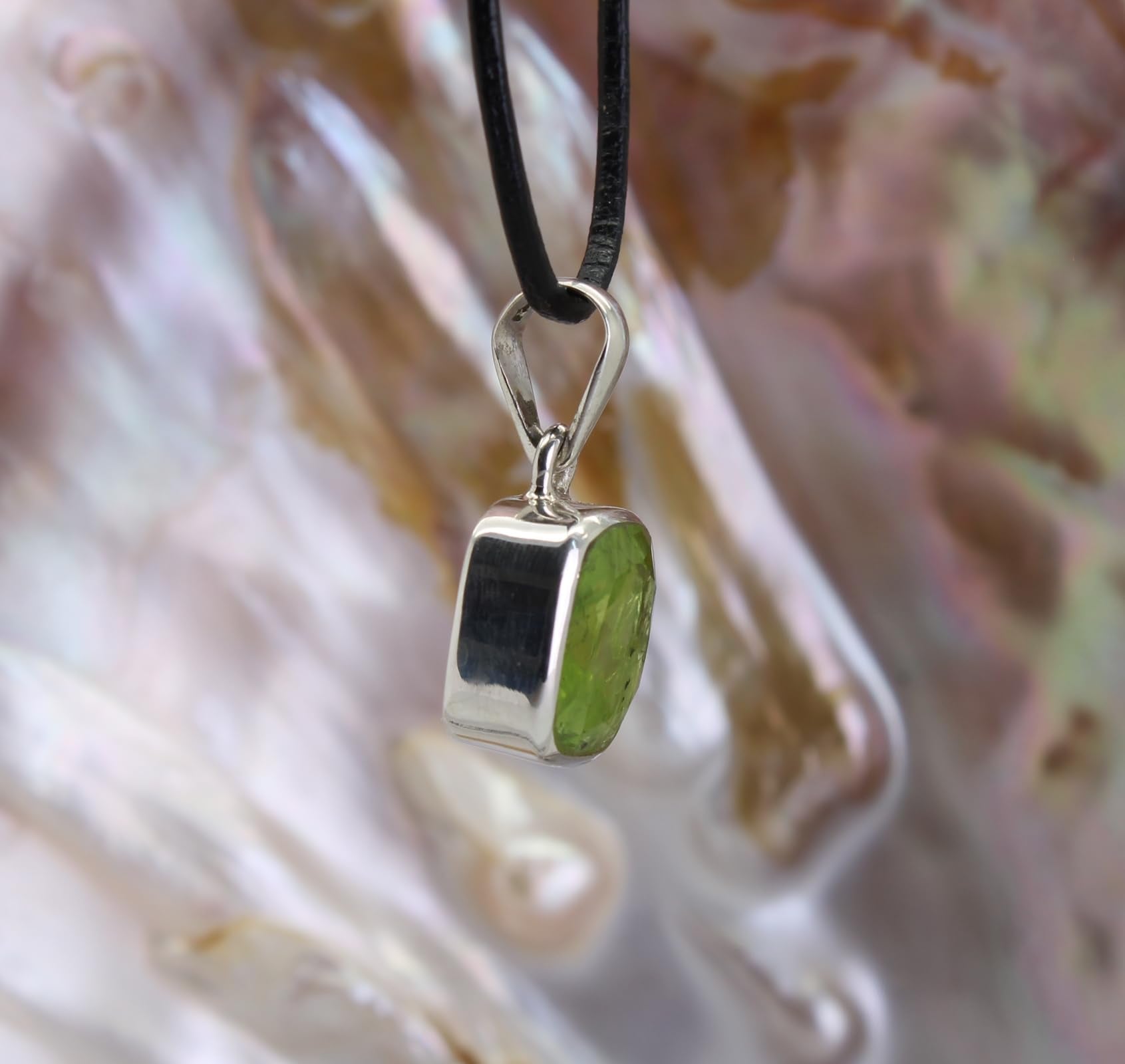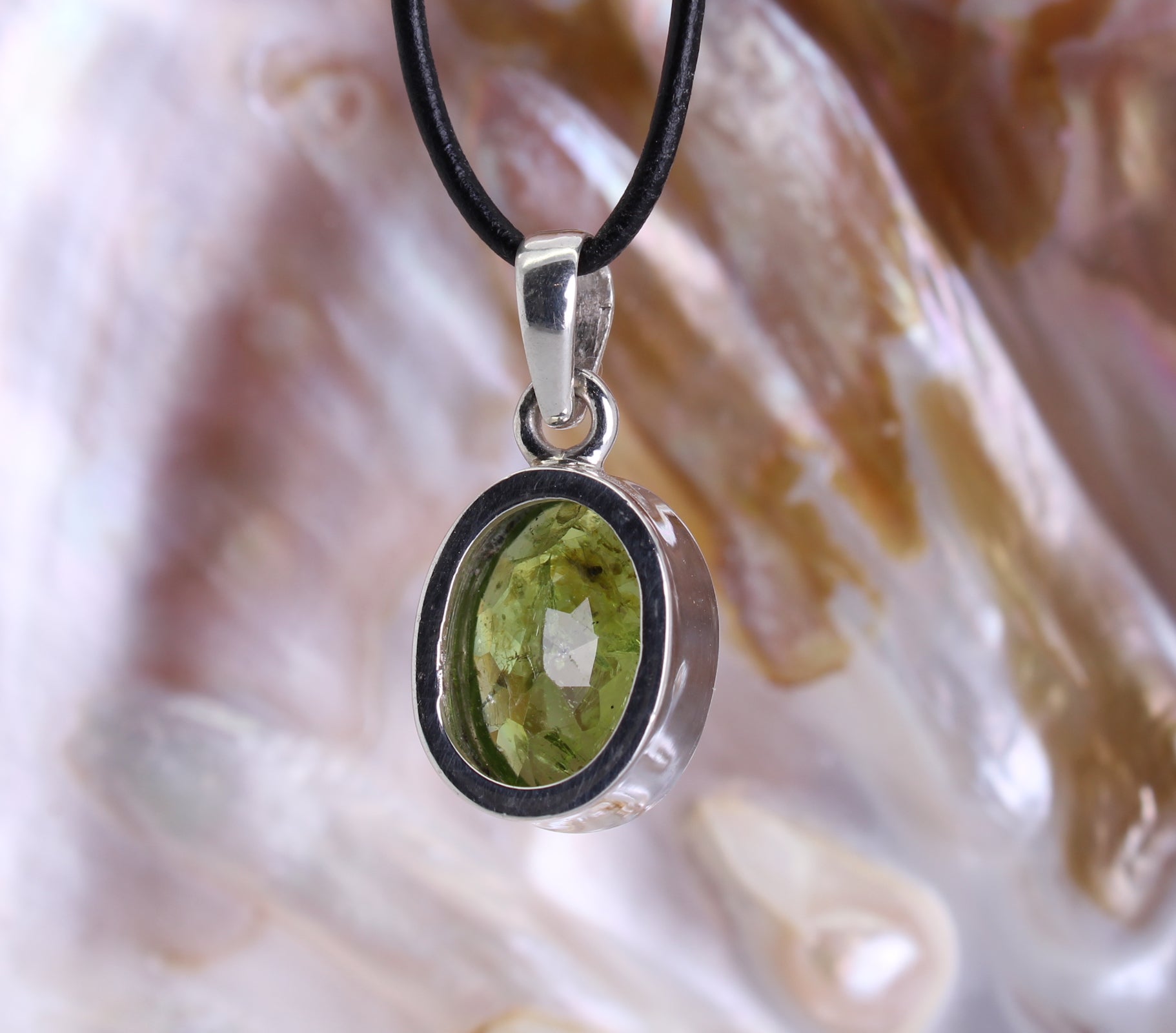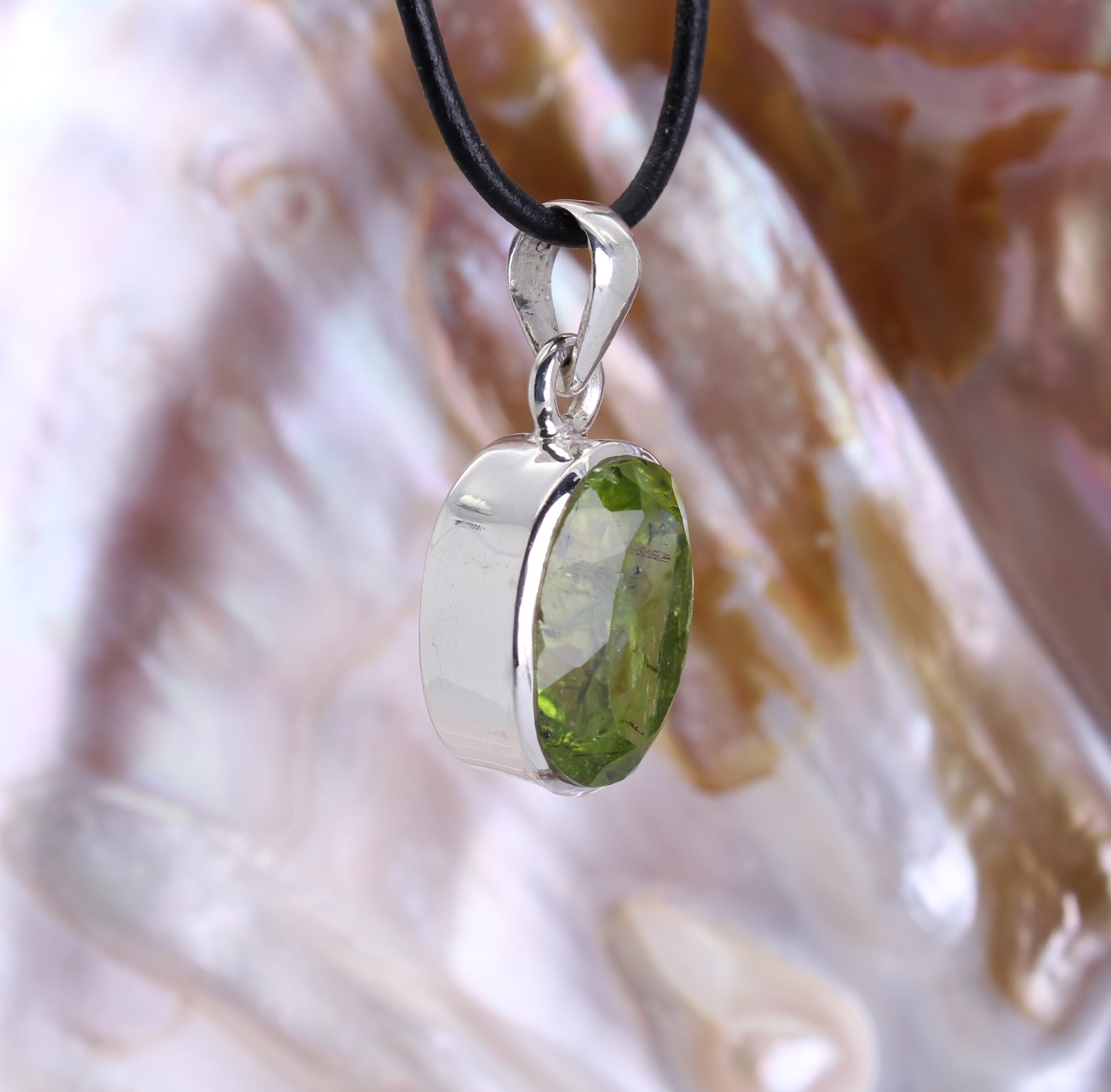 Peridot Anhänger – Facettierter Edelstein ca. 2,6×1,3 cm im 925er Silber, inkl. 1 m Lederband & Geschenkschachtel
