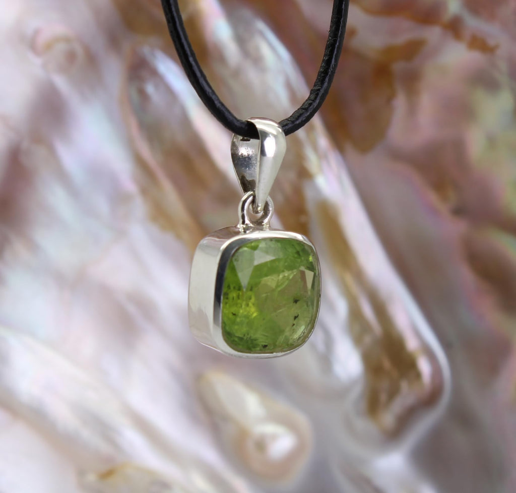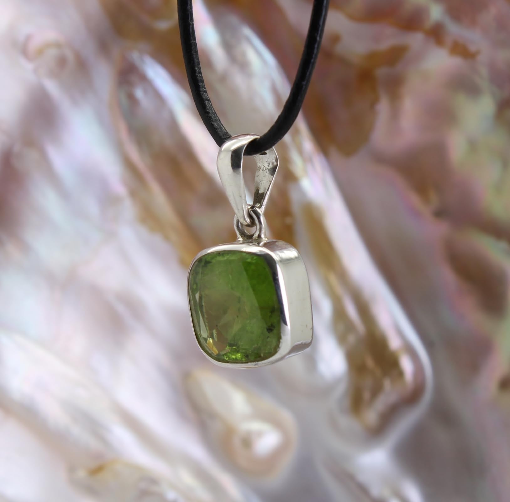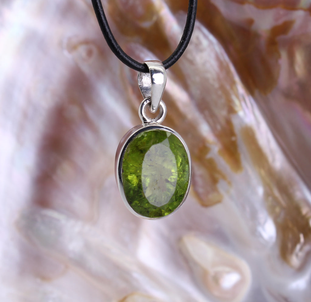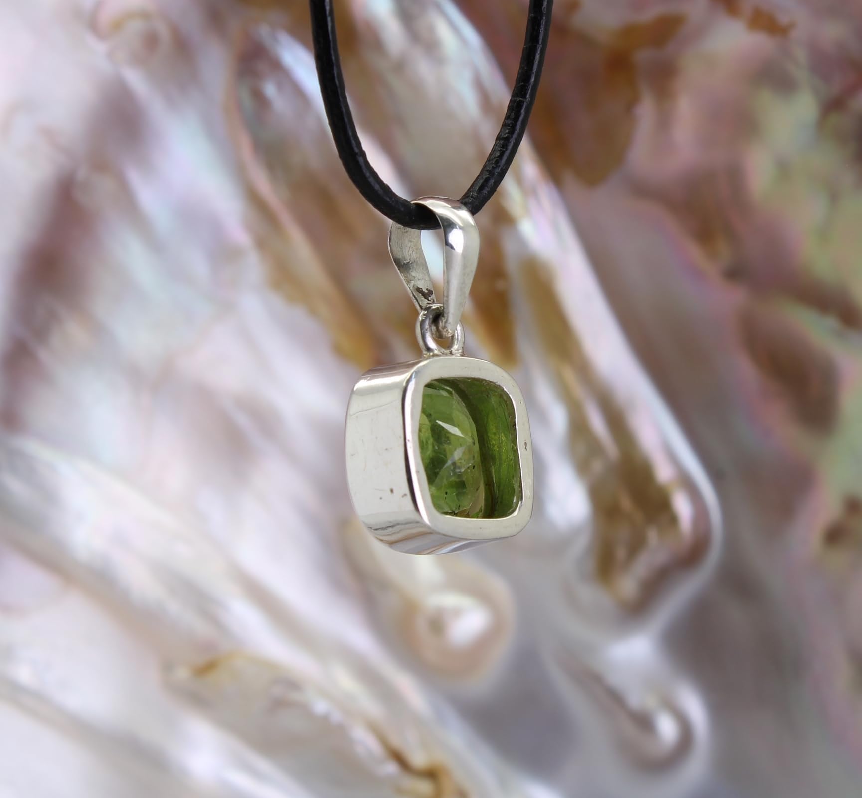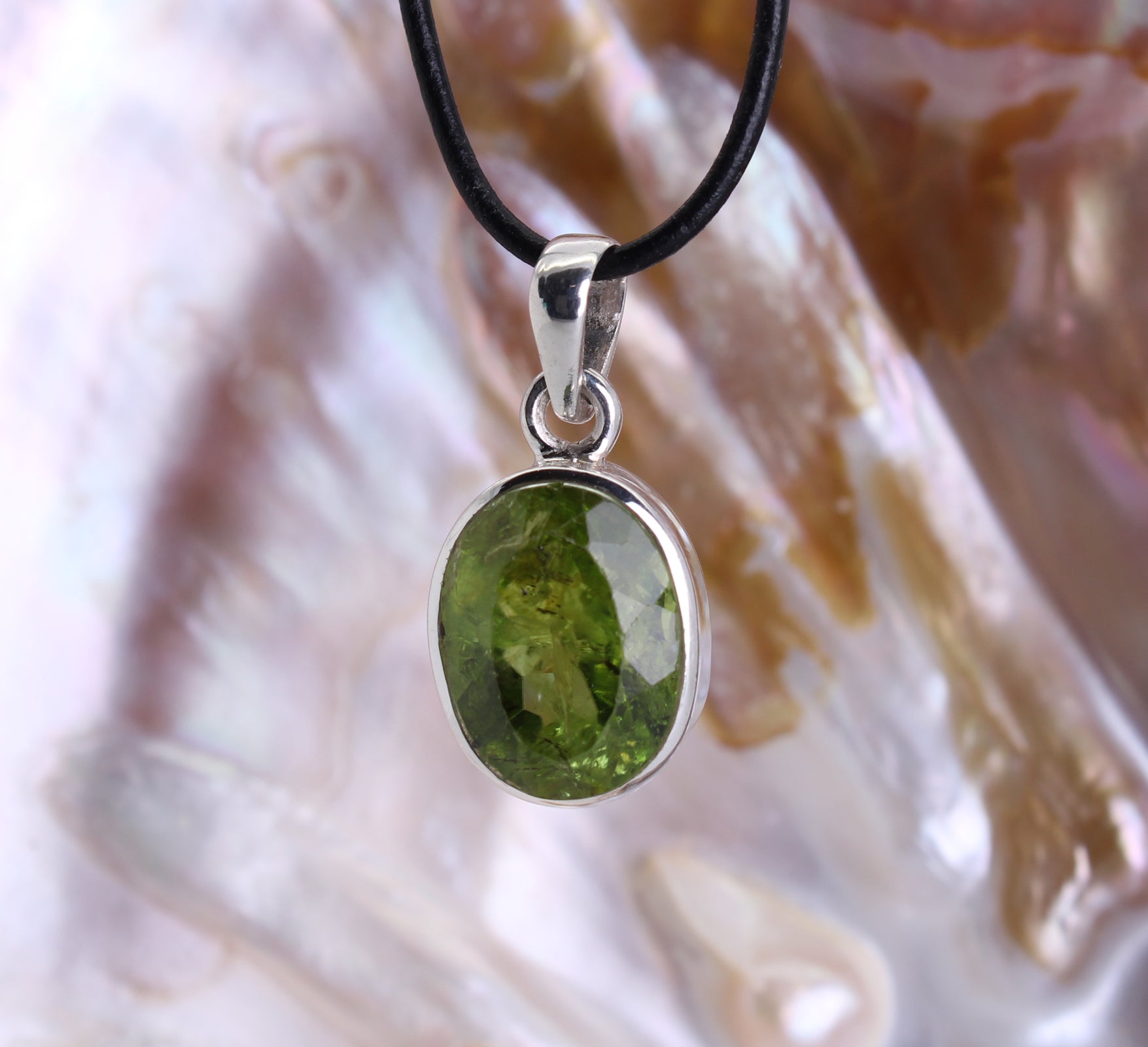 Peridot Anhänger – Facettierter Edelstein ca. 2,6×1,3 cm im 925er Silber, inkl. 1 m Lederband & Geschenkschachtel