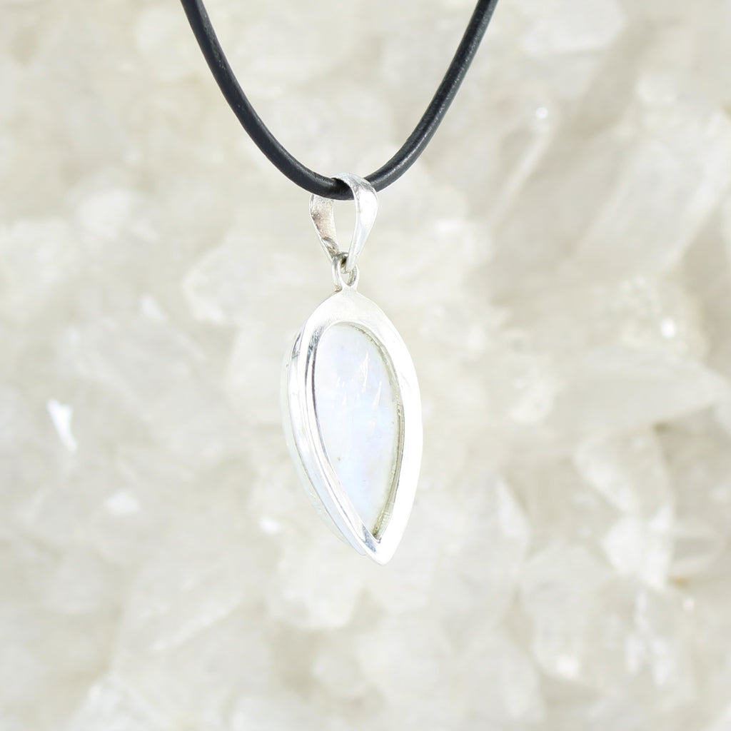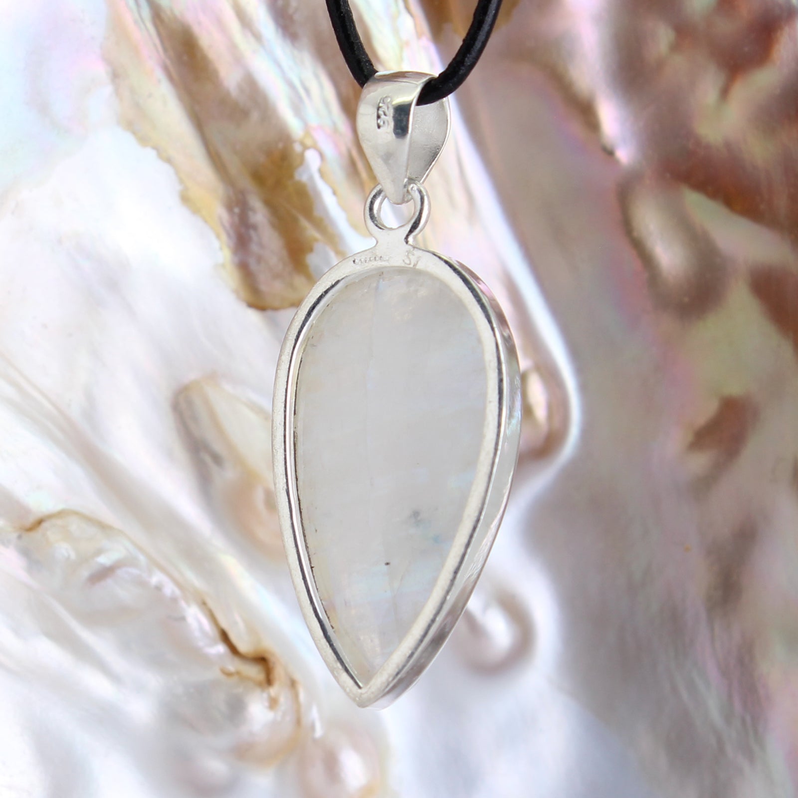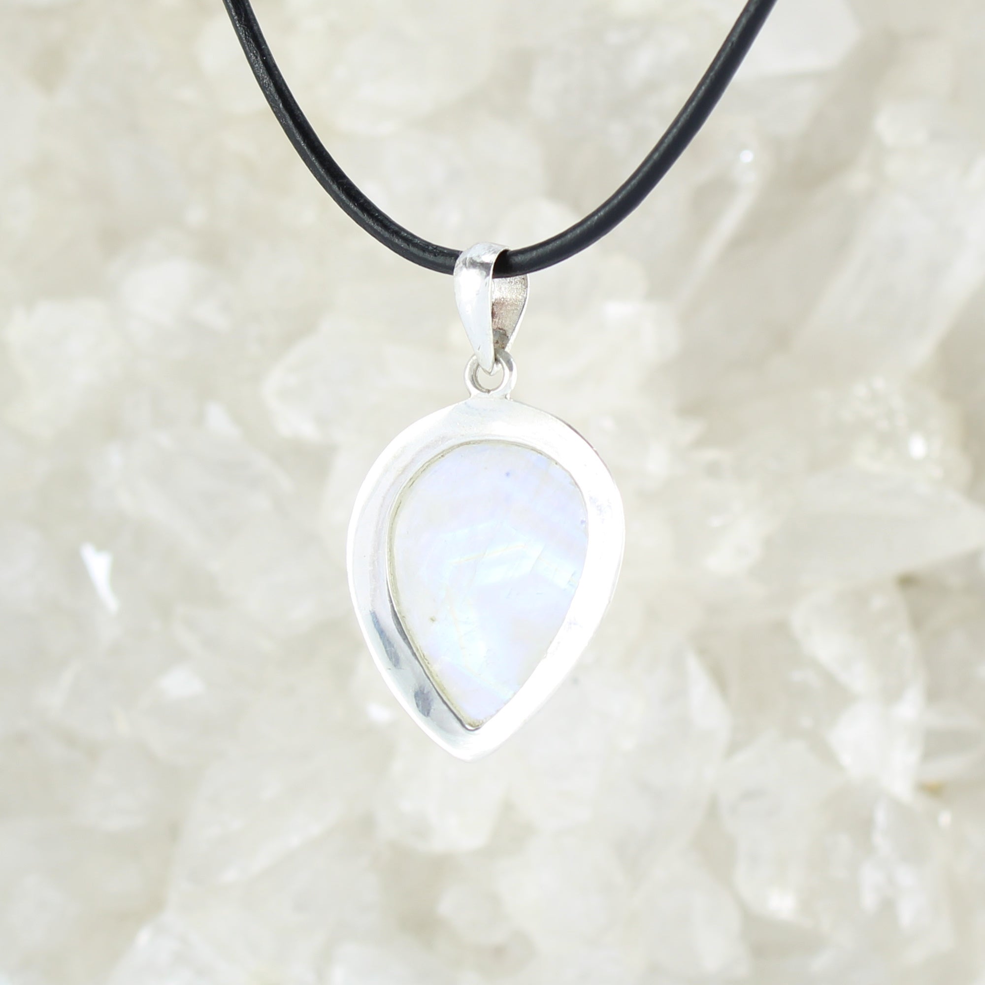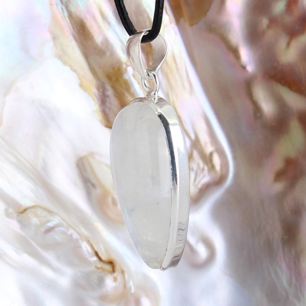 Regenbogenmondstein Anhänger Cabochon in 925er Silber mit Lederband 1 m – echter weißer Labradorit – Edelstein Schmuck Unikat in Geschenkschachtel