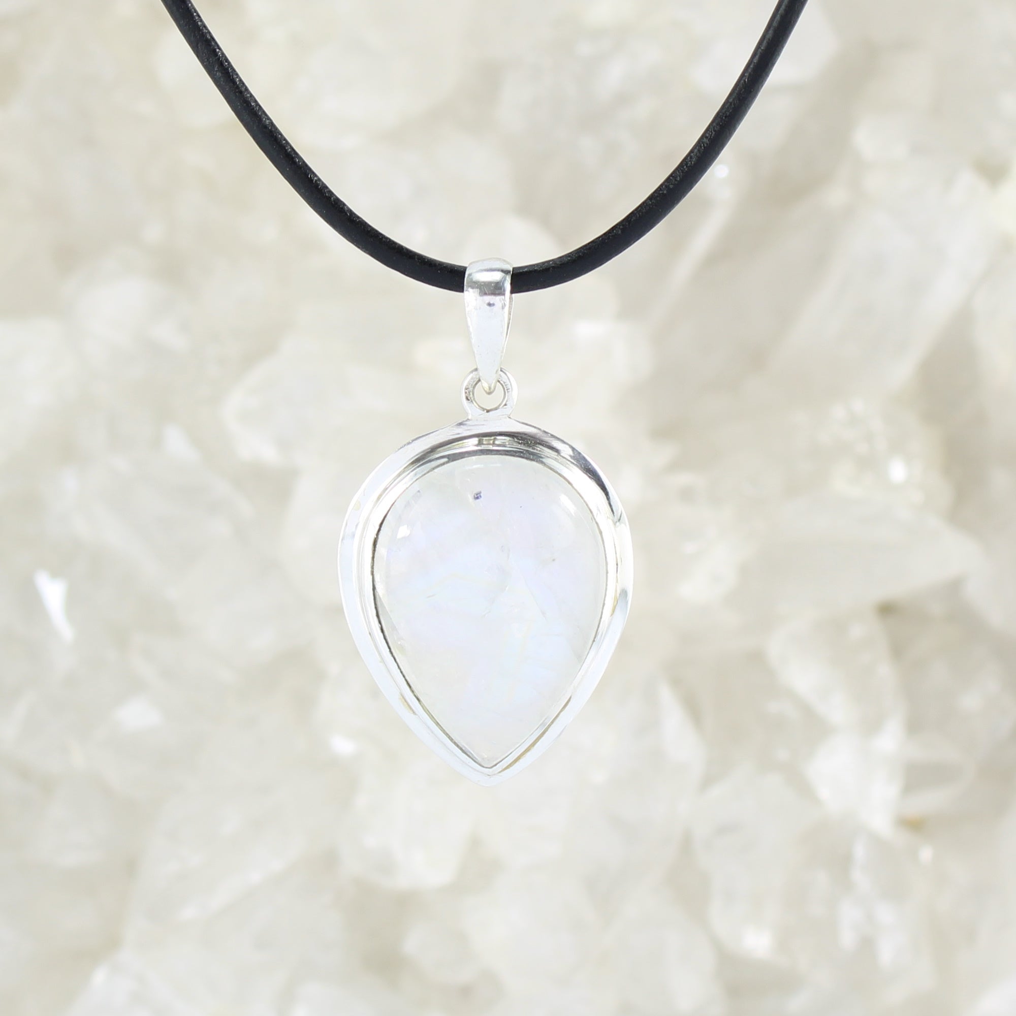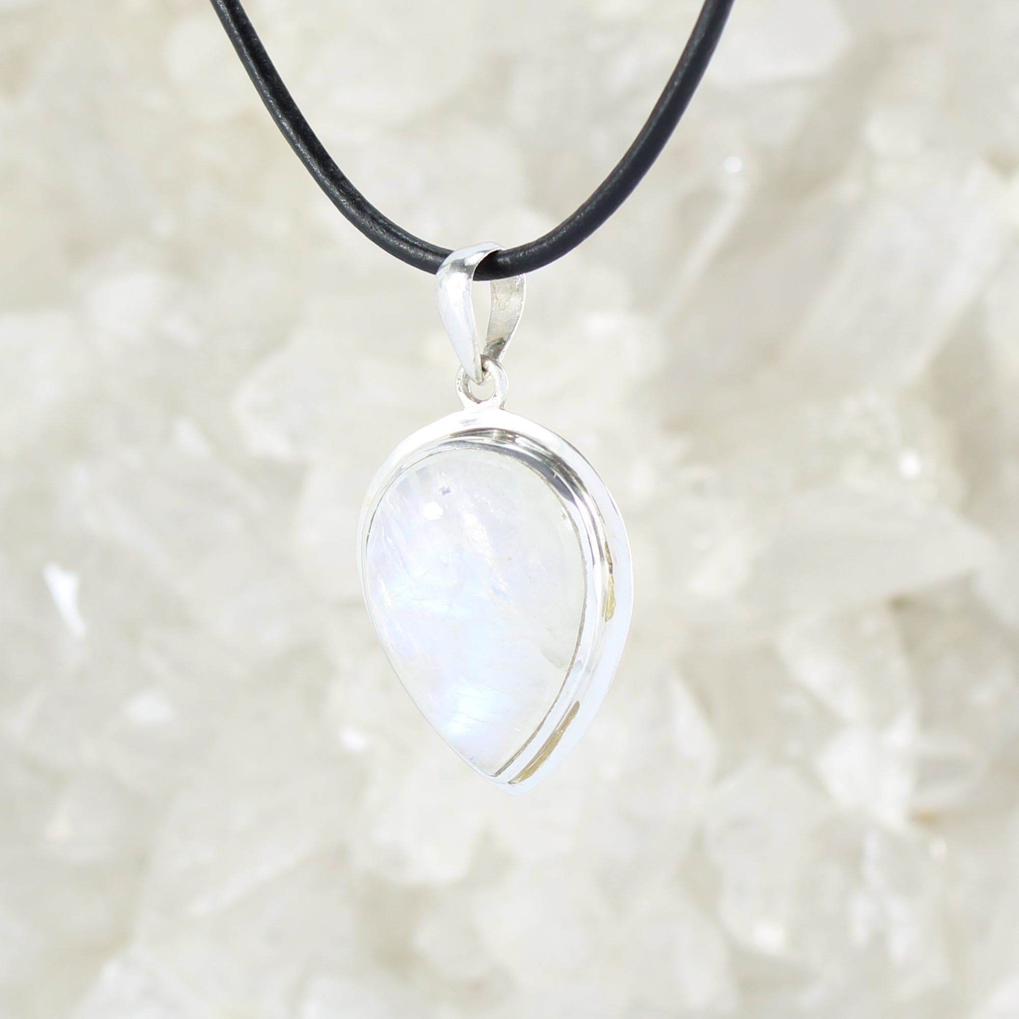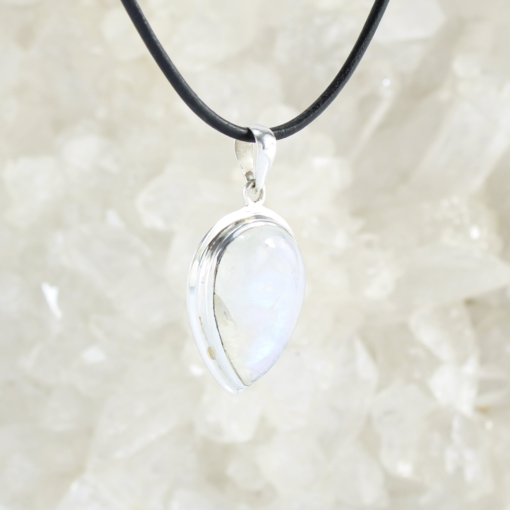 Regenbogenmondstein Anhänger Cabochon in 925er Silber mit Lederband 1 m – echter weißer Labradorit – Edelstein Schmuck Unikat in Geschenkschachtel