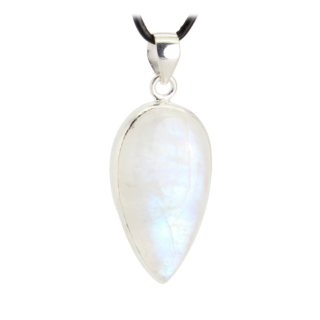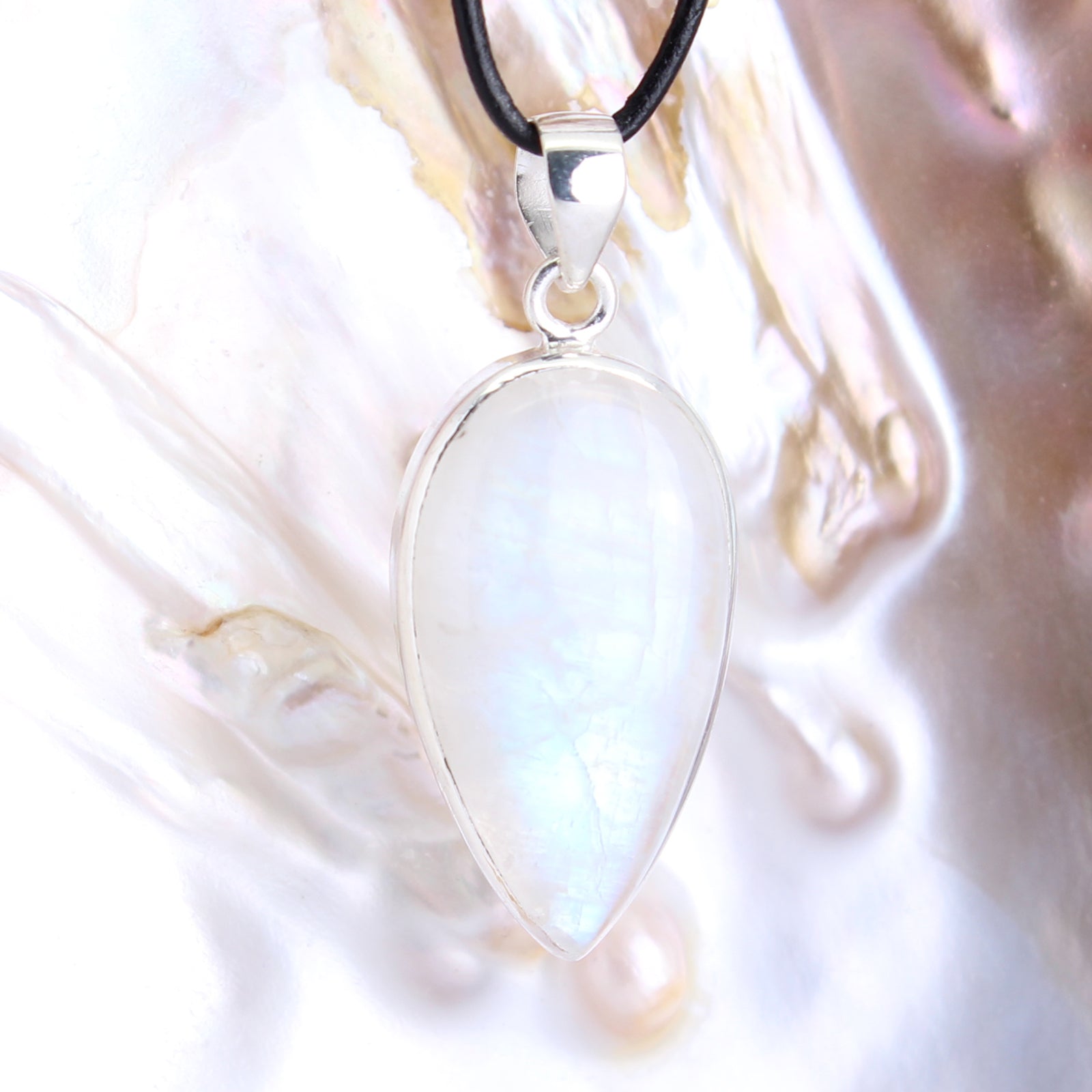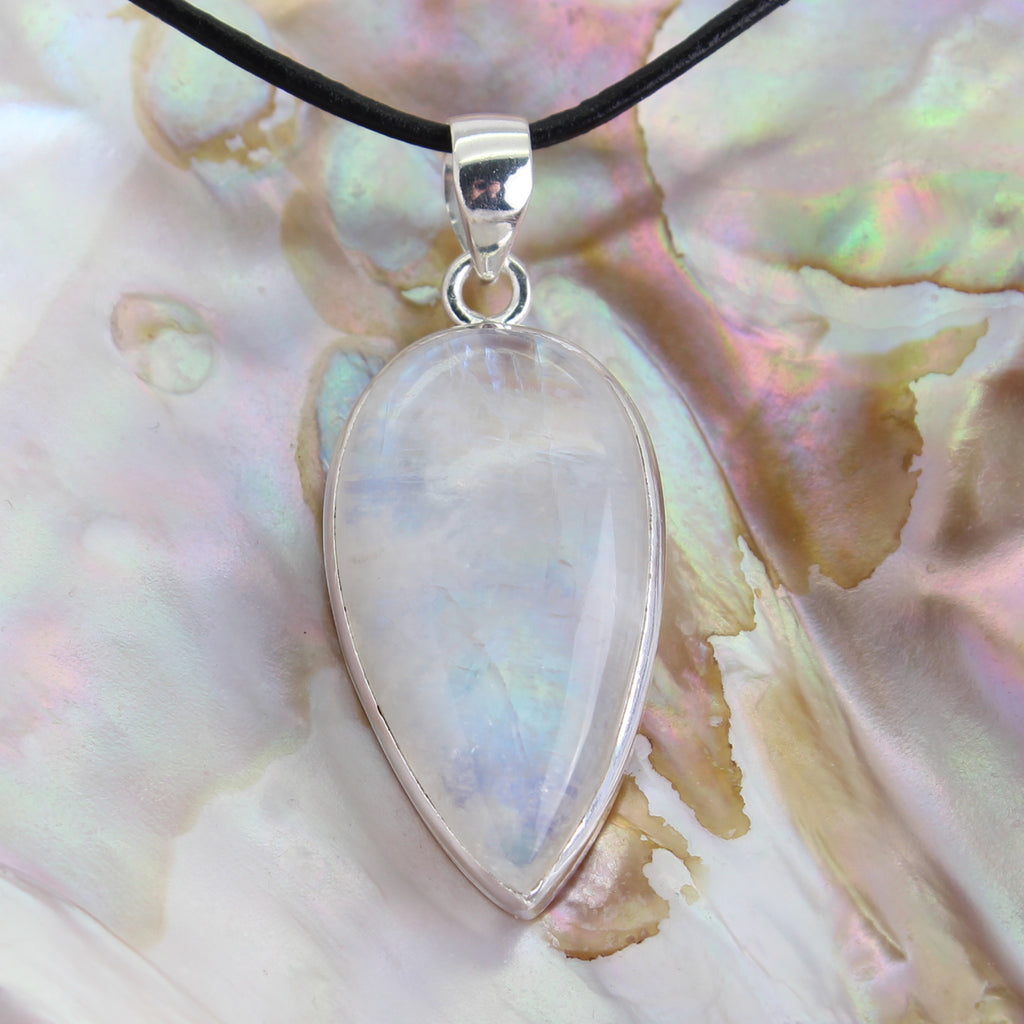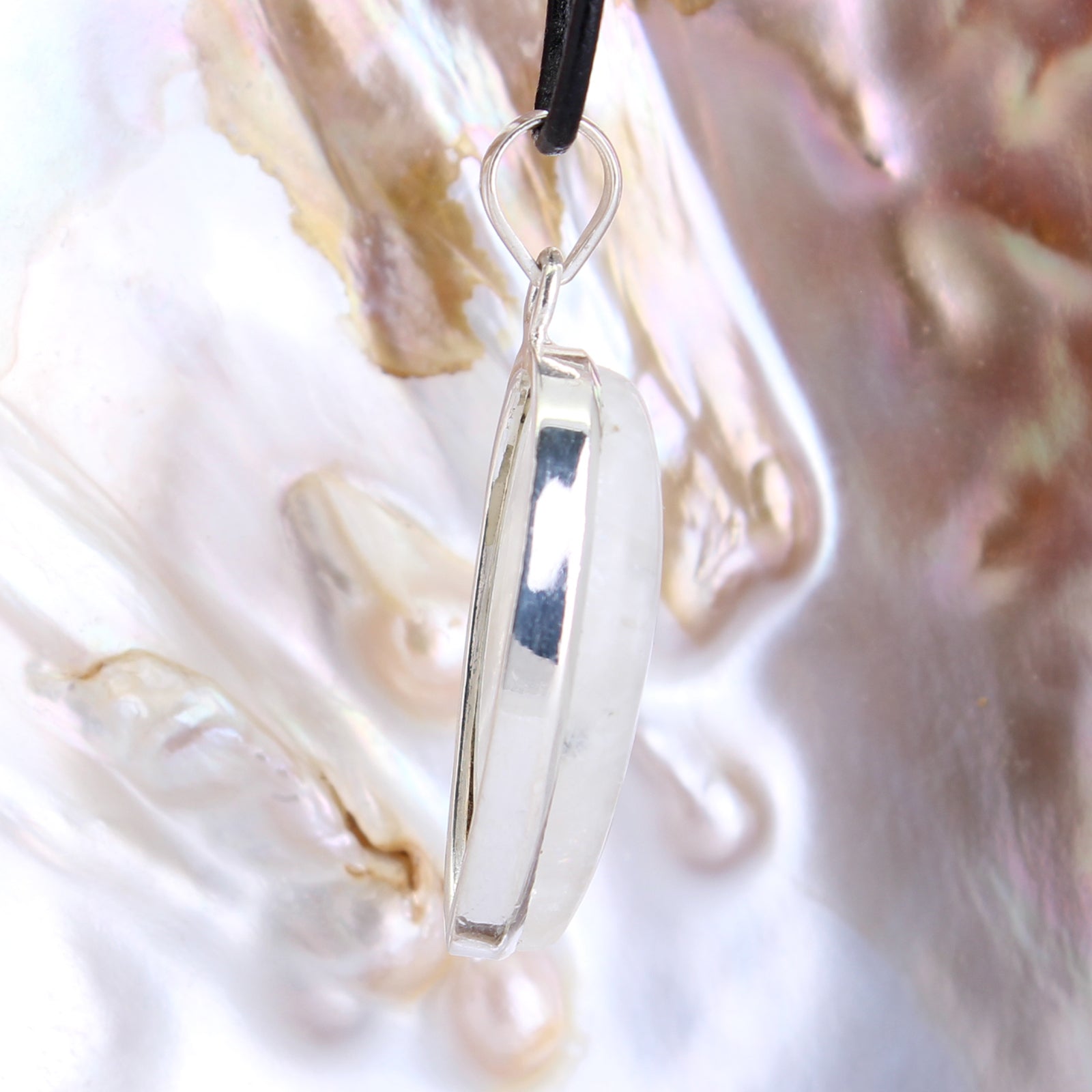 Regenbogenmondstein Anhänger Cabochon in 925er Silber mit Lederband 1 m – echter weißer Labradorit – Edelstein Schmuck Unikat in Geschenkschachtel
