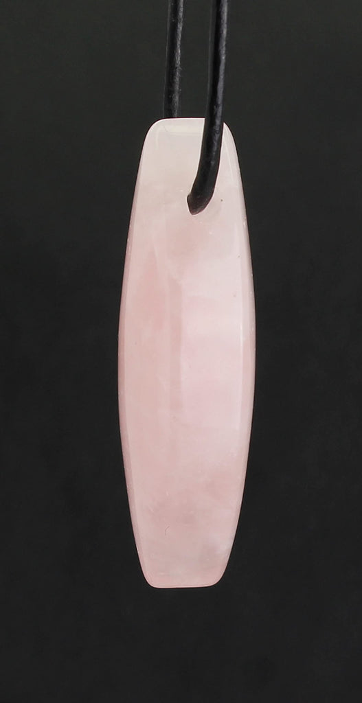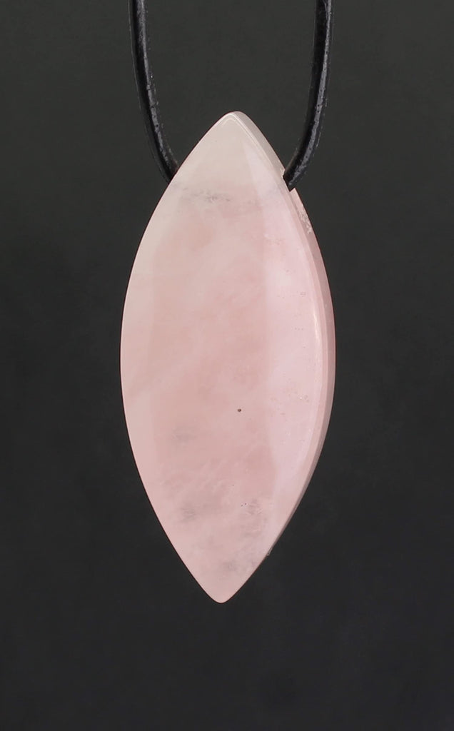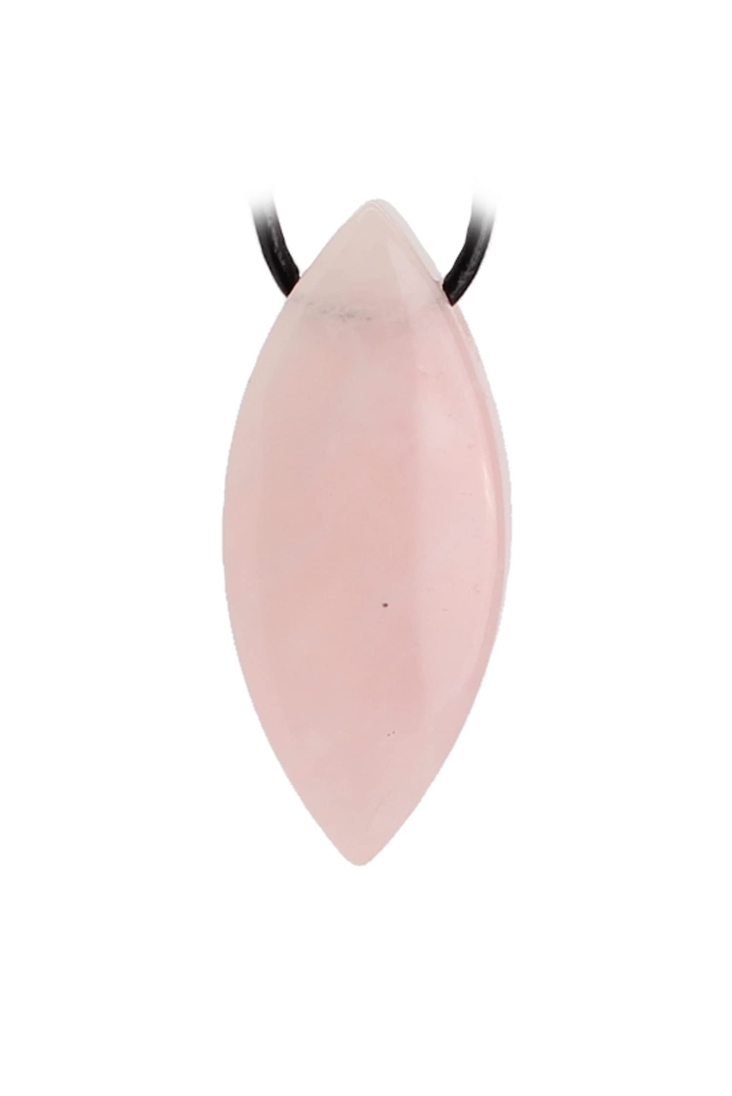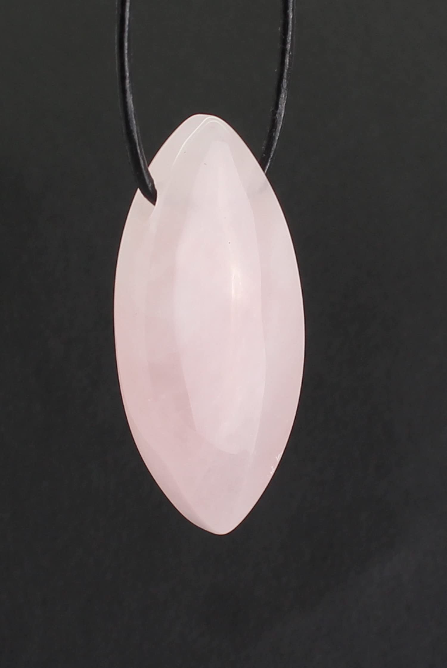 Rosenquarz Anhänger Navette gebohrt ca. 40 x 17 mm – Naturstein mit schwarzem Lederband zum Kürzen – handgeschliffen – Edelstein Schmuck – inkl. Organza Beutel