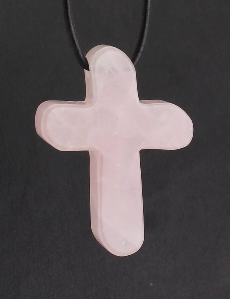 Rosenquarz Kreuz Anhänger gebohrt – Naturstein mit schwarzem Lederband zum Kürzen – handgeschliffen & spirituell – Schmuck für Damen & Herren – inkl. Organzasäckchen