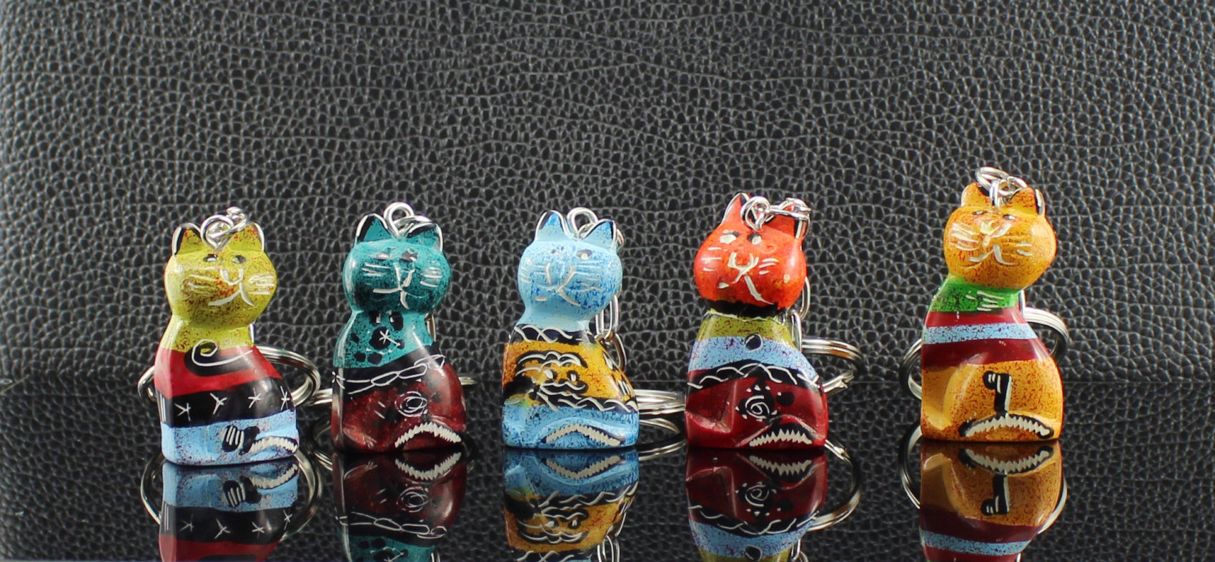 Dieser liebevoll handbemalte Schlüsselanhänger aus Speckstein zeigt eine kleine Katze in dekorativer, kompakter Größe von ca. 35 × 20 mm. Jede Figur wird einzeln bemalt und erhält dadurch ihren ganz eigenen Ausdruck – von den Augen bis zur Musterung ist jedes Stück ein echtes Unikat.
