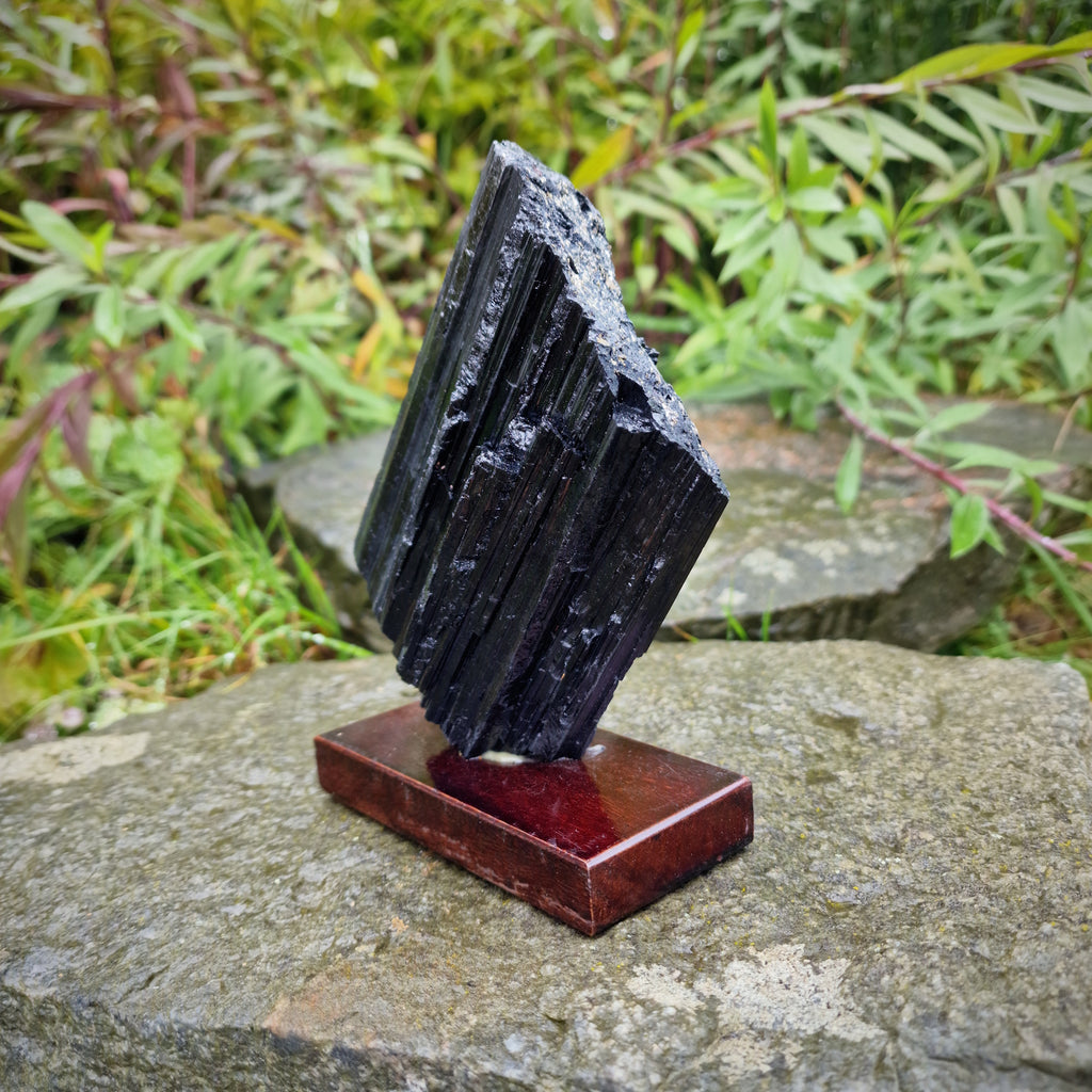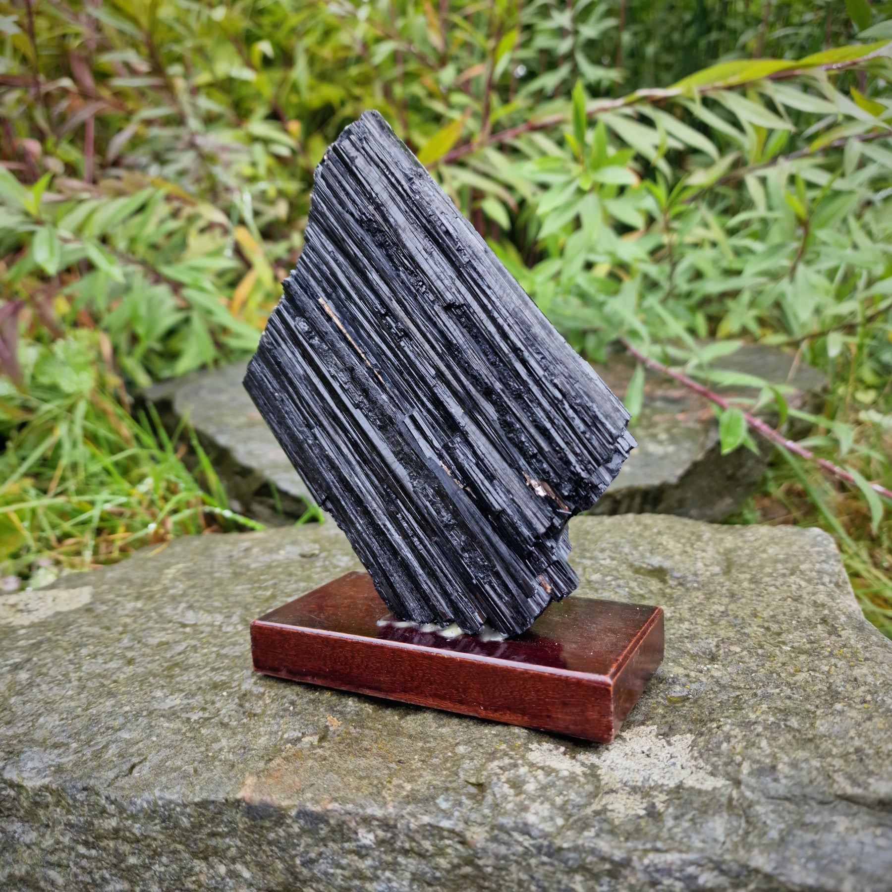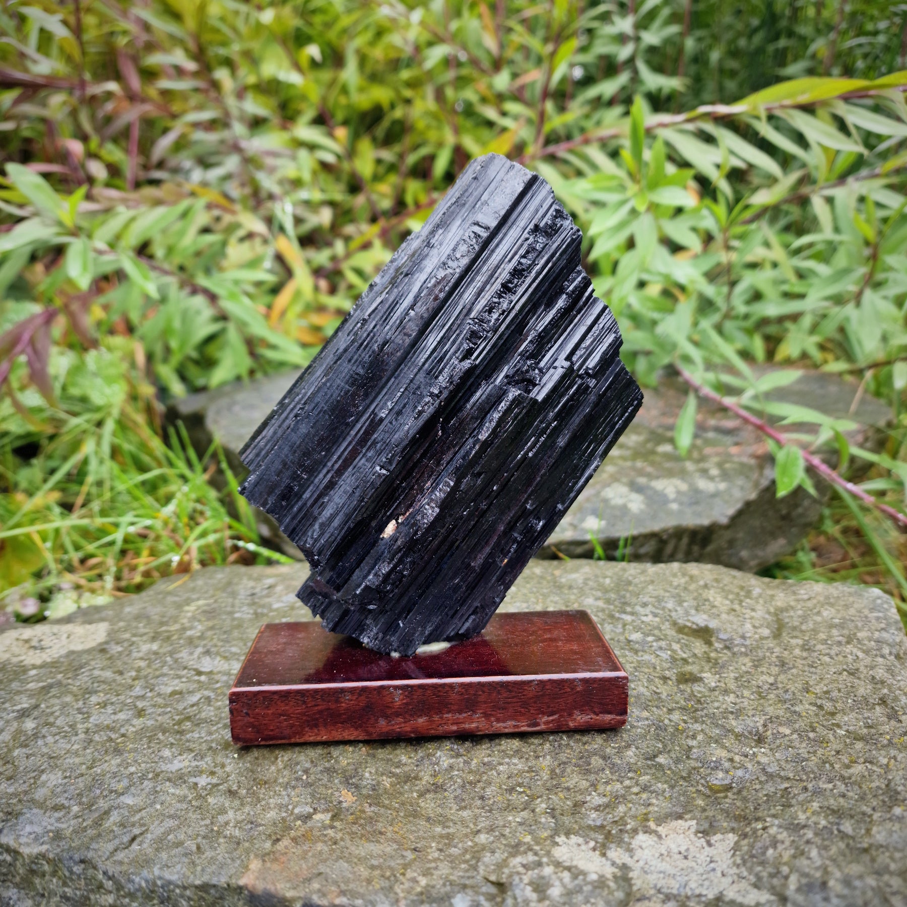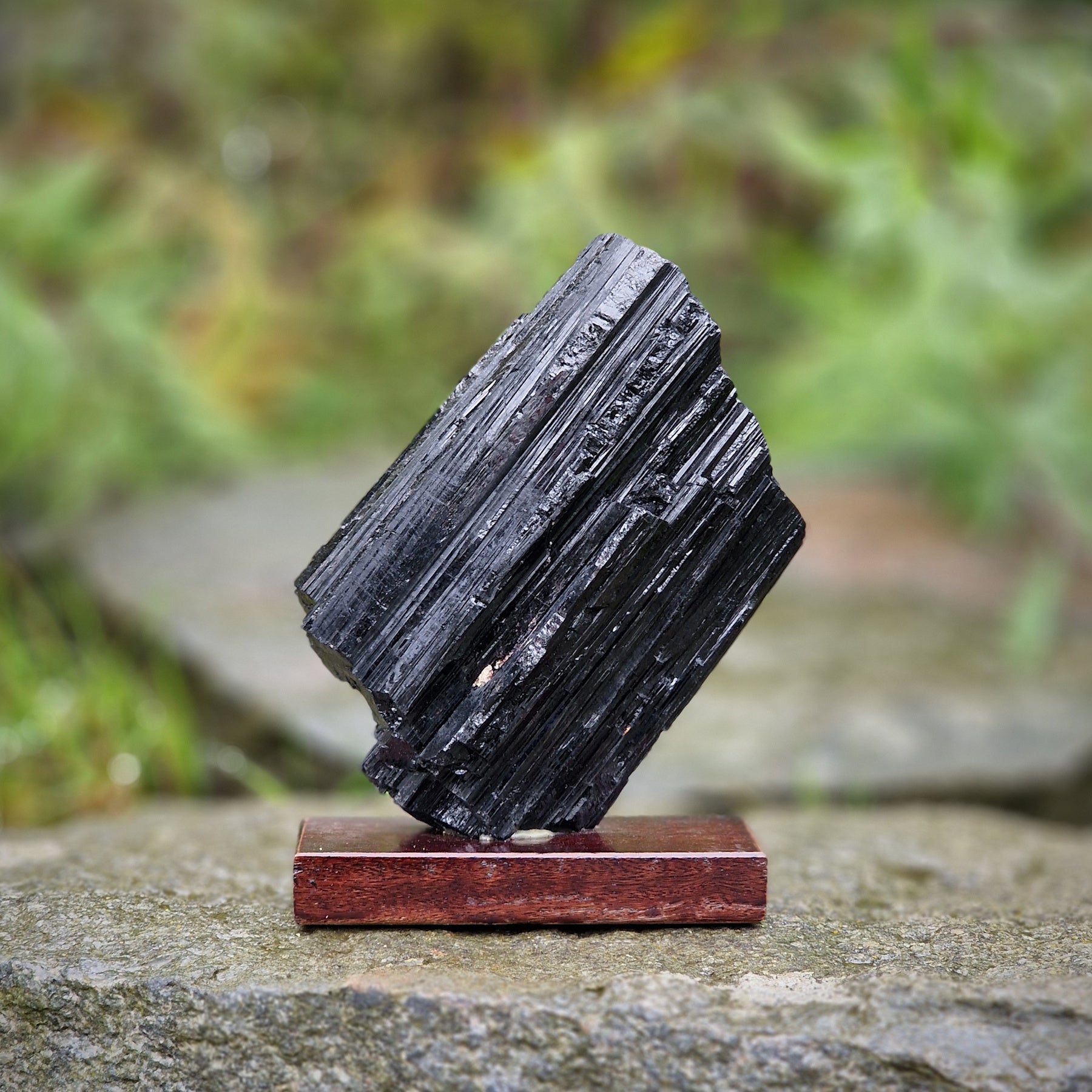 Schwarzer Turmalin Rohstein auf Holzsockel Schörl Rohstück Brocken naturbelassen