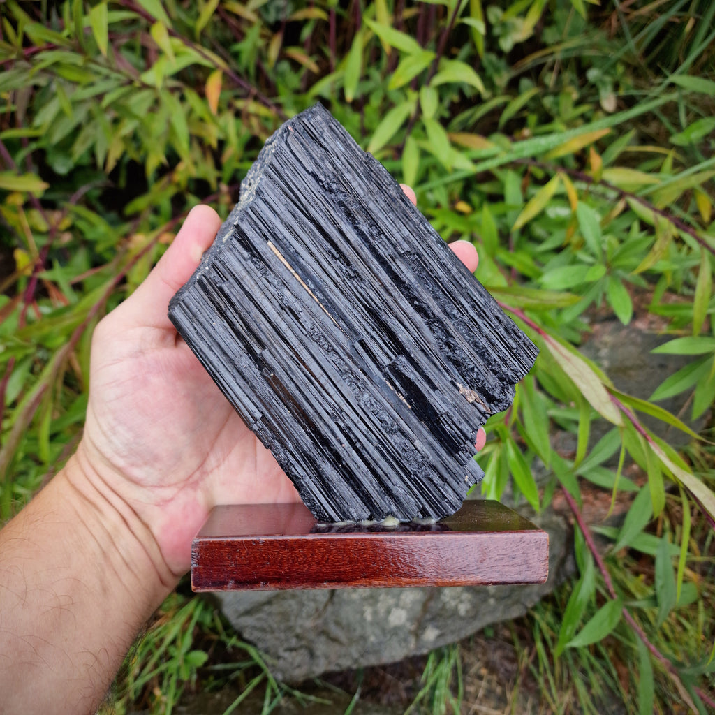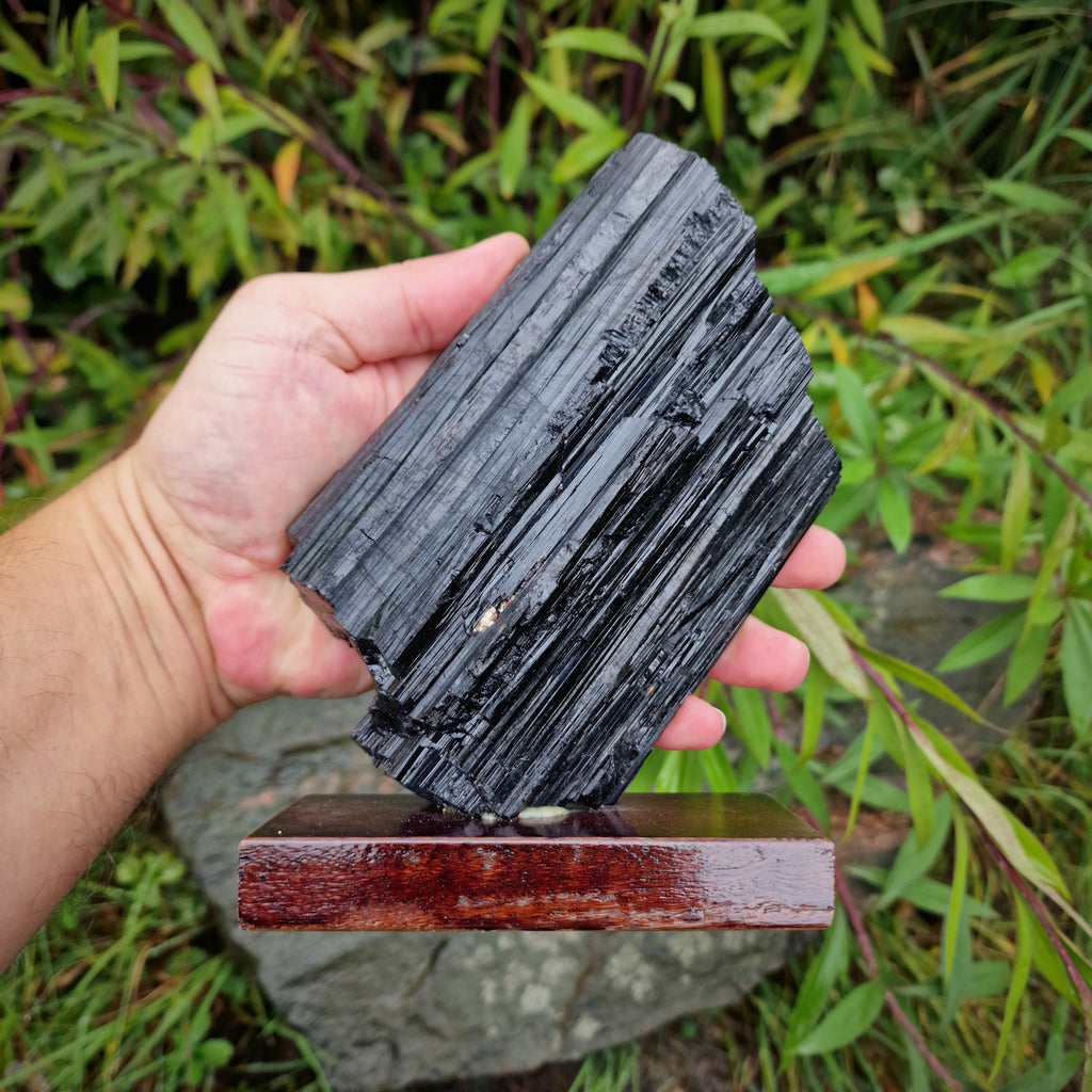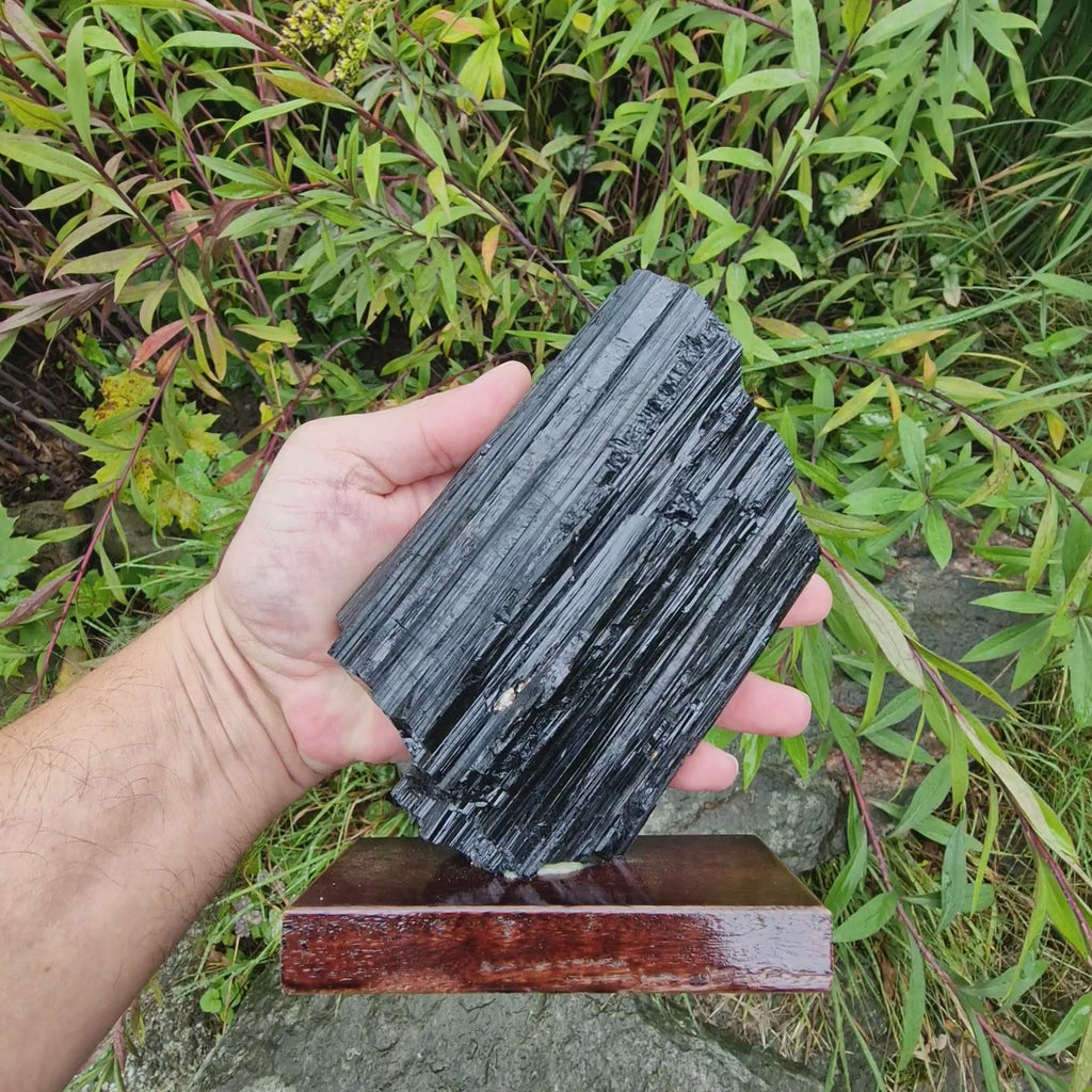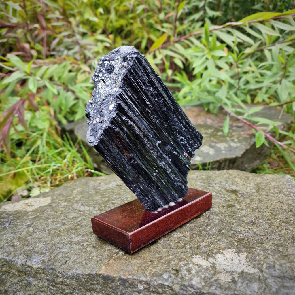 Schwarzer Turmalin Rohstein auf Holzsockel Schörl Rohstück Brocken naturbelassen